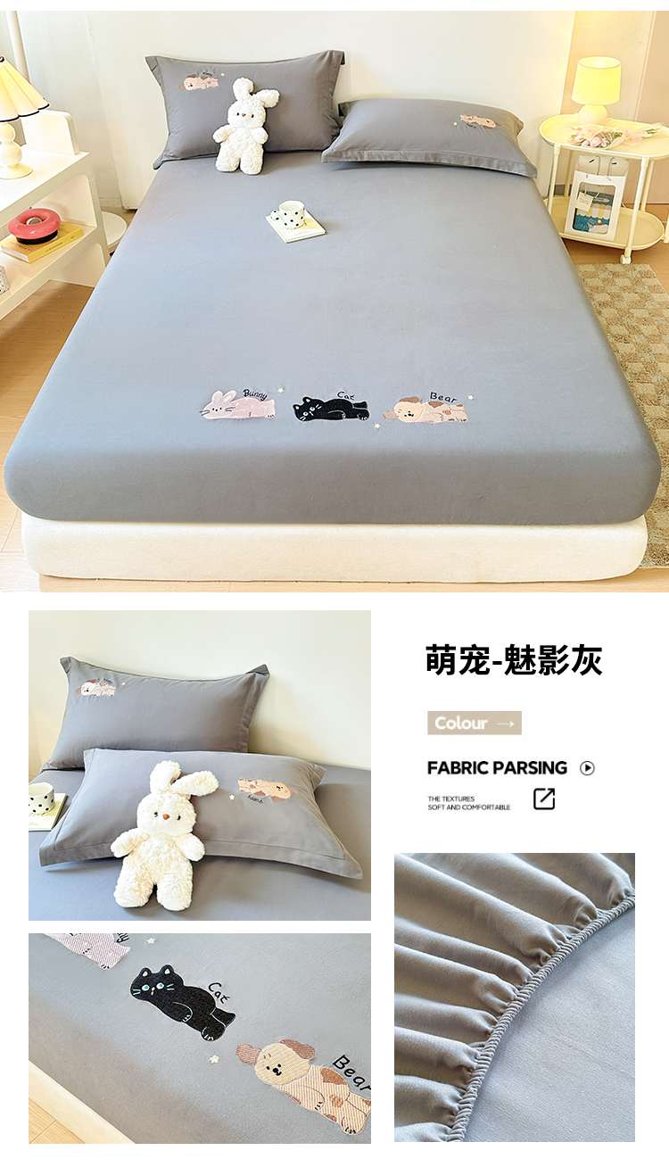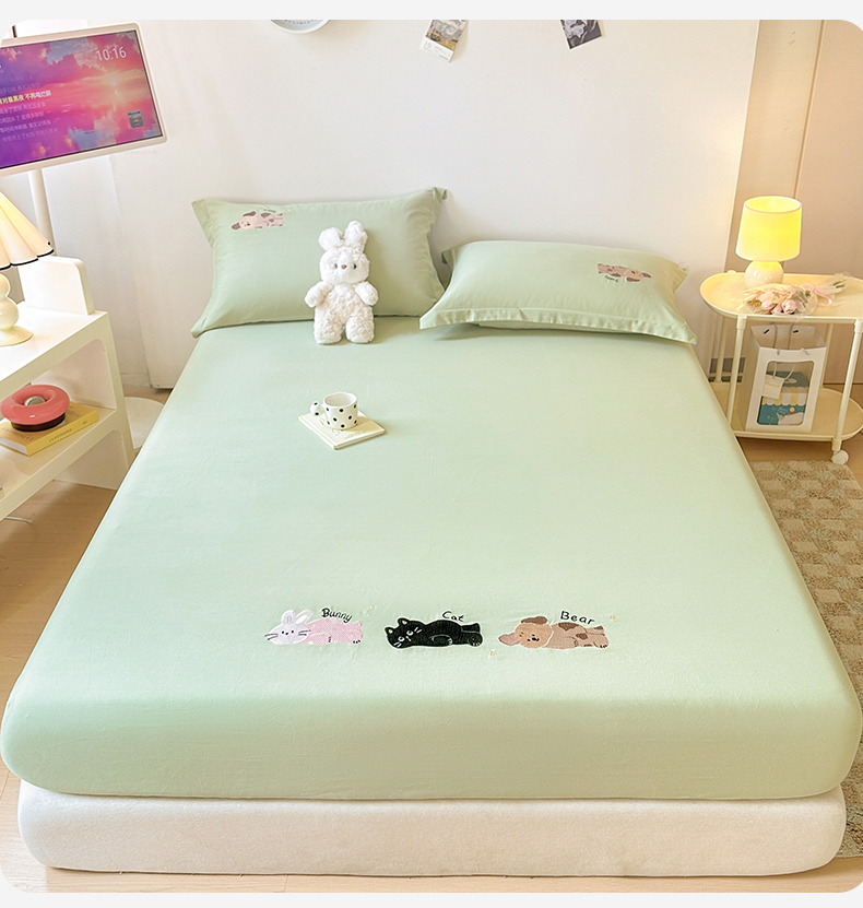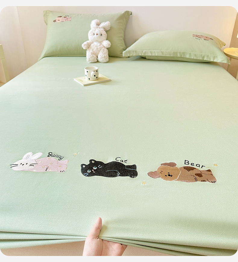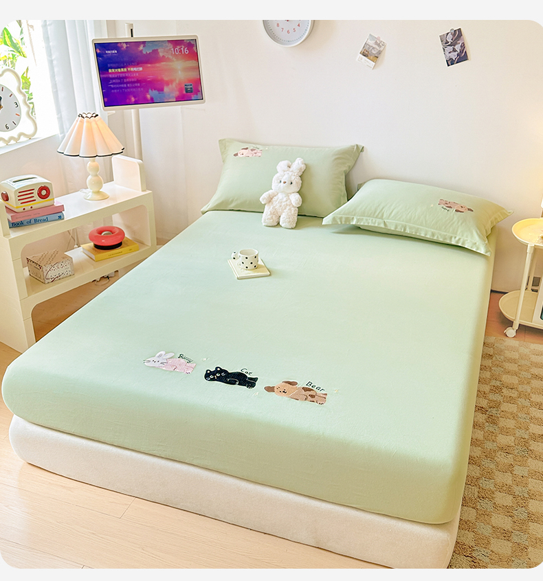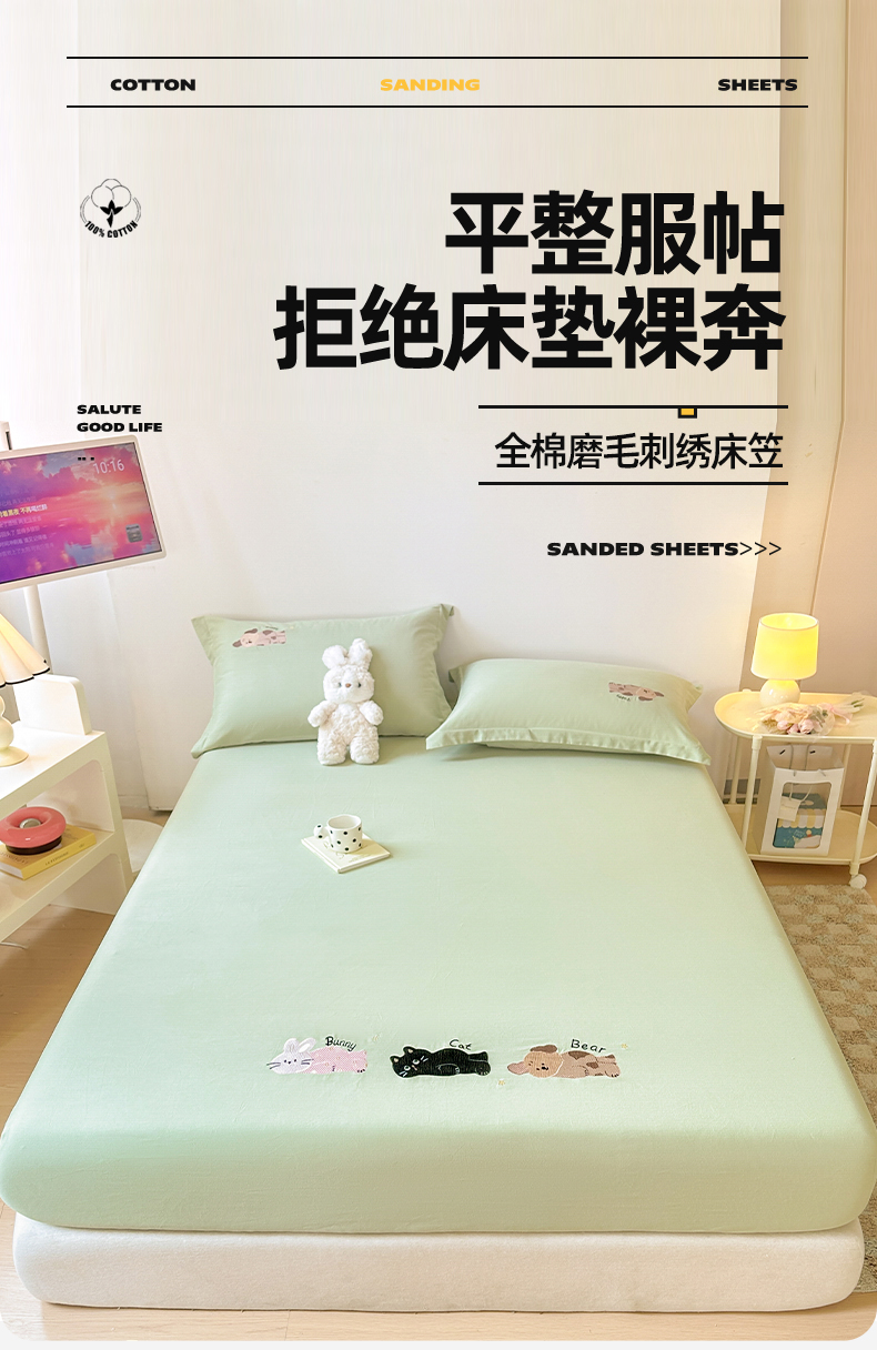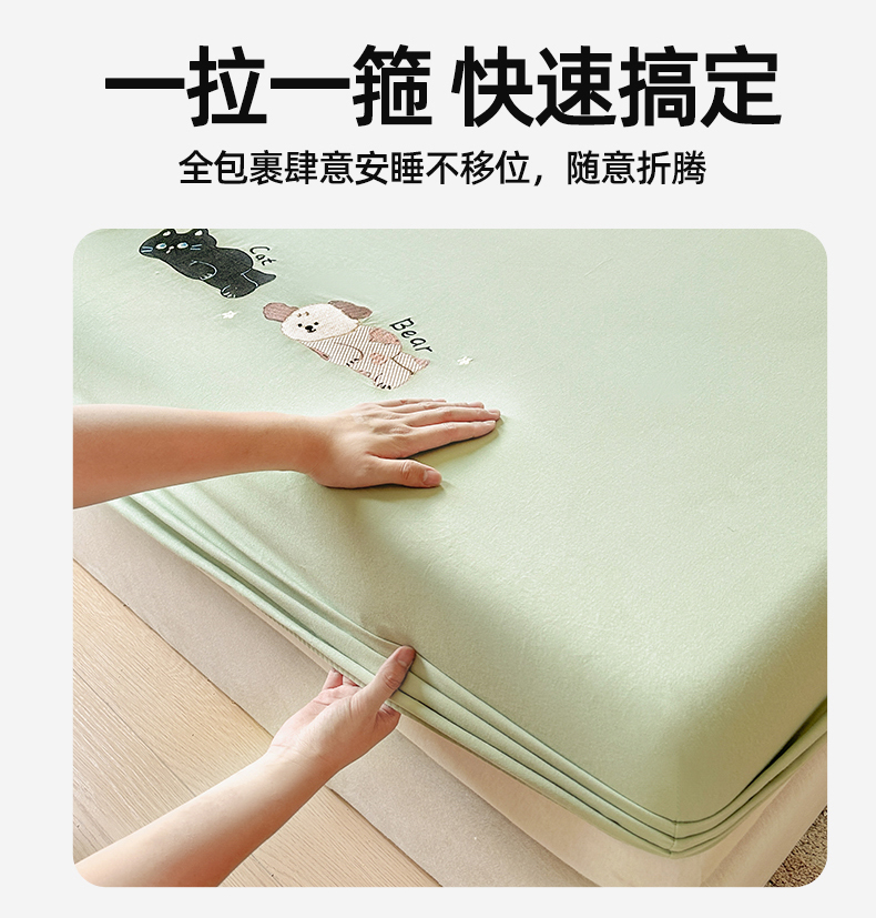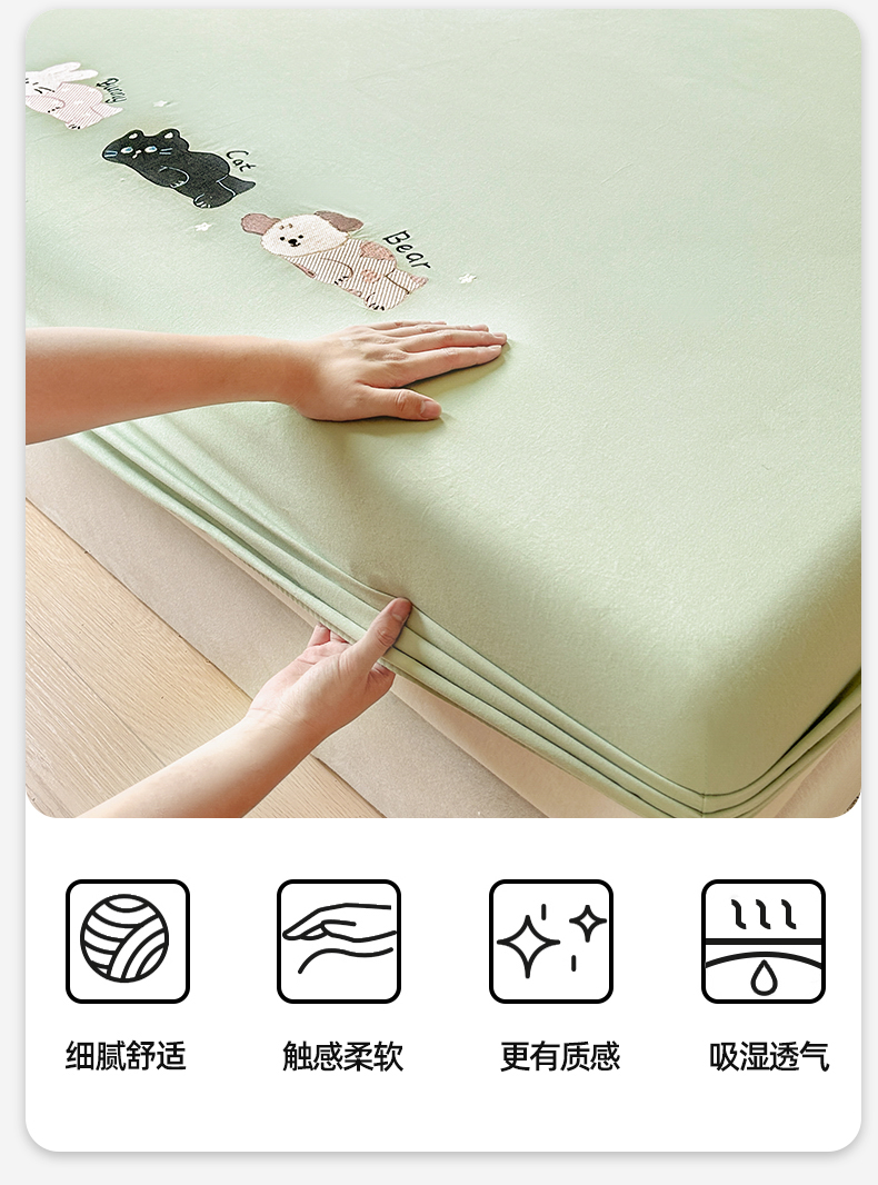 笙意家纺 2025新款全棉纯棉磨毛刺绣单品床笠 床笠单件 萌宠-春野绿