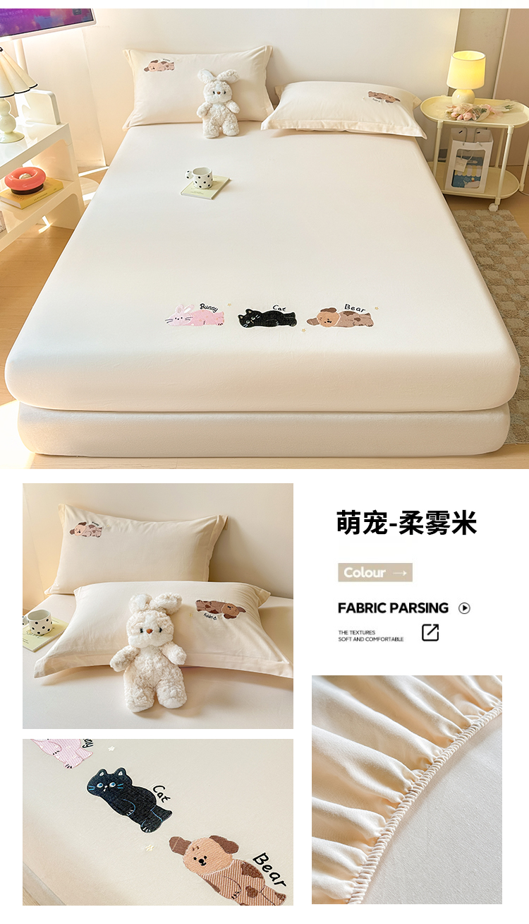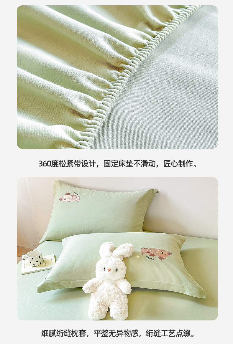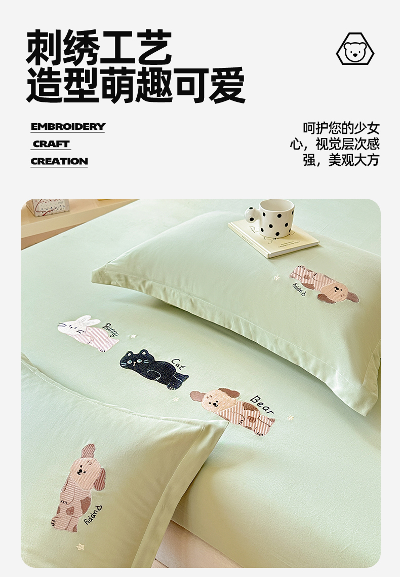 商品名称:笙意家纺 2025新款全棉纯棉磨毛刺绣单品床笠 床笠单件 萌宠-春野绿