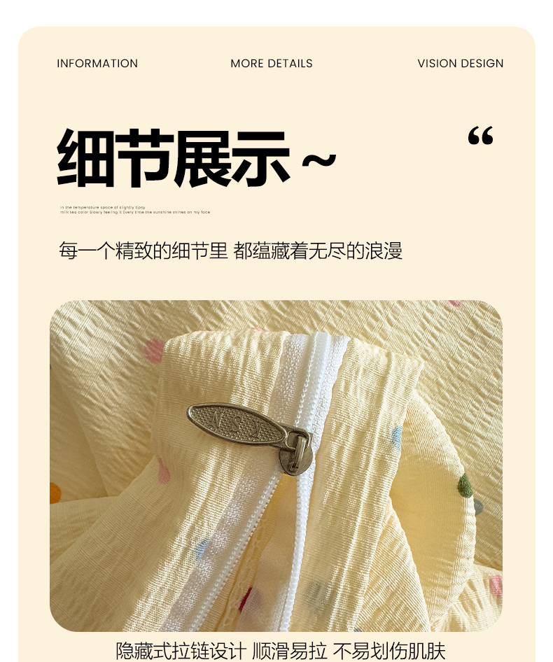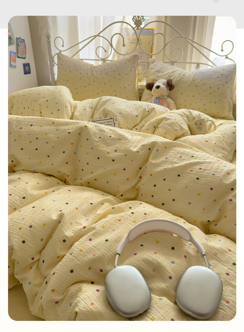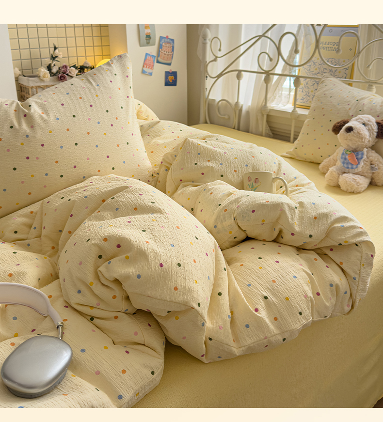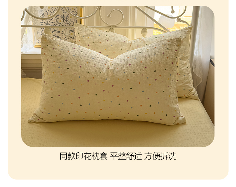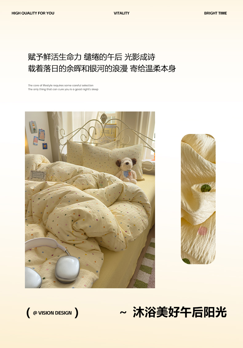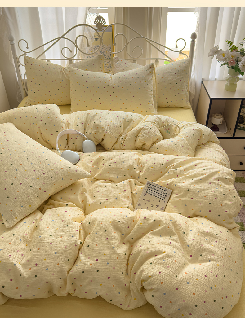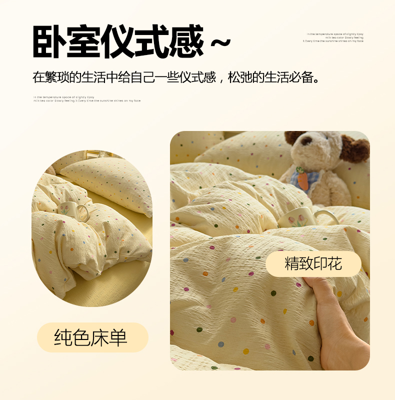 当前位置: 91家纺网 > 商品网购 > 床品套件 > 四件套 > 双层纱四件套 > 卡斯诺家纺馆 2025新款A类皱皱棉双层纱印花四件套 奶油波点