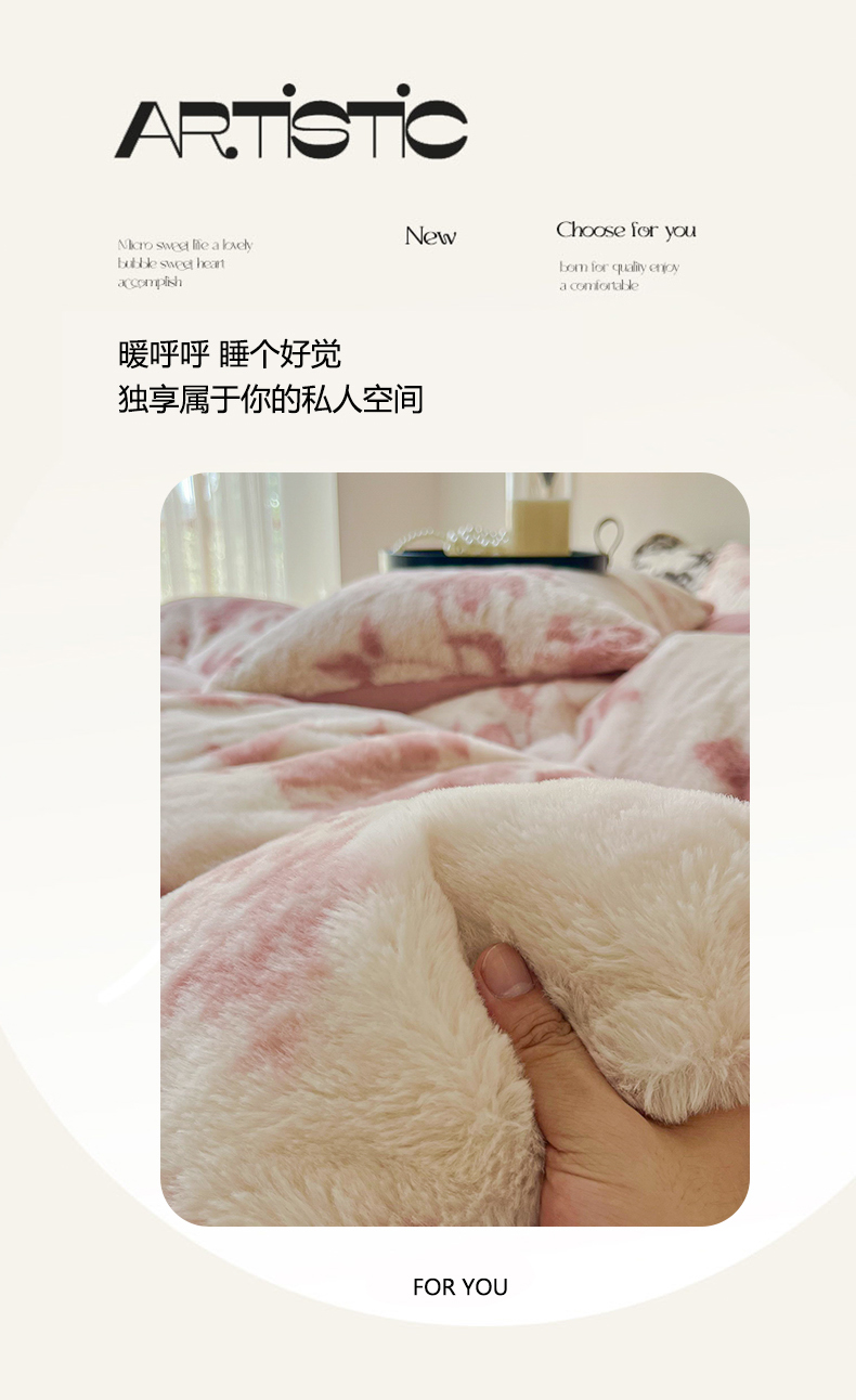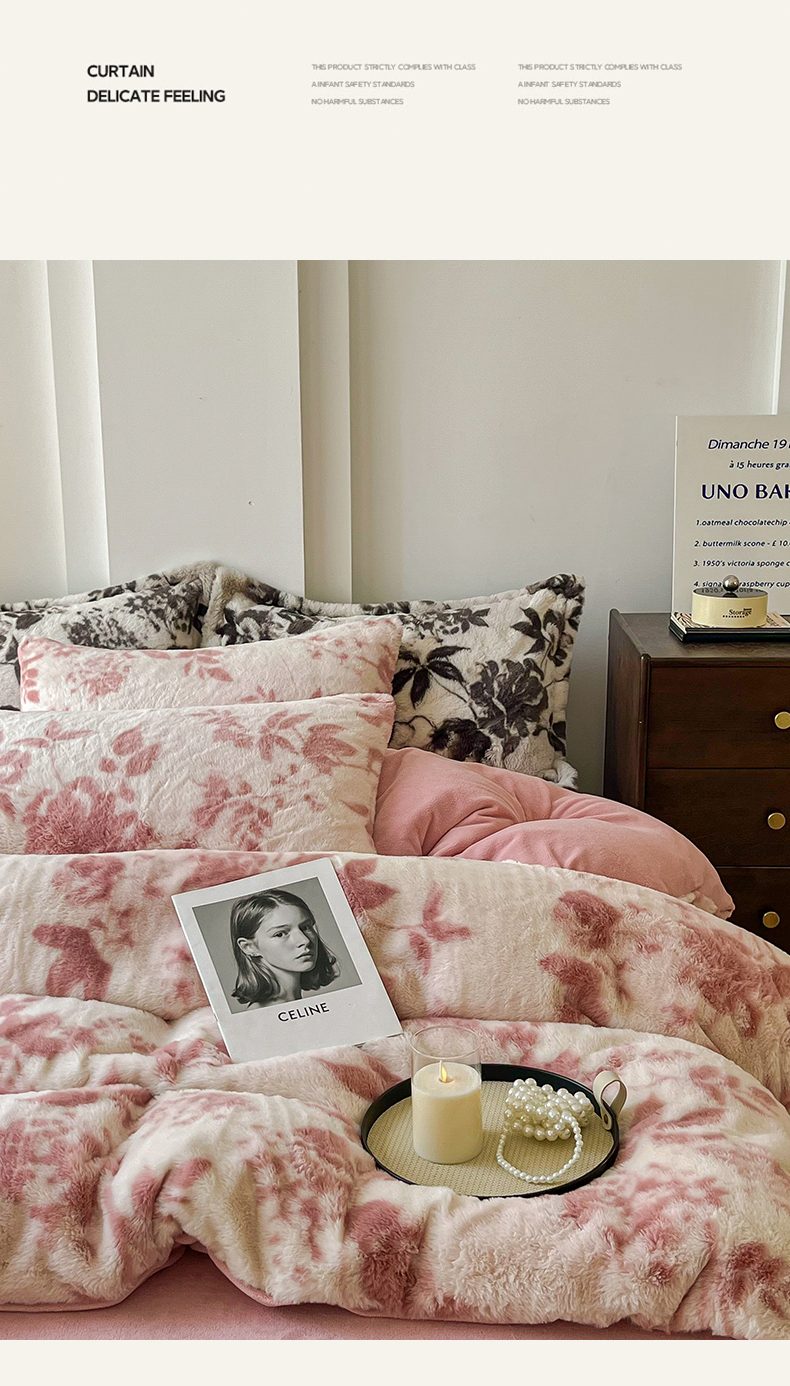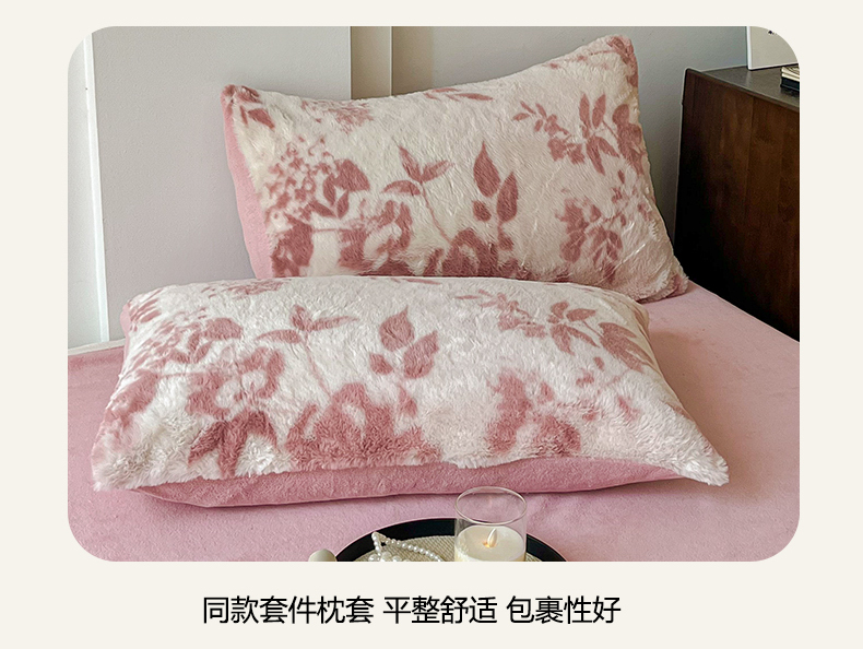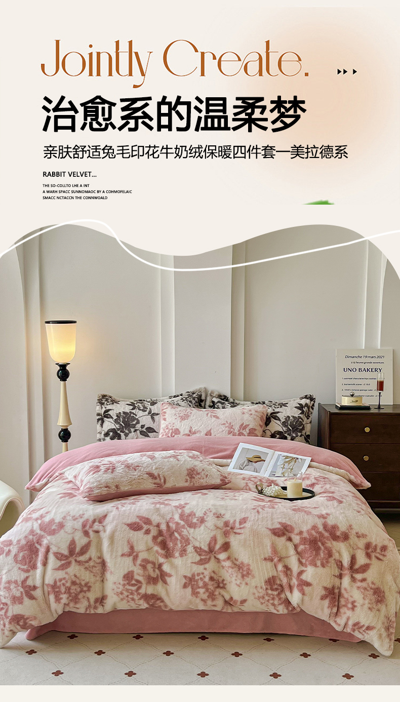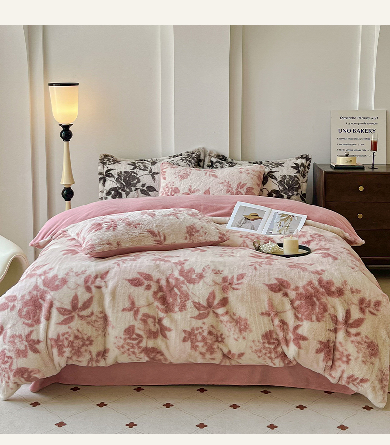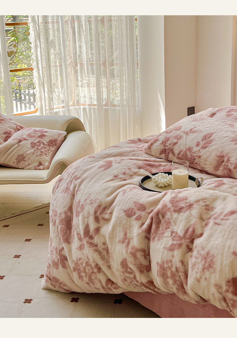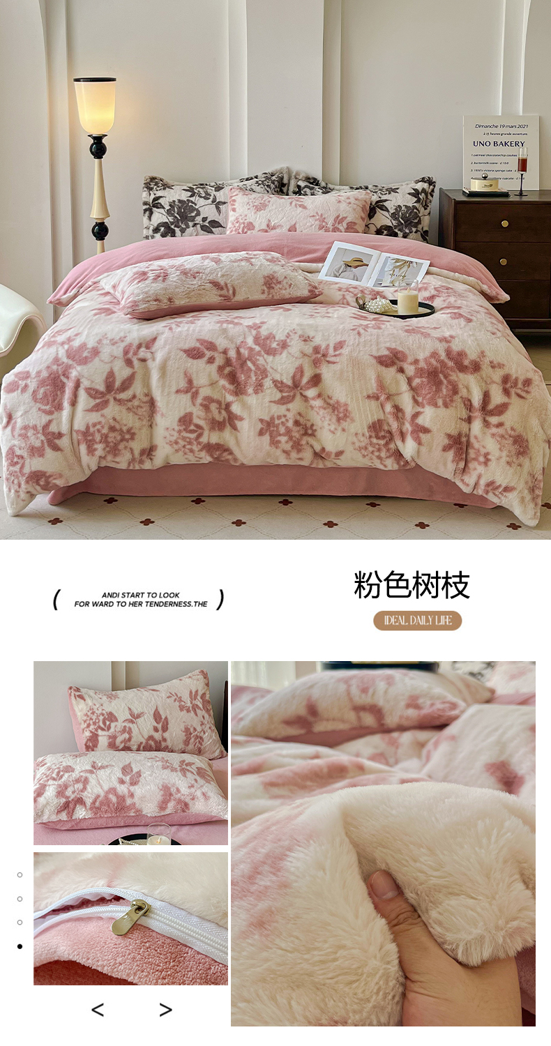 商品名称:梦纤绒 2025新款亲肤舒适兔毛印花牛奶绒保暖四件套一美拉德系 粉色树枝