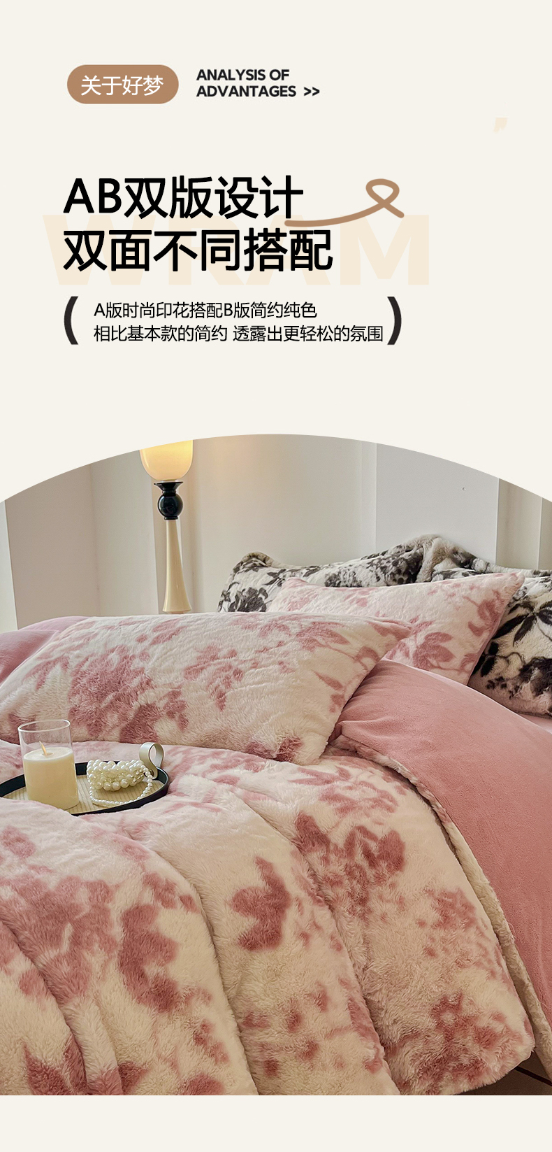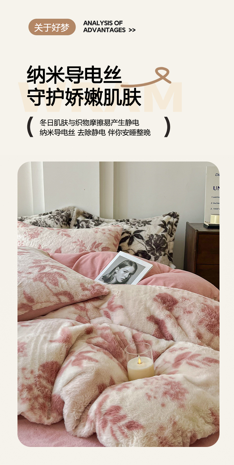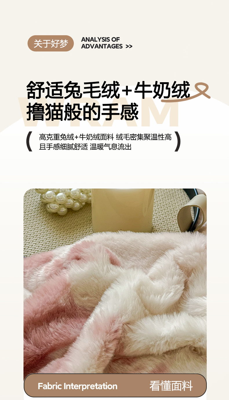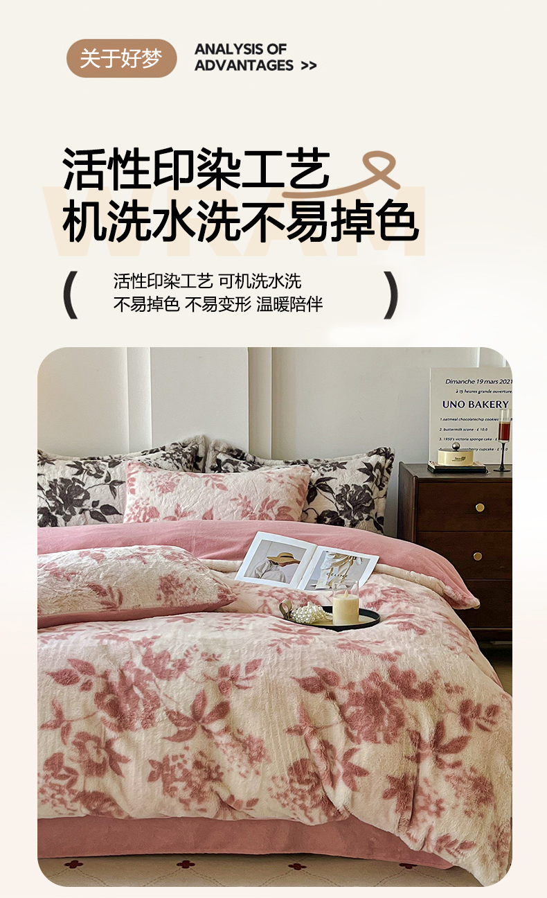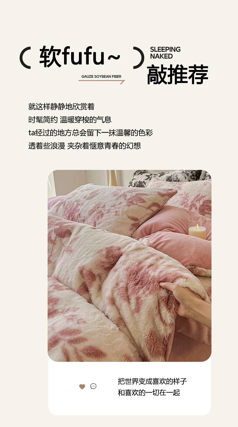 商品名称:梦纤绒 2025新款亲肤舒适兔毛印花牛奶绒保暖四件套一美拉德系 粉色树枝
