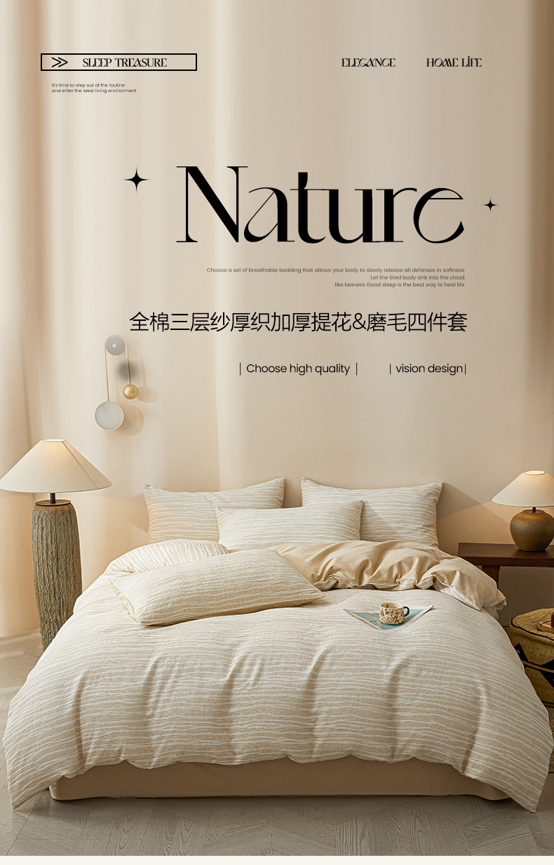 莱茵家居 2025新款全棉三层纱厚织提花磨毛四件套 漫叙-卡其