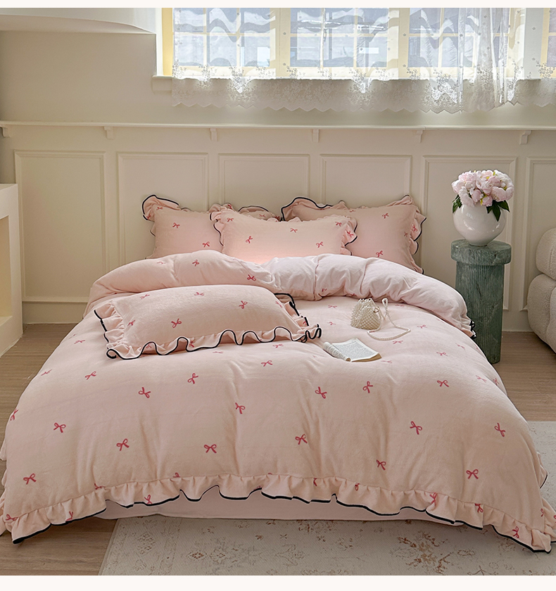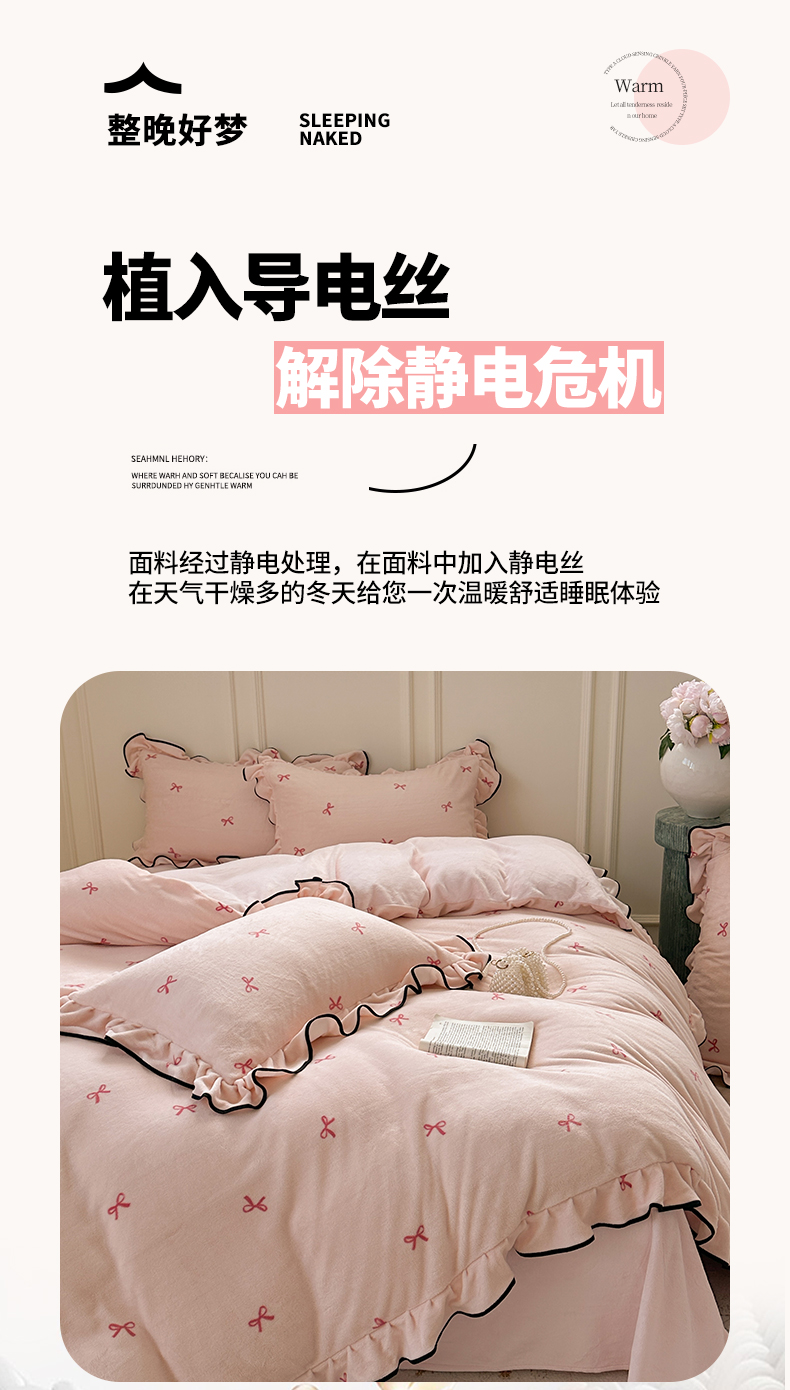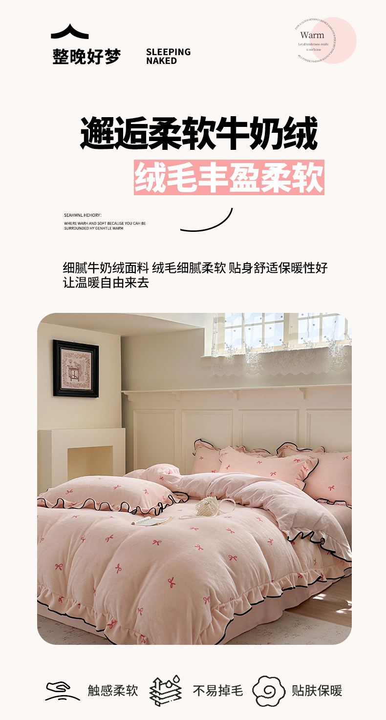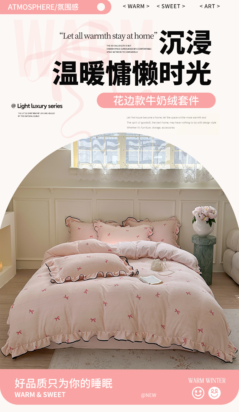 当前位置: 91家纺网 > 商品网购 > 床品套件 > 四件套 > 牛奶绒四件套 > 优悦生活馆 2025新款花边款牛奶绒四件套-芙然 芙然-紫