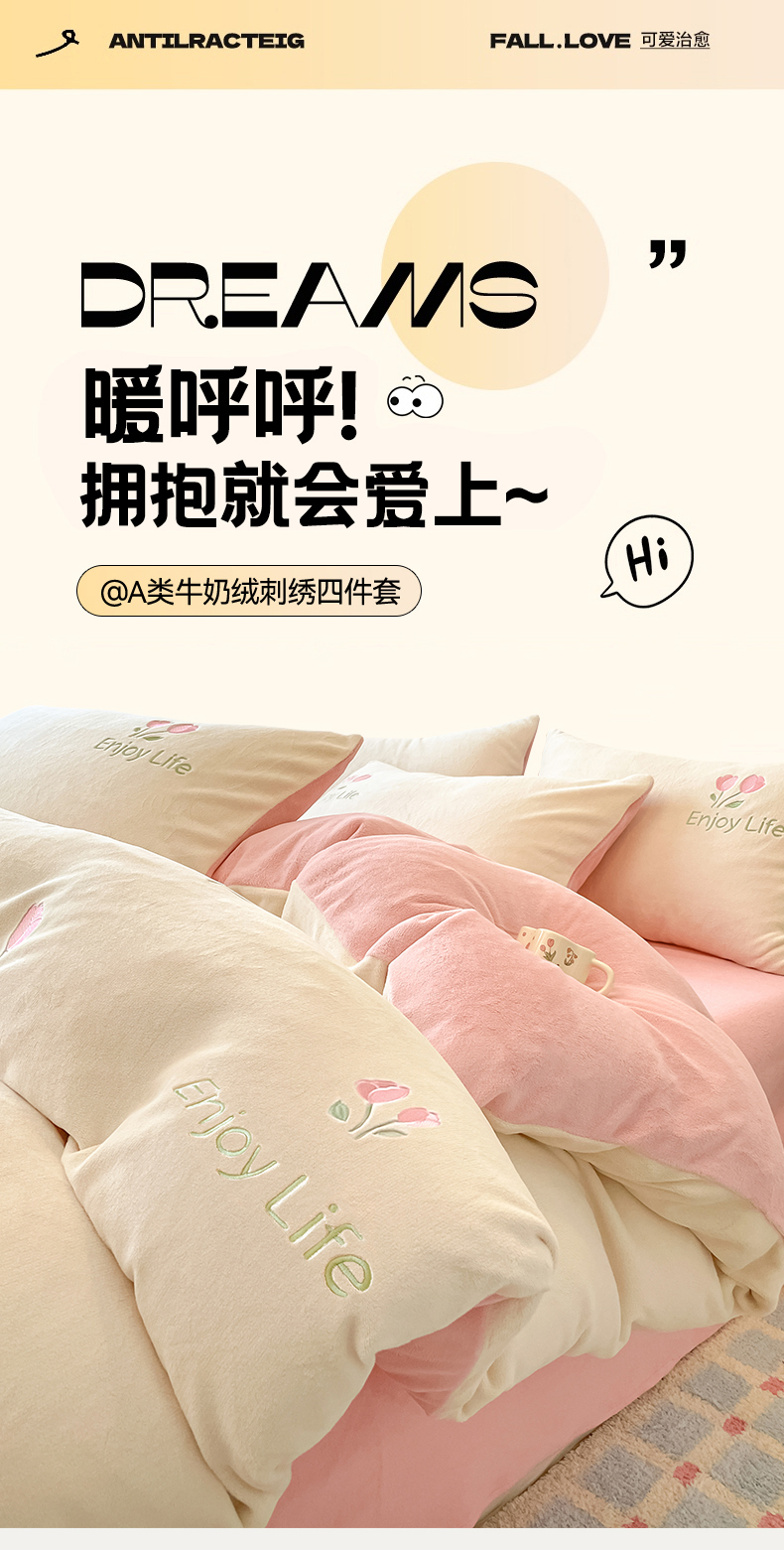(总)美澳家纺 2025新款刺绣ins小清新高克重牛奶绒四件套床笠款四件套,草莓-奶白,草莓-粉玉,小熊-蓝,小熊-奶白,郁金香-奶白,郁金香-紫