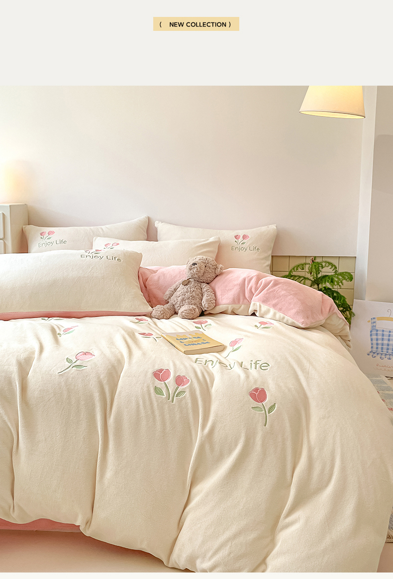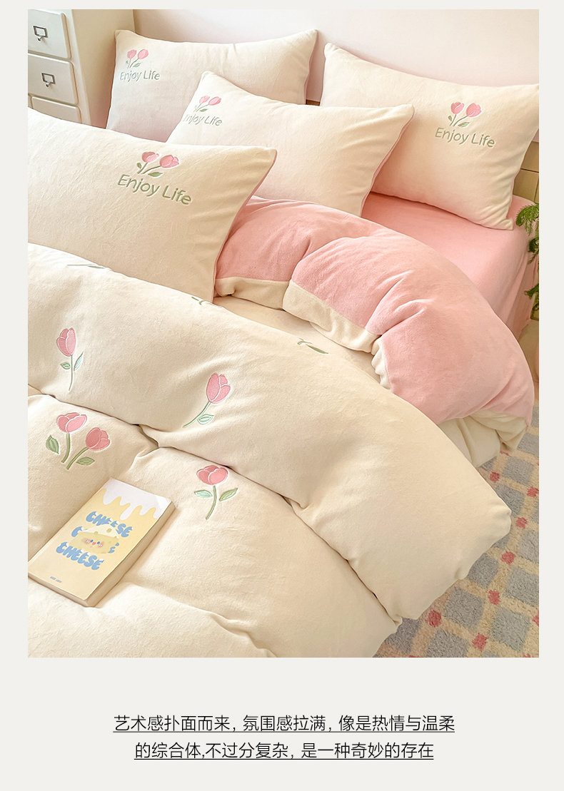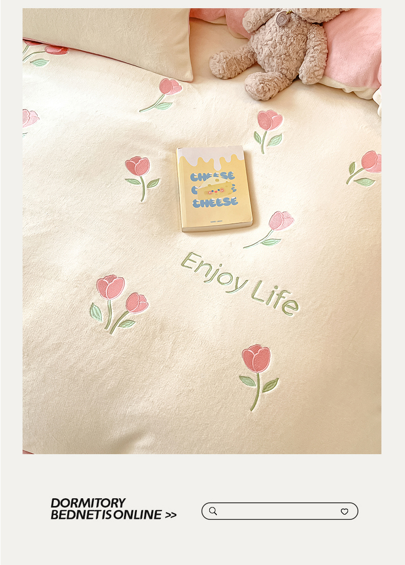 商品名称:美澳家纺 2025新款刺绣ins小清新高克重牛奶绒四件套床笠款四件套 郁金香-奶白