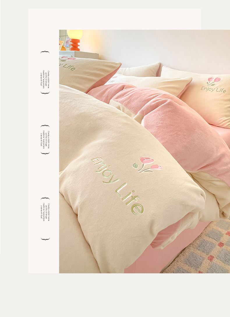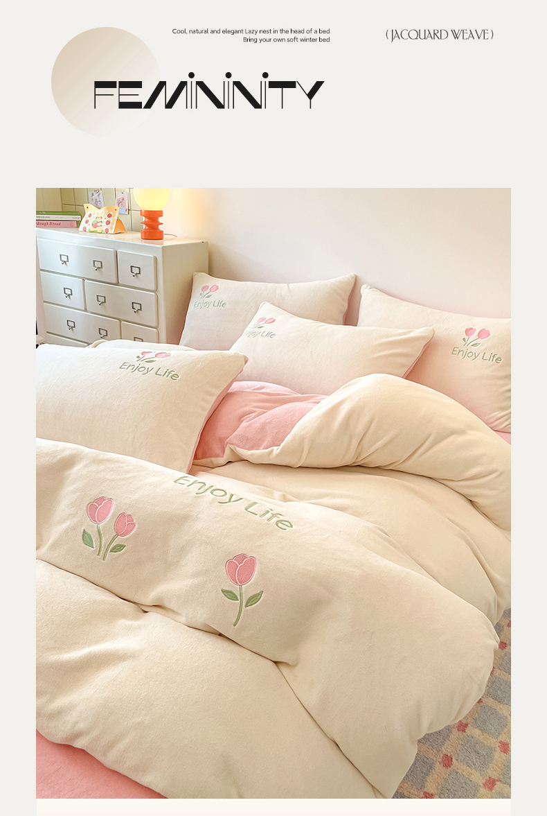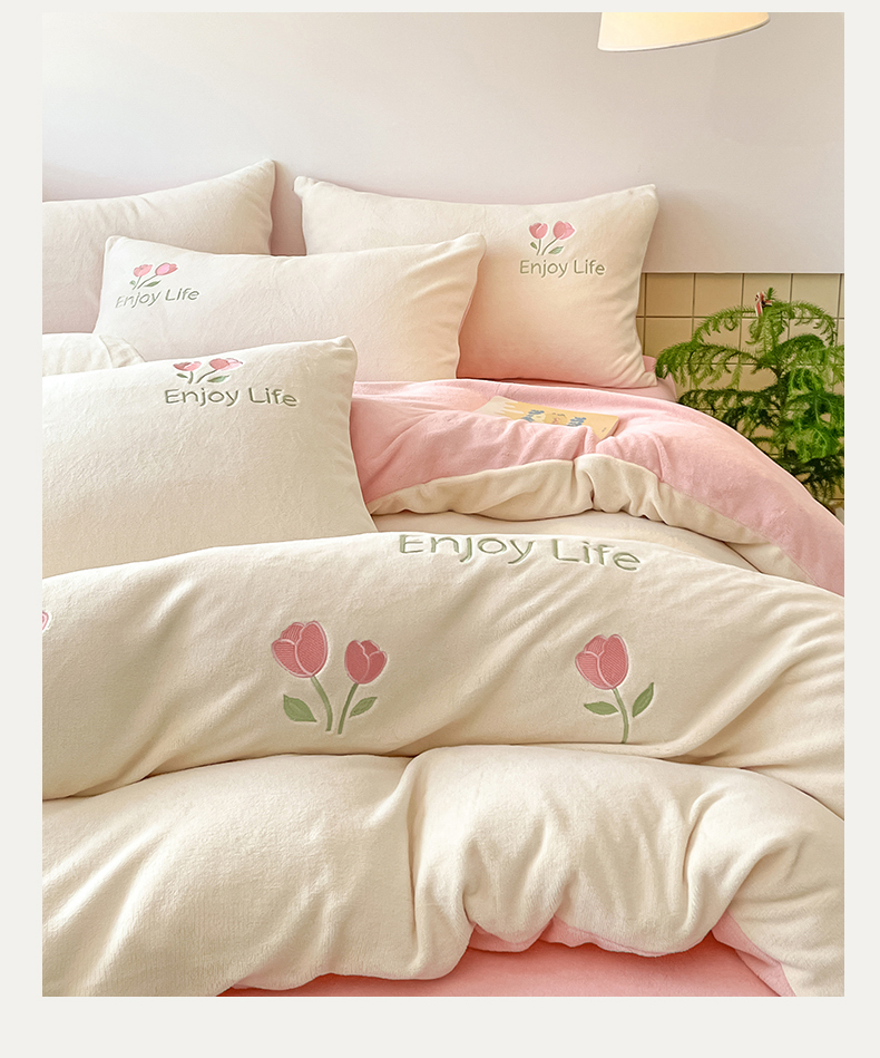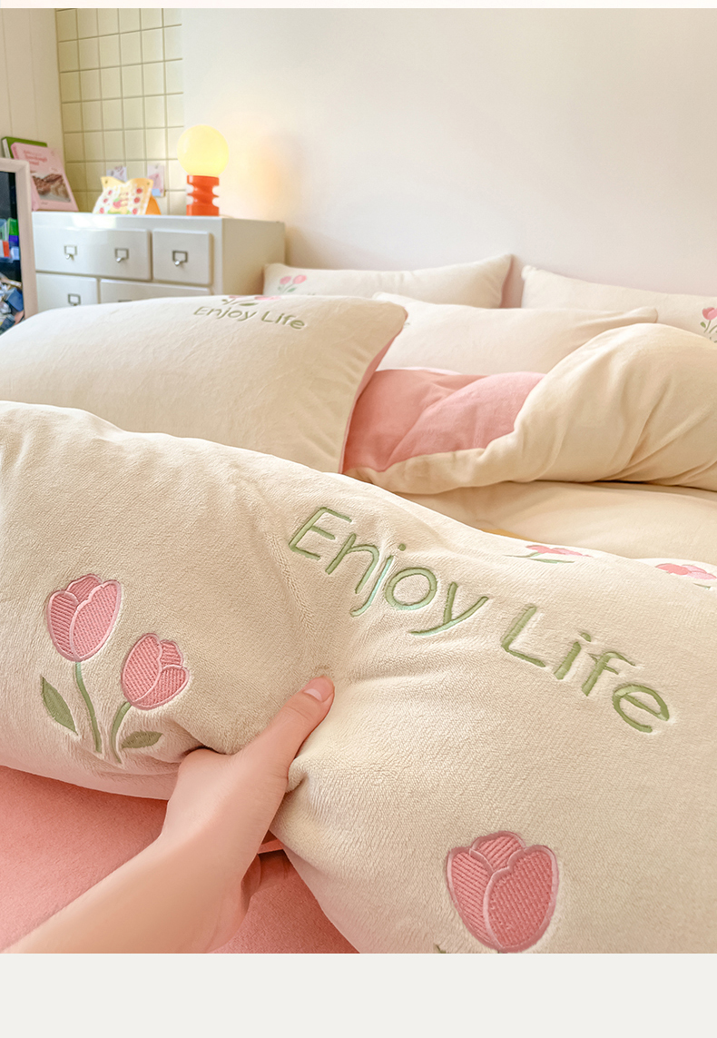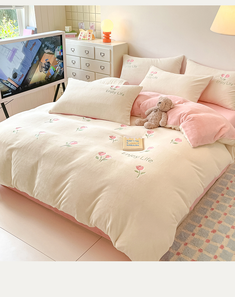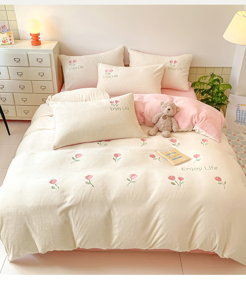 美澳家纺 2025新款刺绣ins小清新高克重牛奶绒四件套床笠款四件套 郁金香-奶白