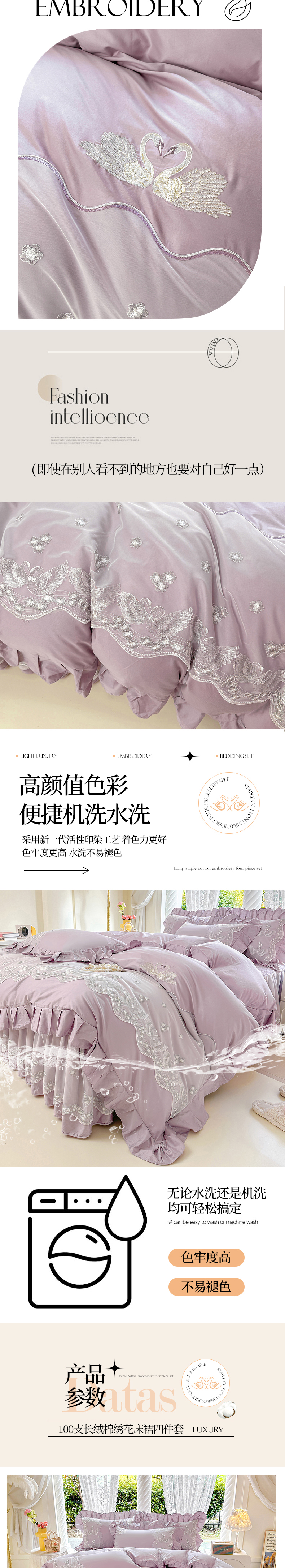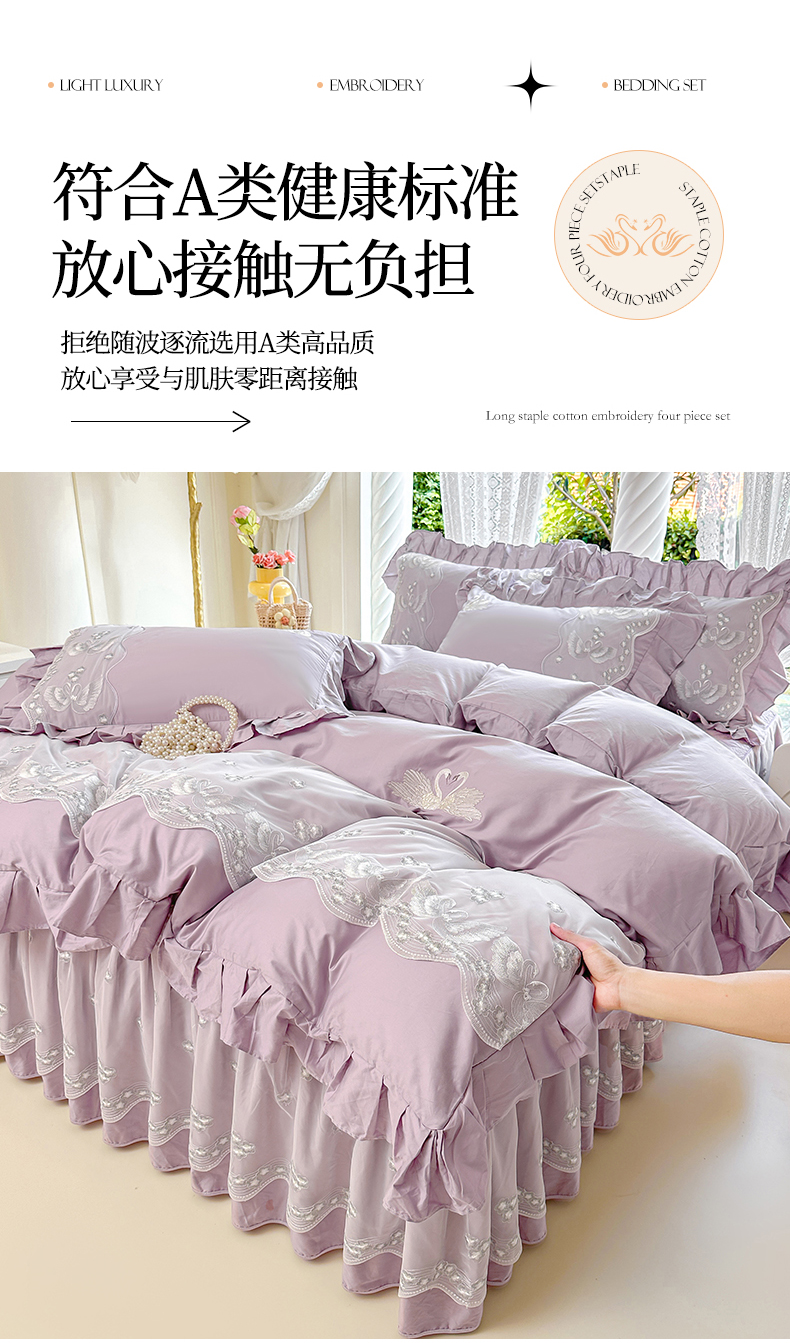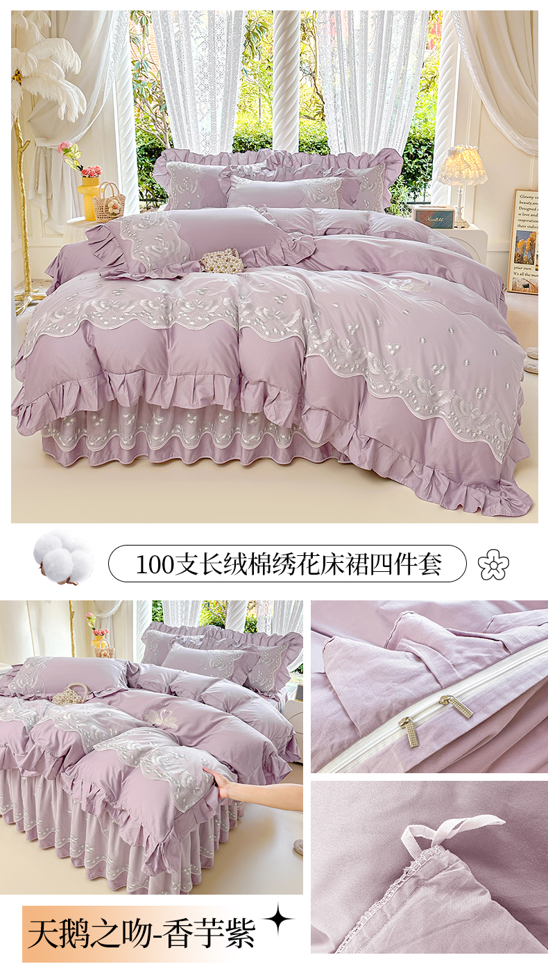 当前位置: 91家纺网 > 商品网购 > 床品套件 > 四件套 > 其它四件套 > 宜凡家纺 2025新款长绒棉绣花夹棉床裙四件套--天鹅之吻系列 天鹅之吻-香芋紫