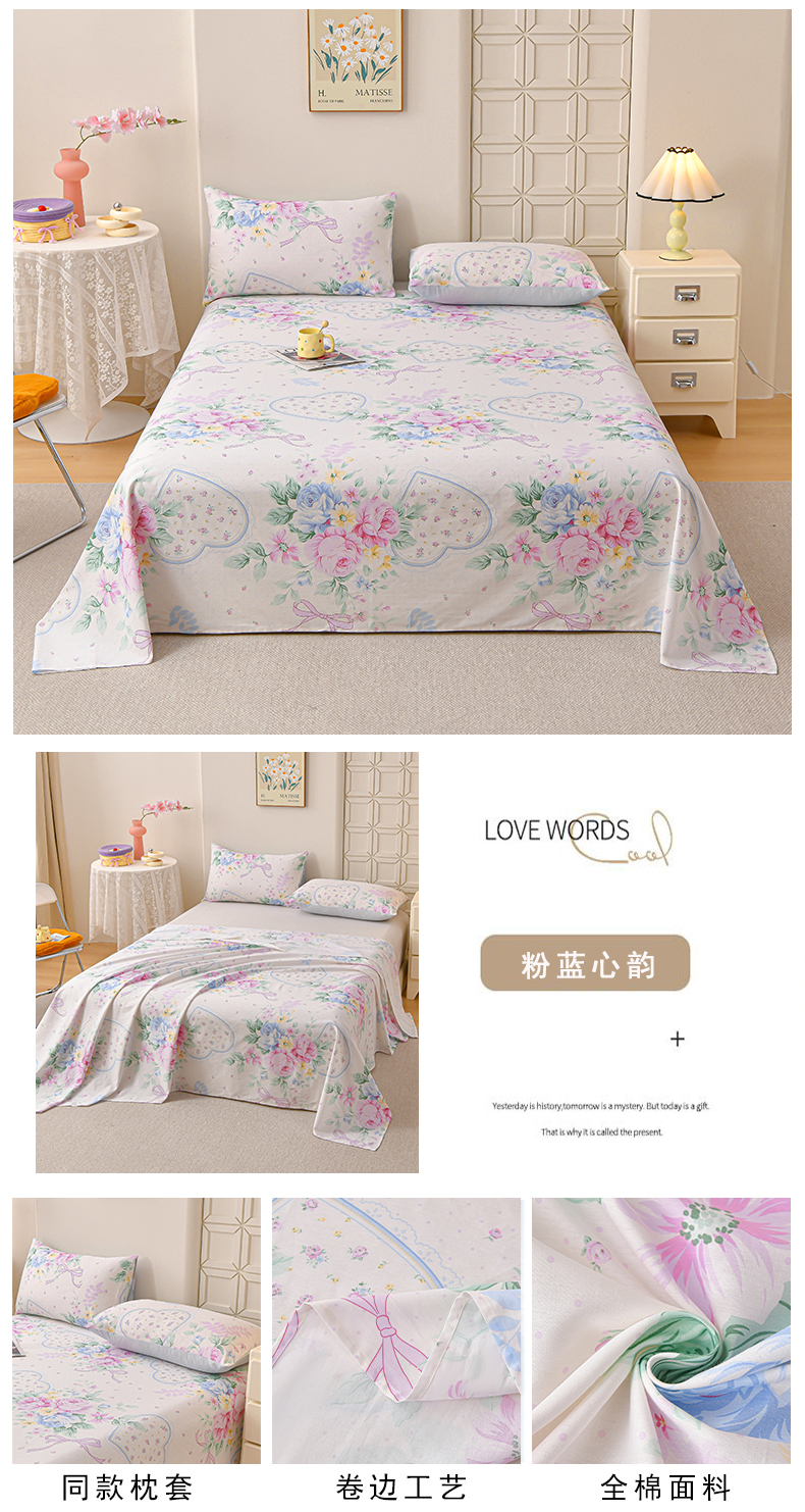 商品名称:宇彬家纺 2025直播新款13070全棉纯棉印花双人单床单枕套三件套喷气小清新简约学生被单 粉蓝心韵