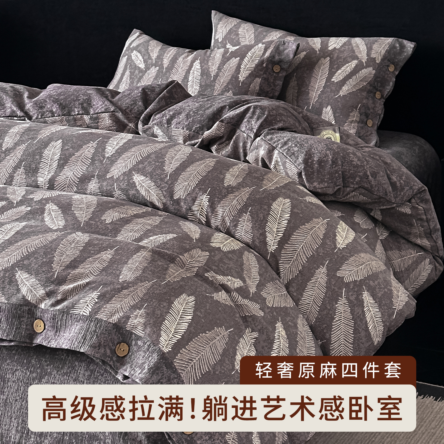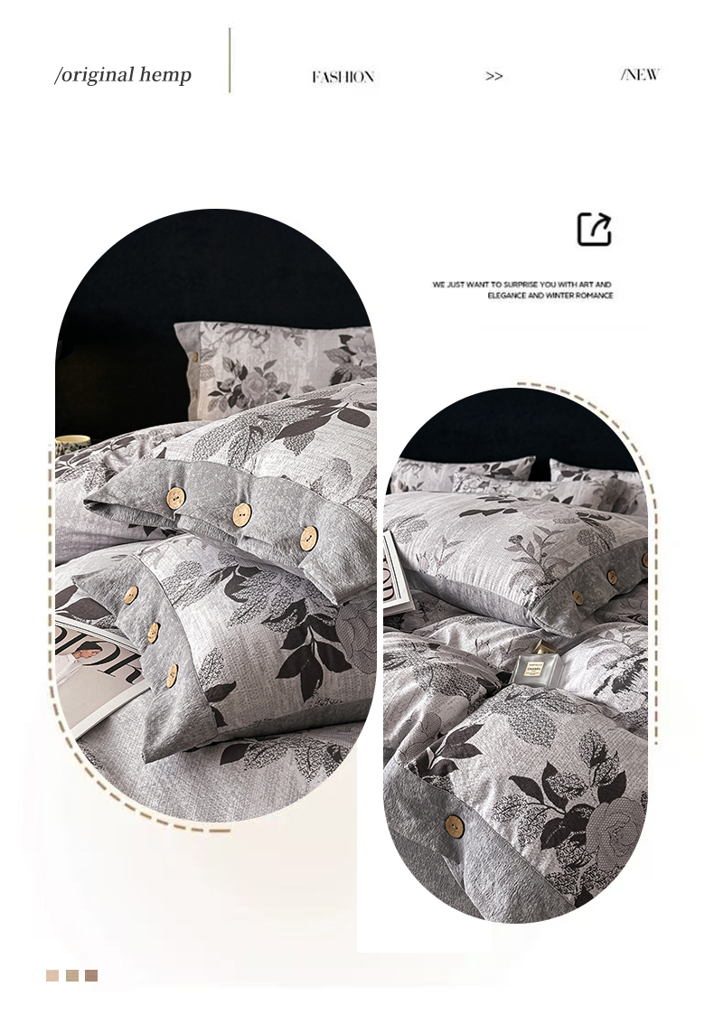 当前位置: 91家纺网 > 商品网购 > 床品套件 > 四件套 > 全棉普通四件套 > 悦织湾家纺 2025新款纽扣款轻奢原麻四件套复古中式艺术雅致轻奢床上用品三四件套 轻奢原麻-相思-灰