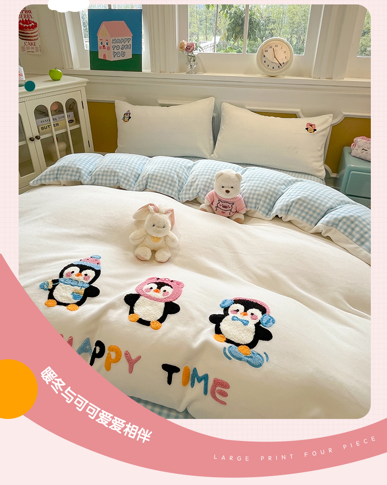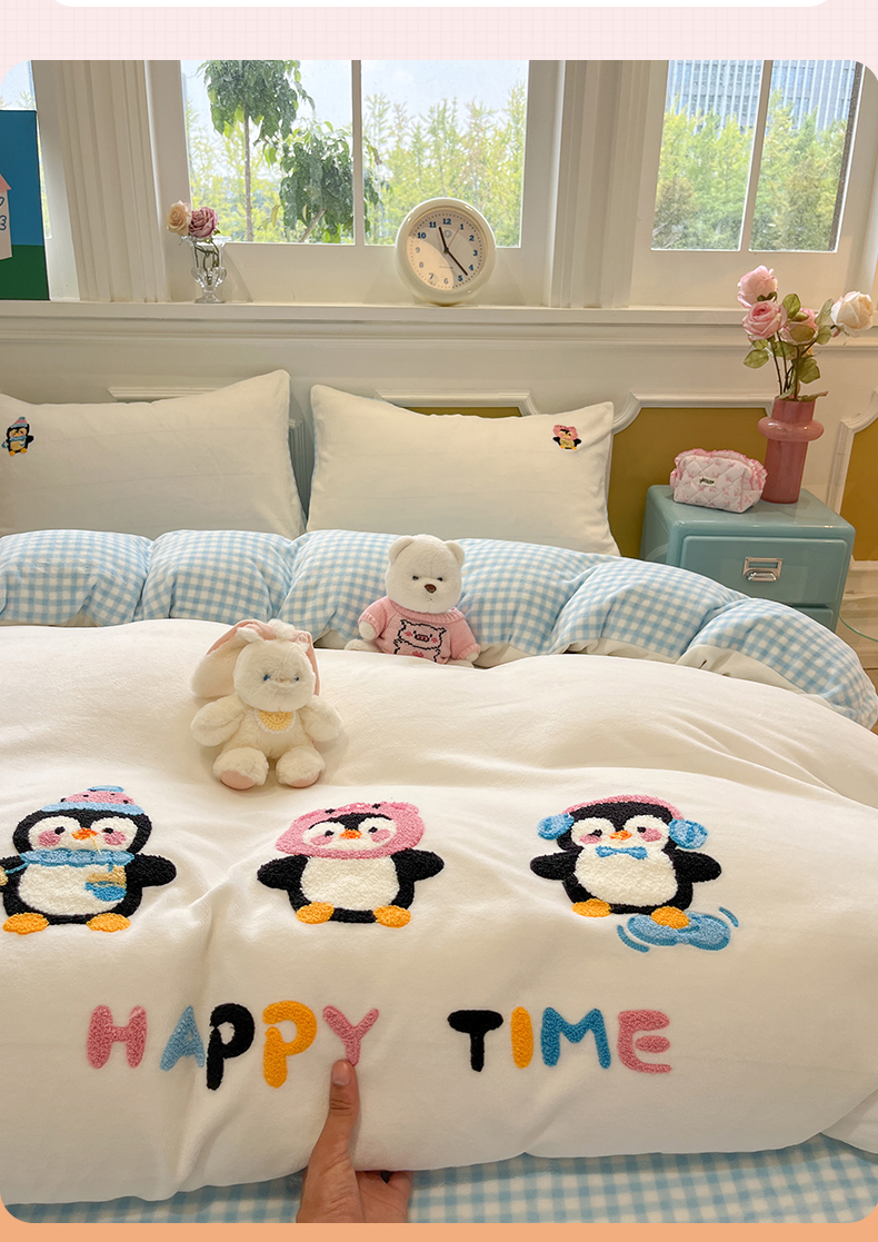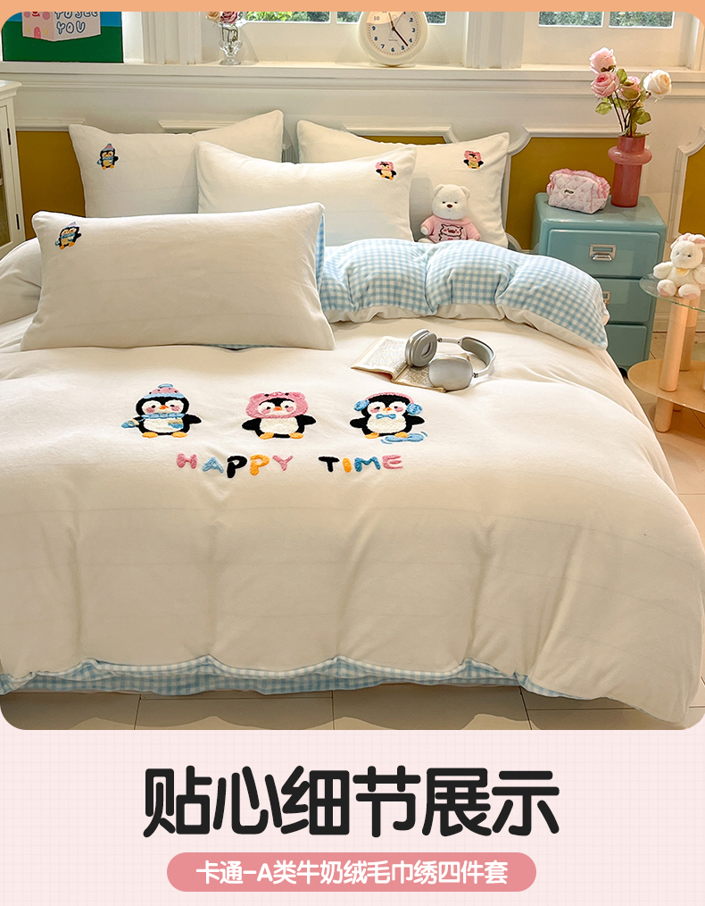星座家纺 2025新款A类卡通200g牛奶绒毛巾绣四件套 企鹅伙伴
