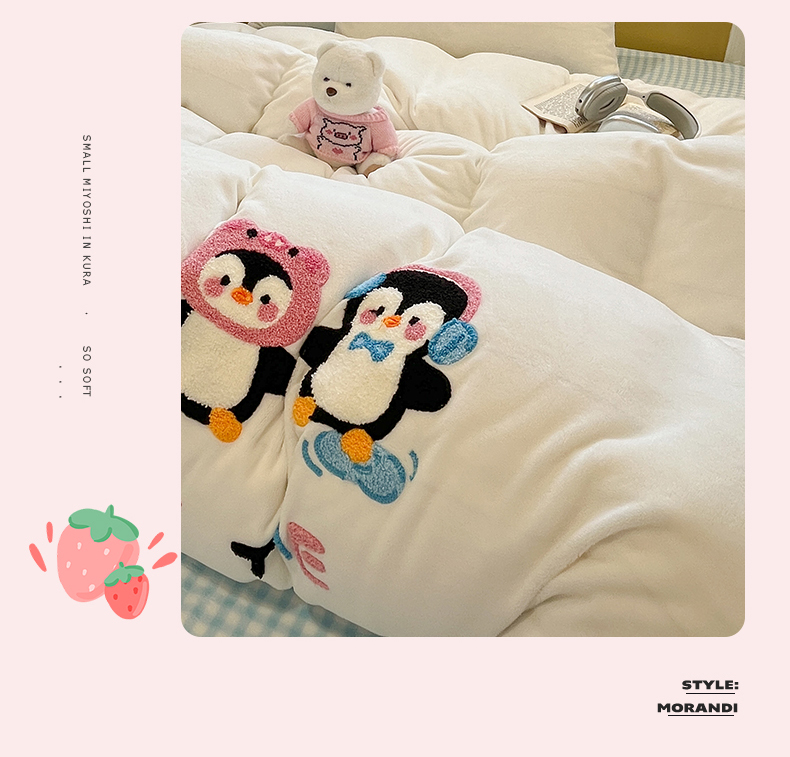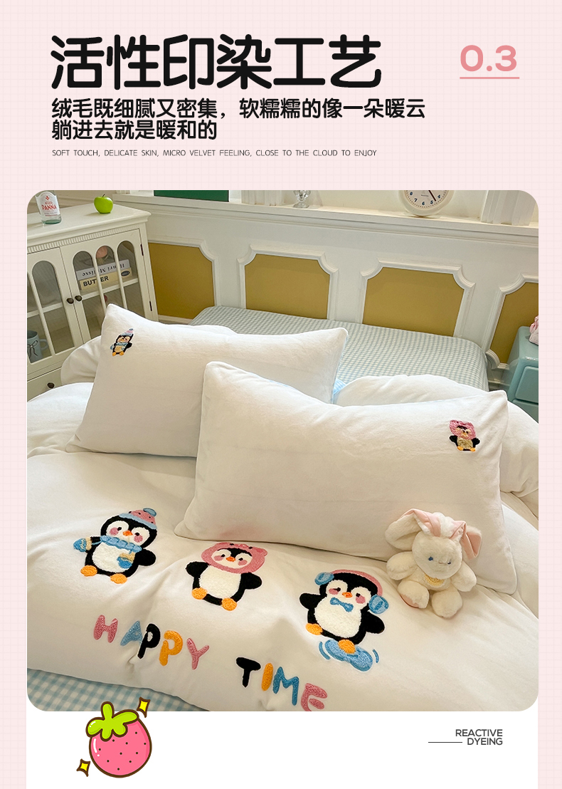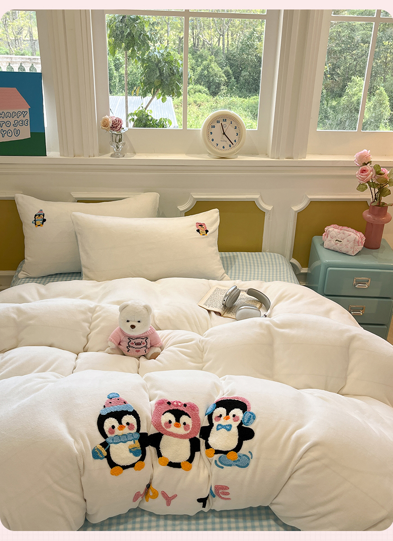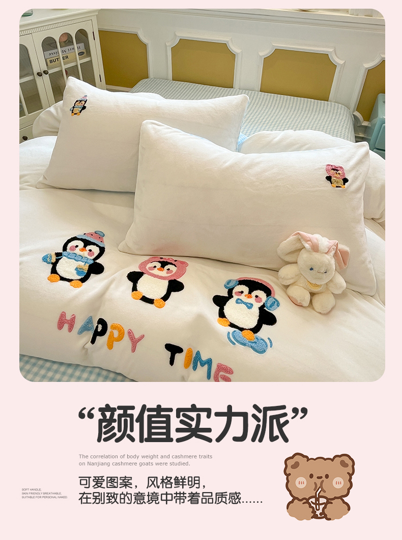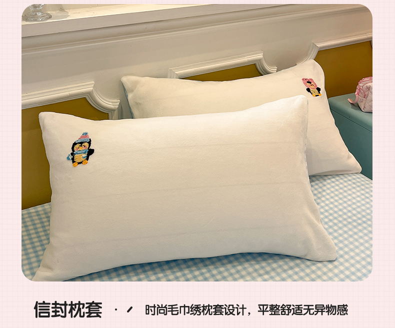 商品名称:星座家纺 2025新款A类卡通200g牛奶绒毛巾绣四件套 企鹅伙伴