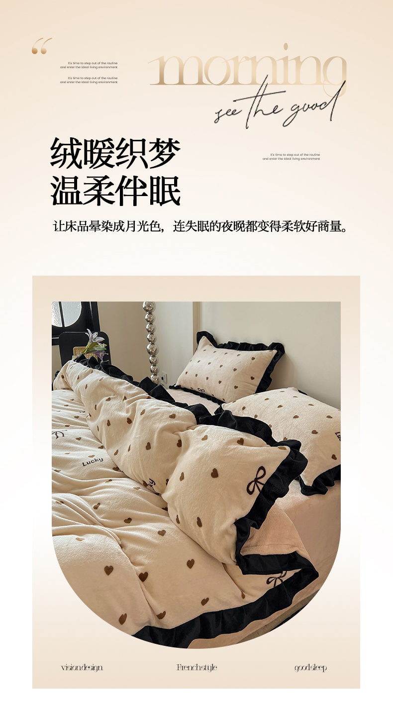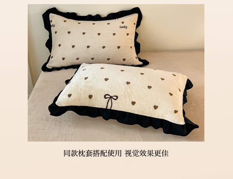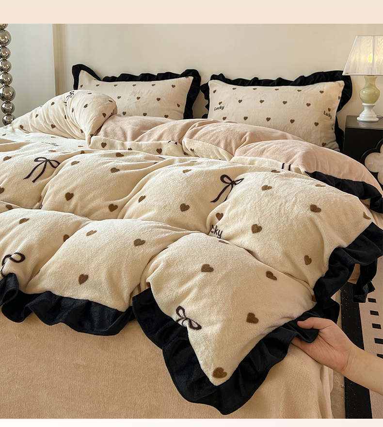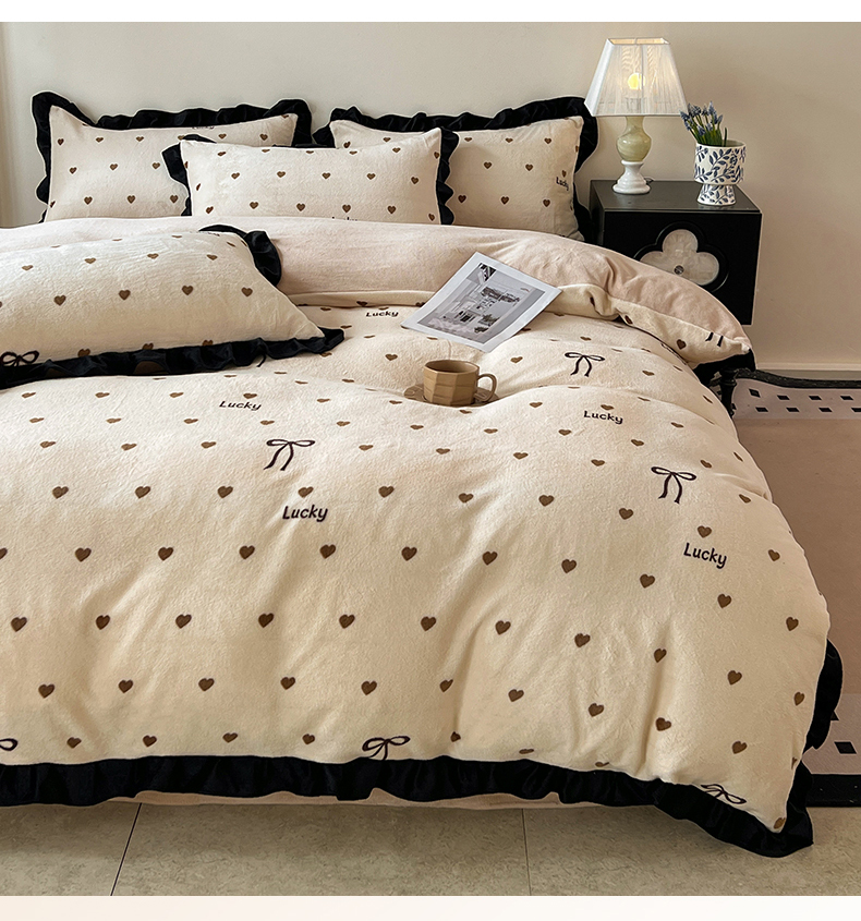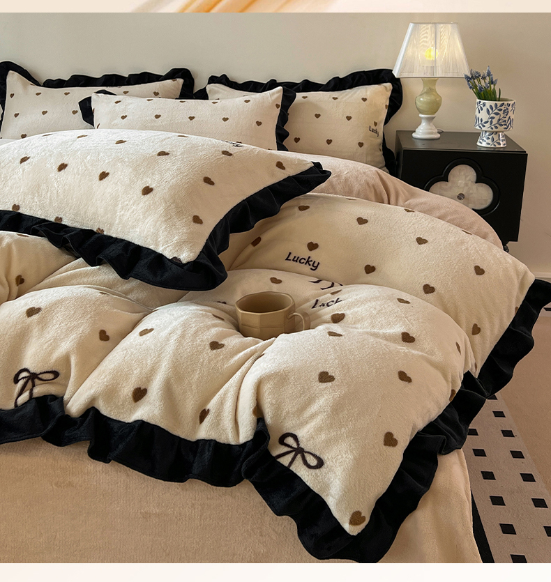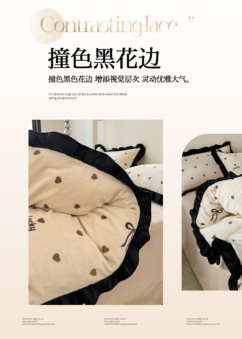 商品名称:鑫利来家纺 2025新款法式黑花边牛奶绒四件套 牛奶绒-爱心蝴蝶结