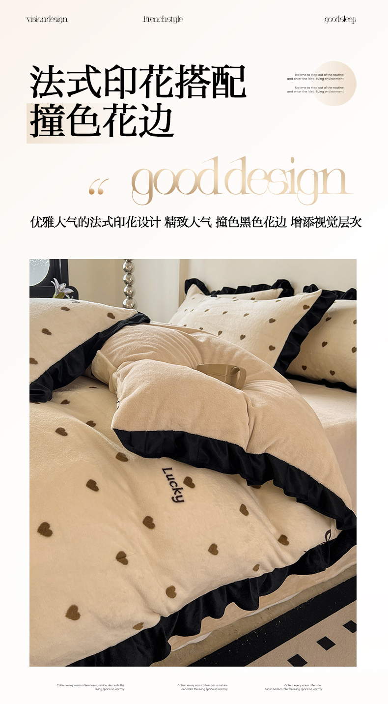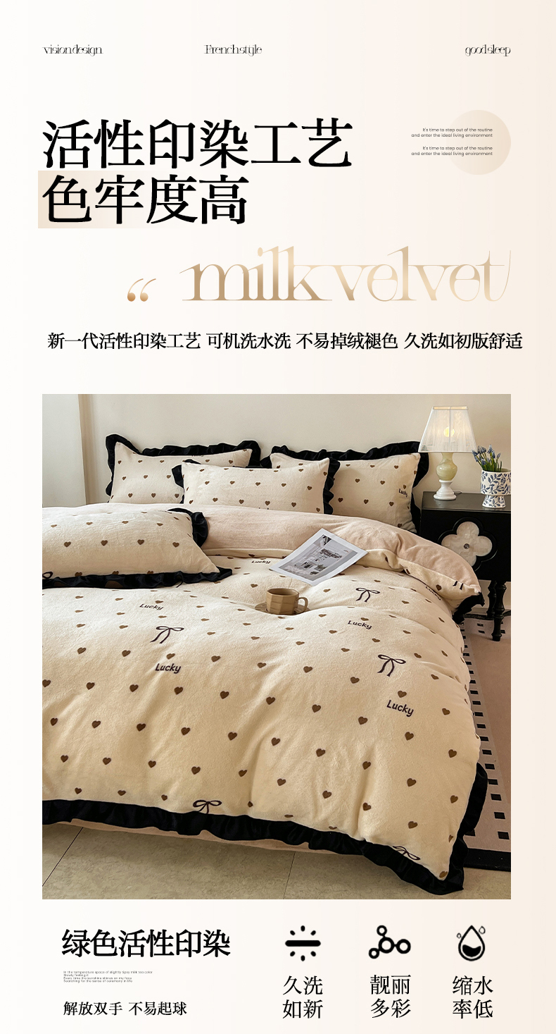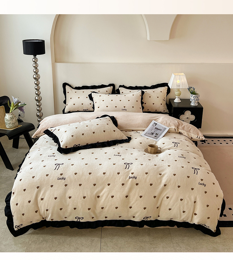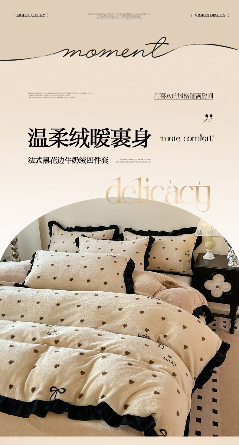鑫利来家纺 2025新款法式黑花边牛奶绒四件套 牛奶绒-爱心蝴蝶结