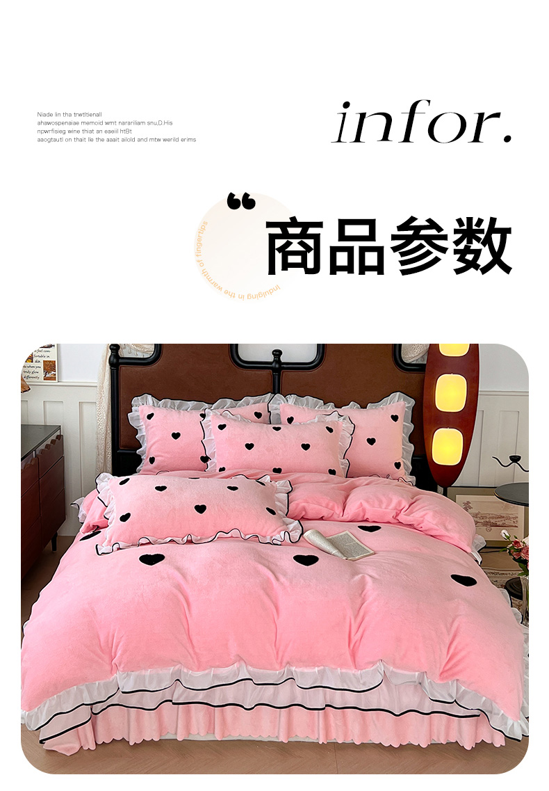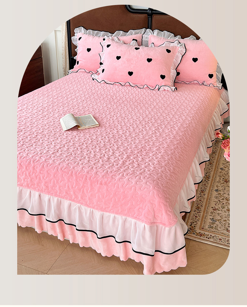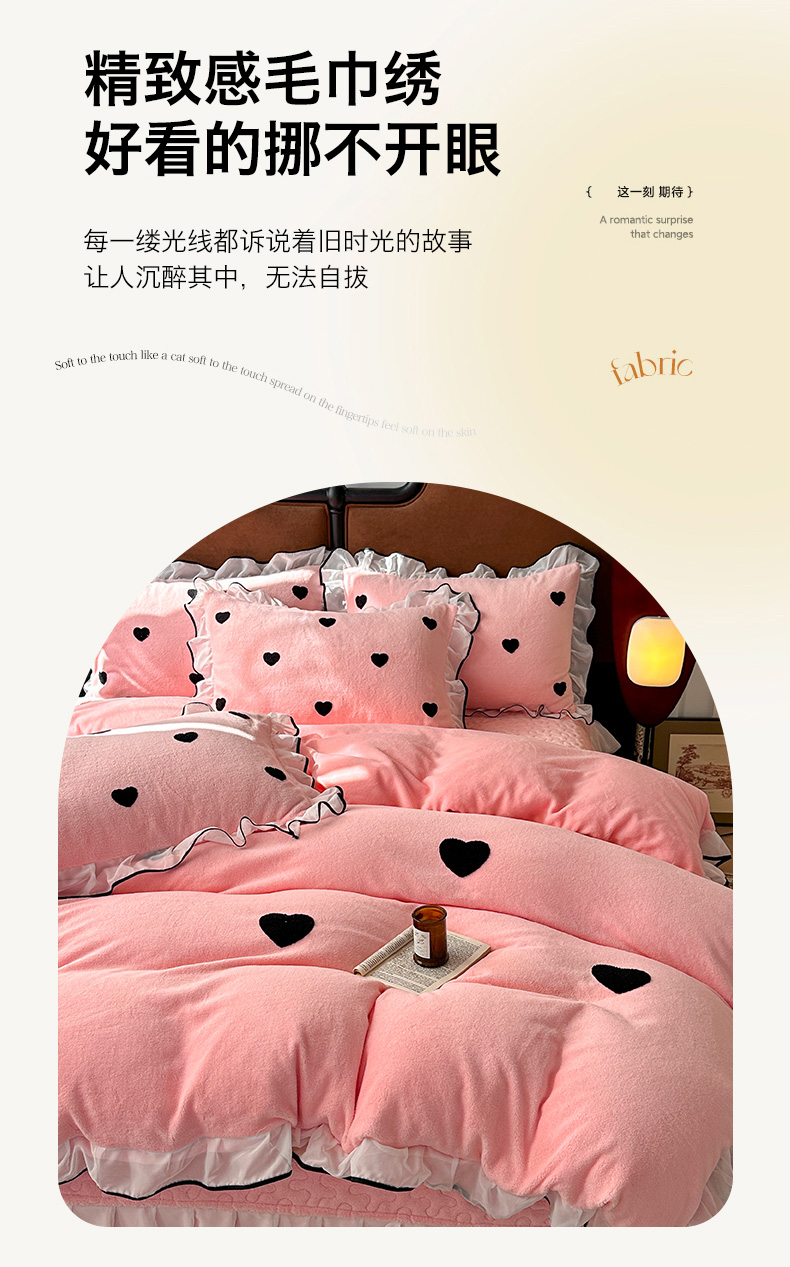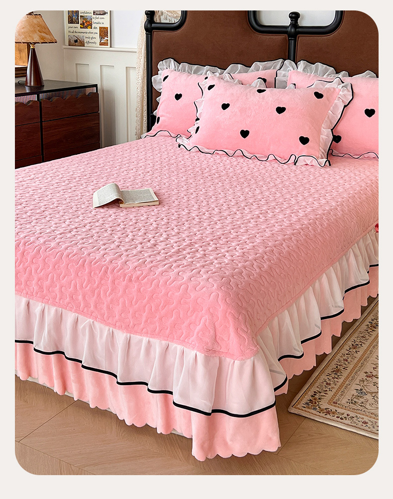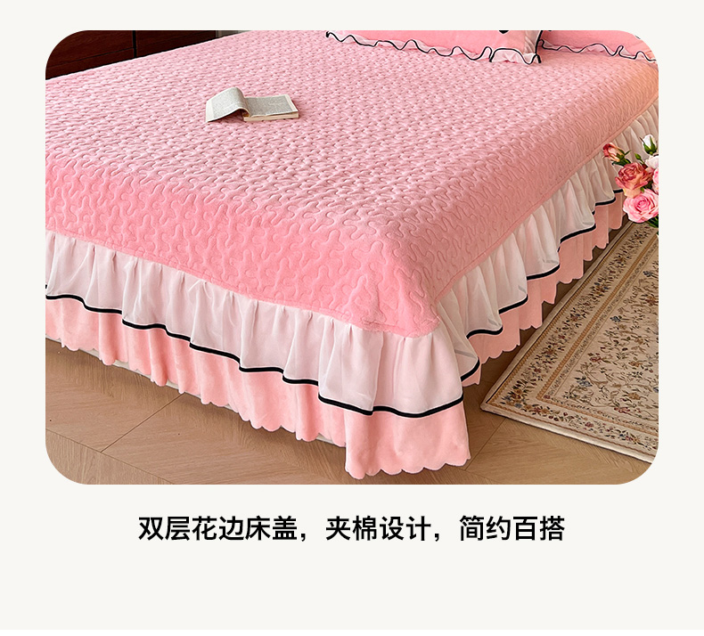 当前位置: 91家纺网 > 商品网购 > 床品套件 > 四件套 > 牛奶绒四件套 > 梦柏家纺 2025新款韩式牛奶绒刺绣花边床盖四件套 樱花粉