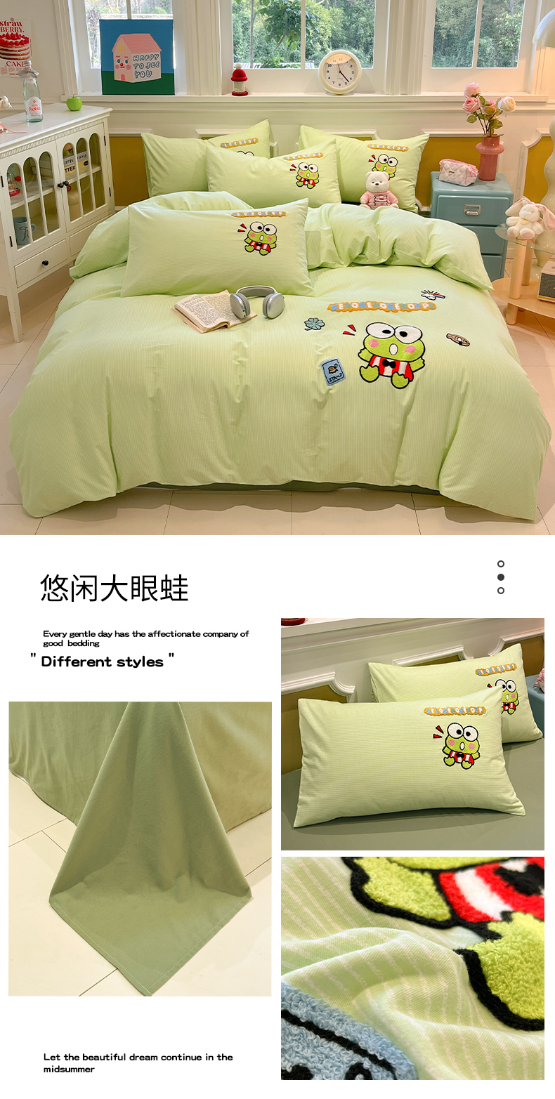 (总)蓝邻家纺 2024新款全棉磨毛卡通刺绣款四件套毛巾绣系列,安妮,汉堡先生,南极舞者,瑞瑞-绿,瑞瑞-米咖,心愿树