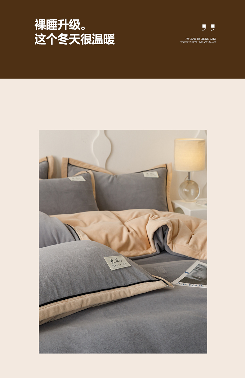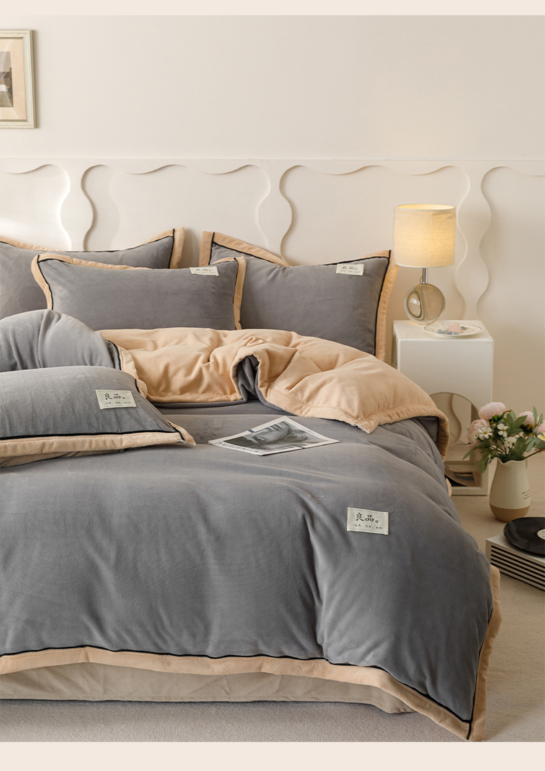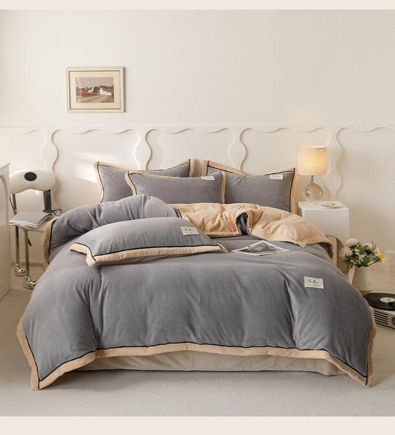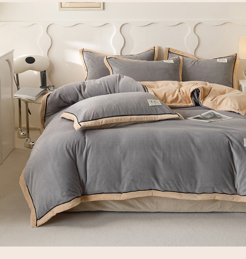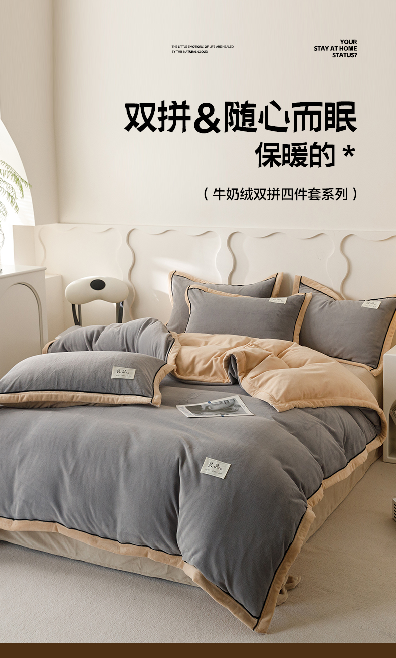 当前位置: 91家纺网 > 商品网购 > 床品套件 > 四件套 > 牛奶绒四件套 > 寐绸家纺 2025秋冬新款230g牛奶绒双拼四件套 双拼四件套-浅灰+米金