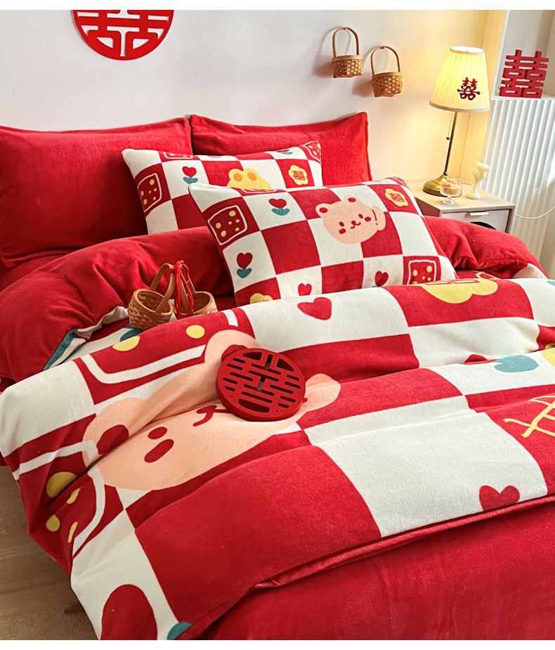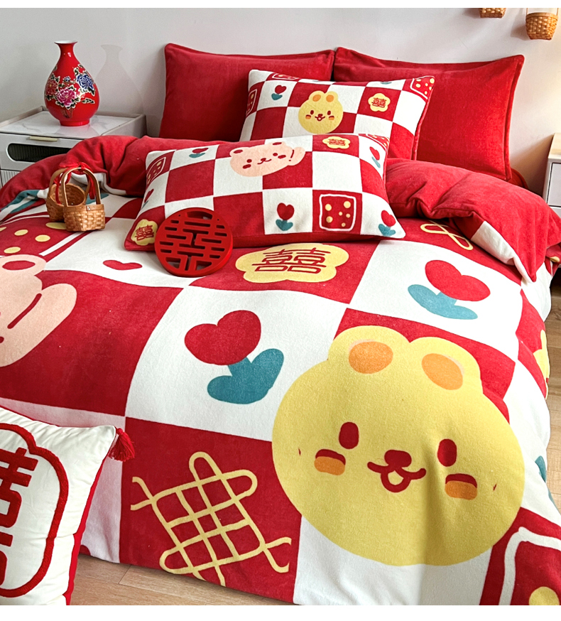 一电 2025新款网红花婚庆牛奶绒四件套结婚喜被大红色新婚被罩婚嫁妆被套床单 喜多多