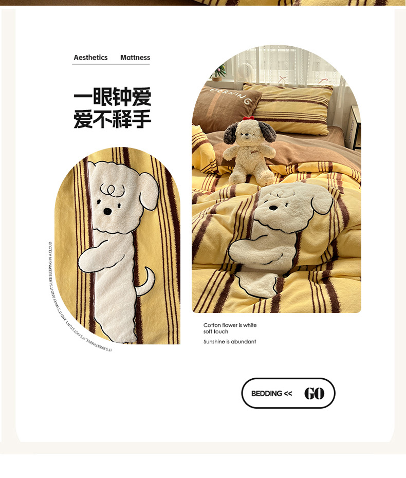 品乐家纺 2025秋冬新款高克重牛奶绒贴布绣四件套 条纹狗狗-黄