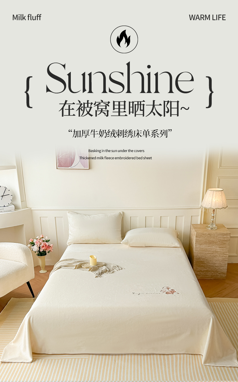 卓缦家纺 2025新款秋冬牛奶绒刺绣床单加厚三件套单品 奶白