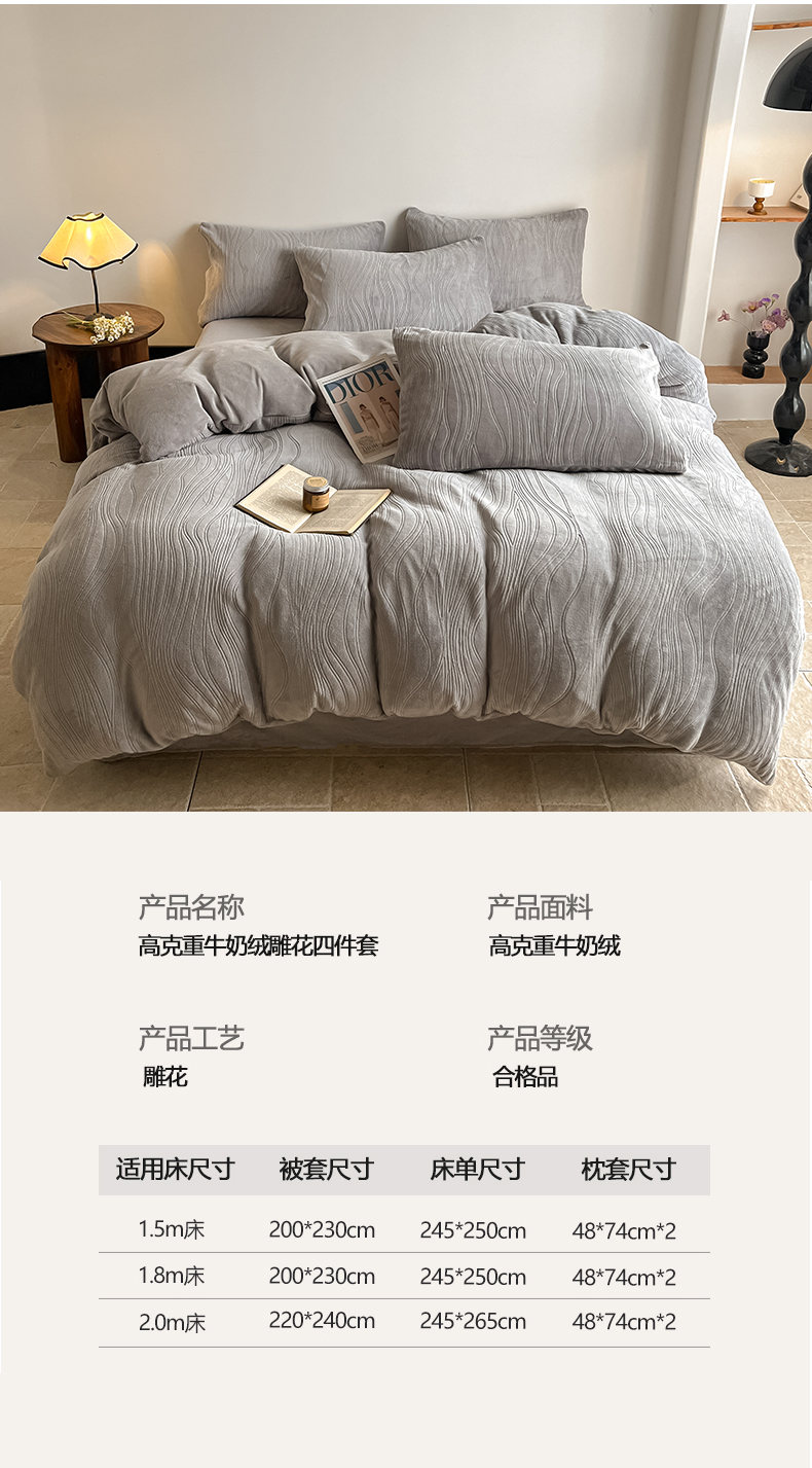 当前位置: 91家纺网 > 商品网购 > 床品套件 > 四件套 > 牛奶绒四件套 > 云玲时尚 2025新款高克重牛奶绒雕花四件套-波浪 波浪蓝灰