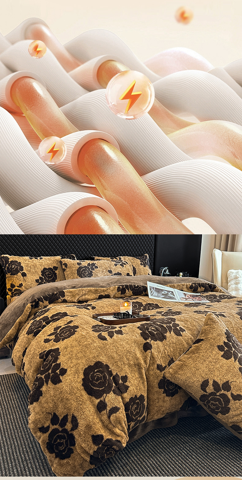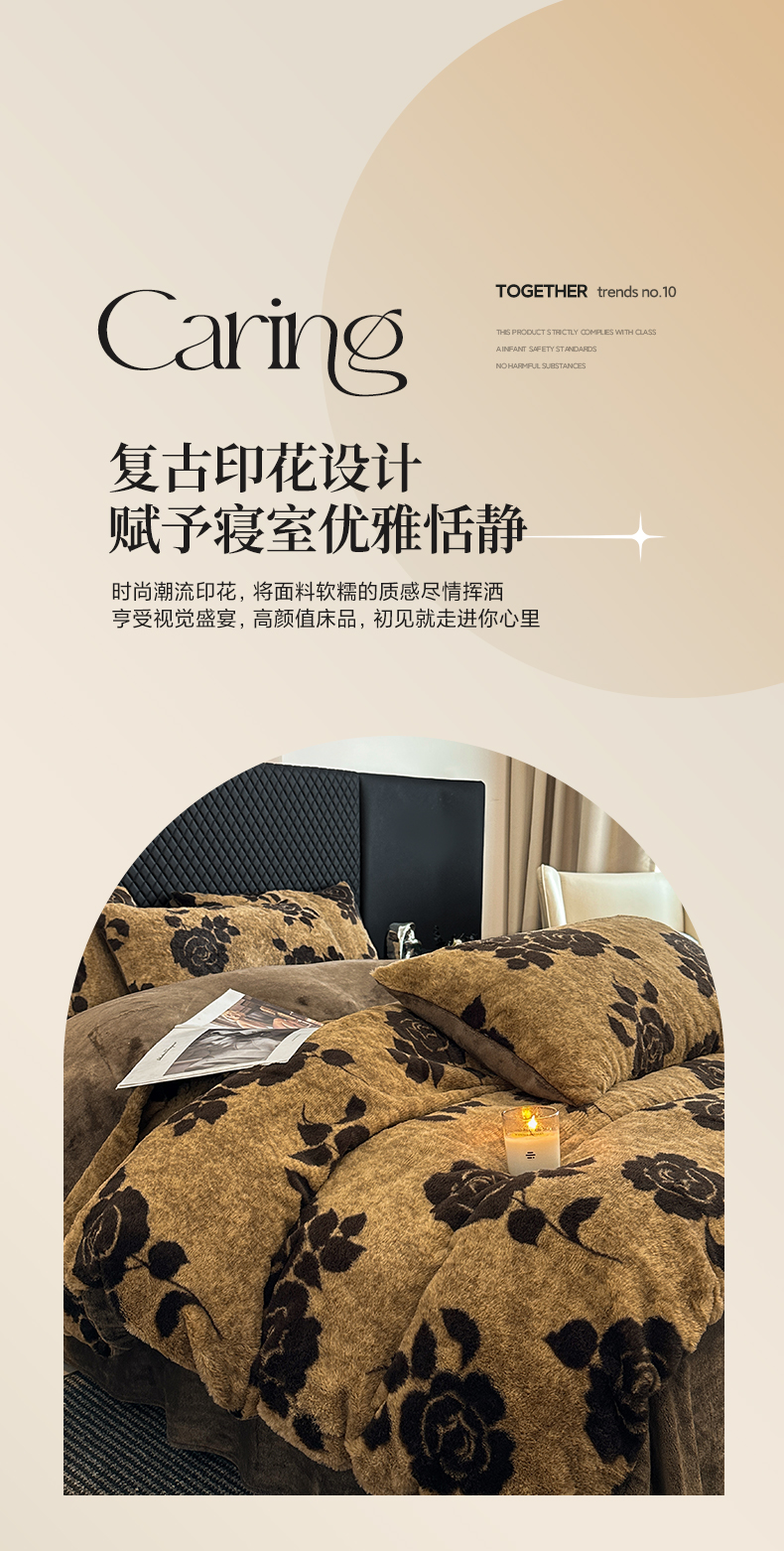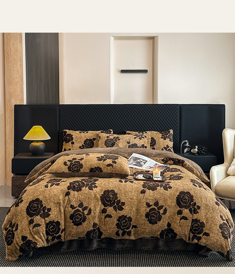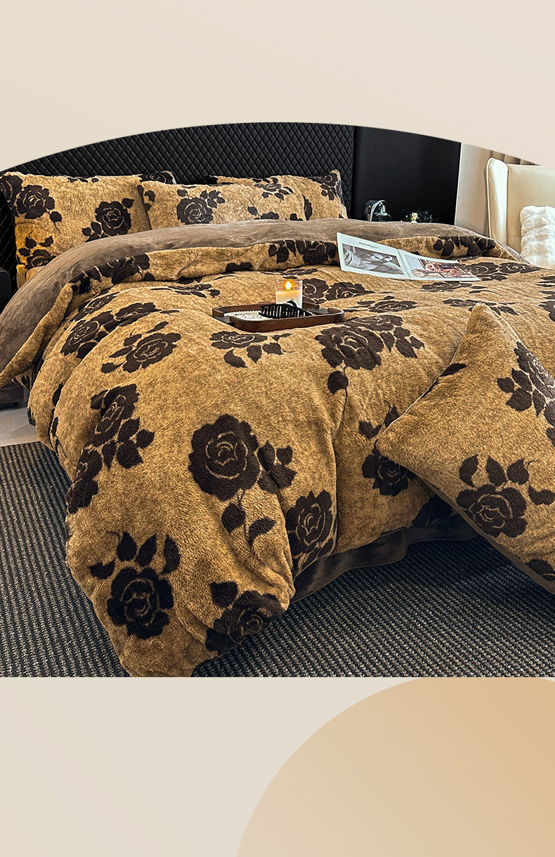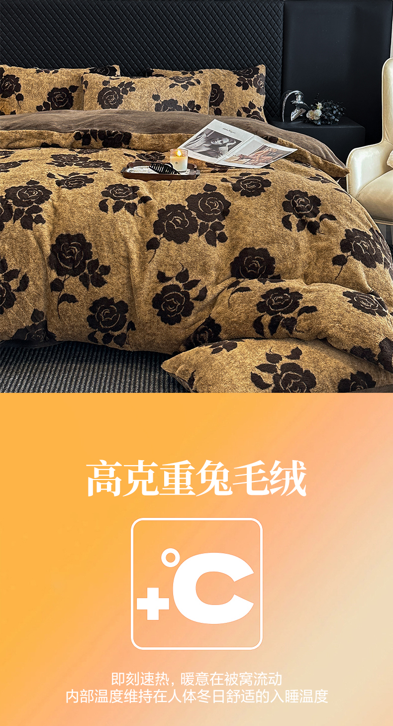 商品名称:民新家纺 2025新款兔毛绒印花简约款四件套 简约款-爱意玫瑰咖