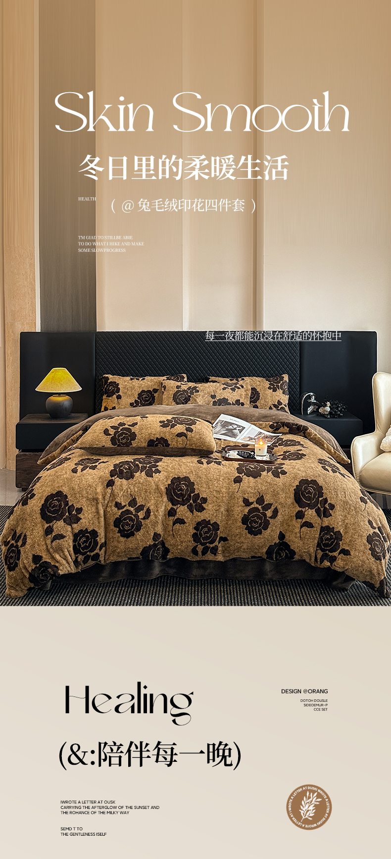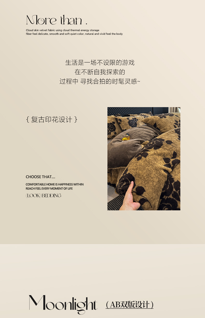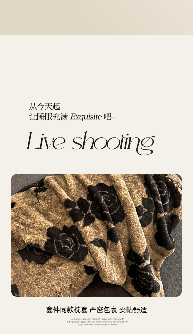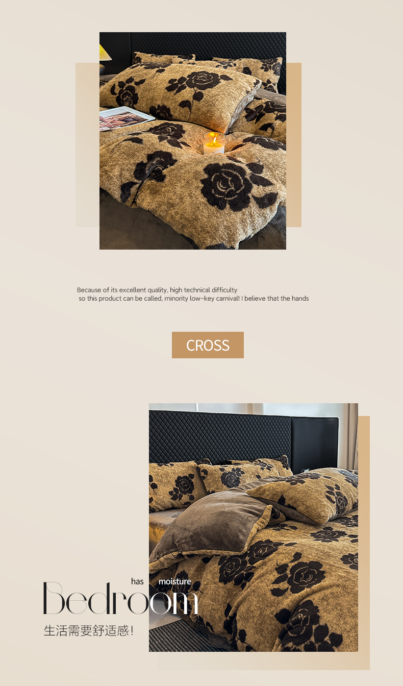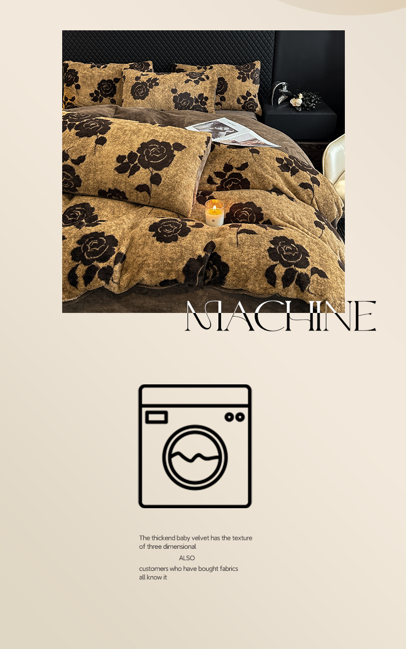 商品名称:民新家纺 2025新款兔毛绒印花简约款四件套 简约款-爱意玫瑰咖