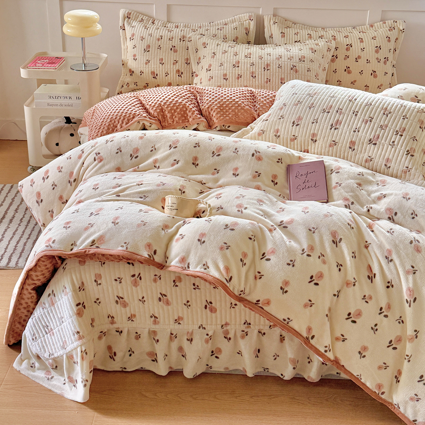 (总)欧尚 2025新款牛奶绒花边床盖四件套,粉点点,花小玉,咖色小心心,蓝点点,慕然,仙女粉,仙女紫