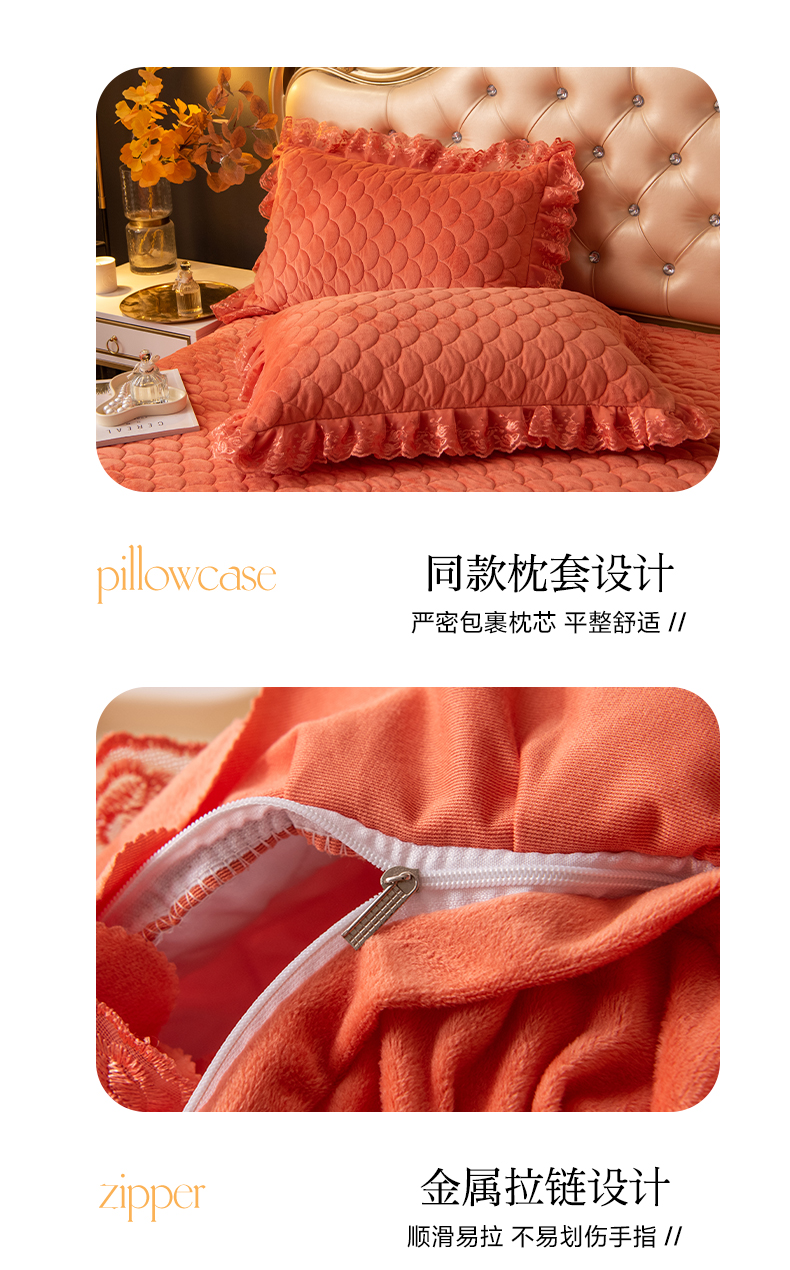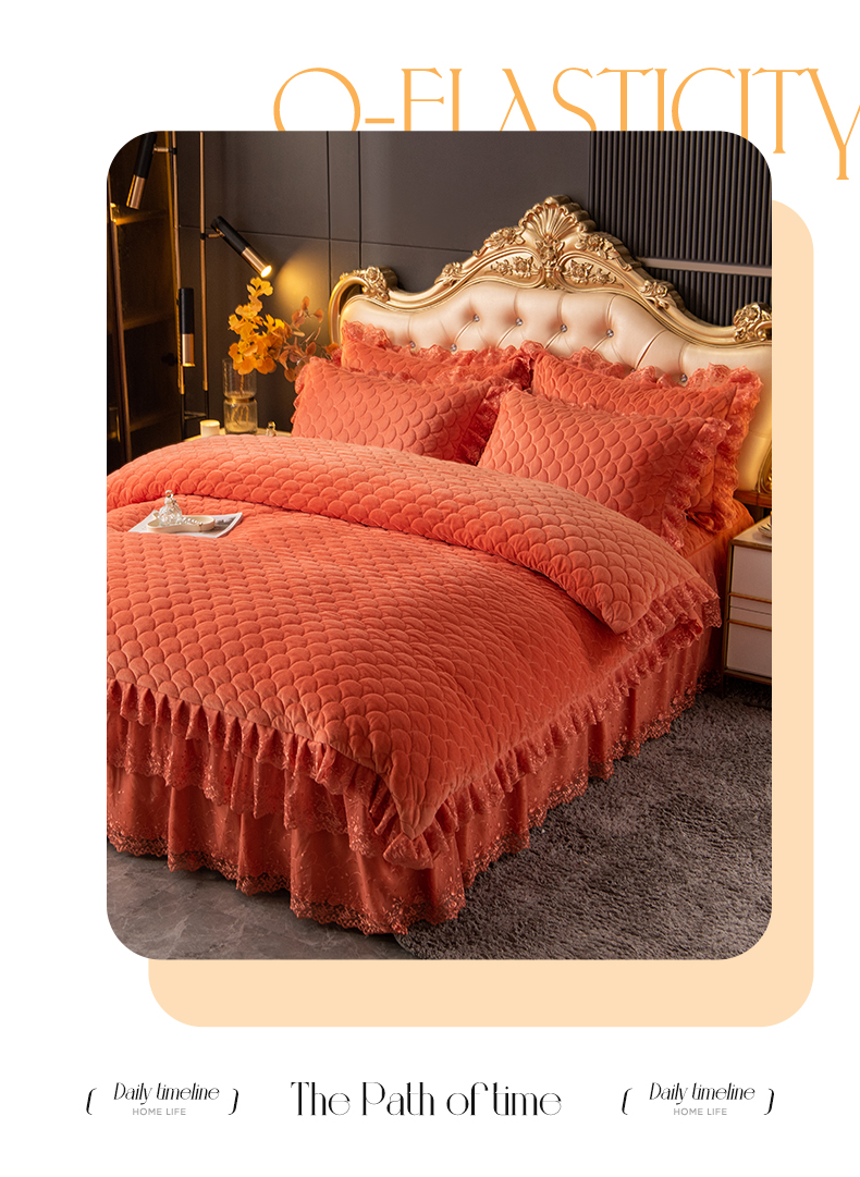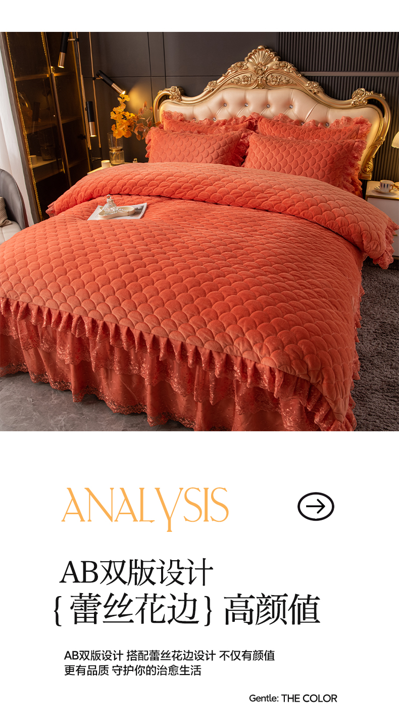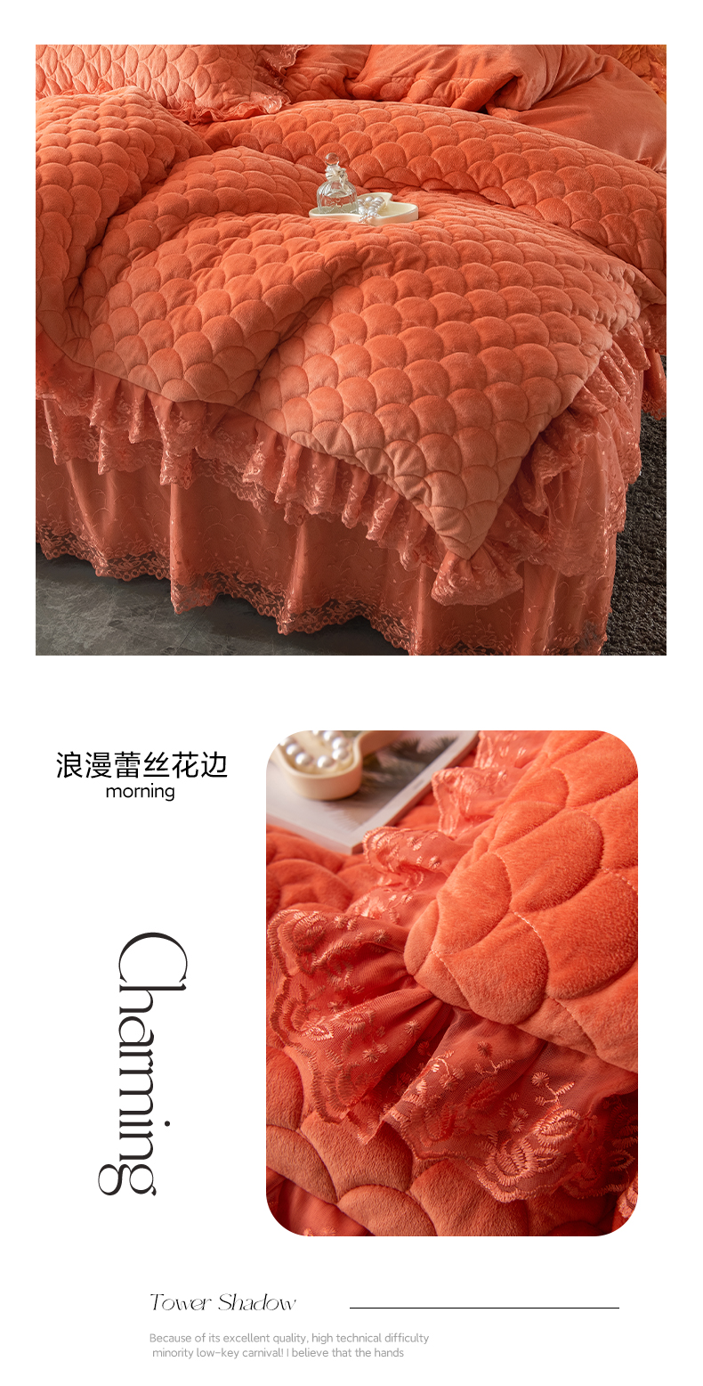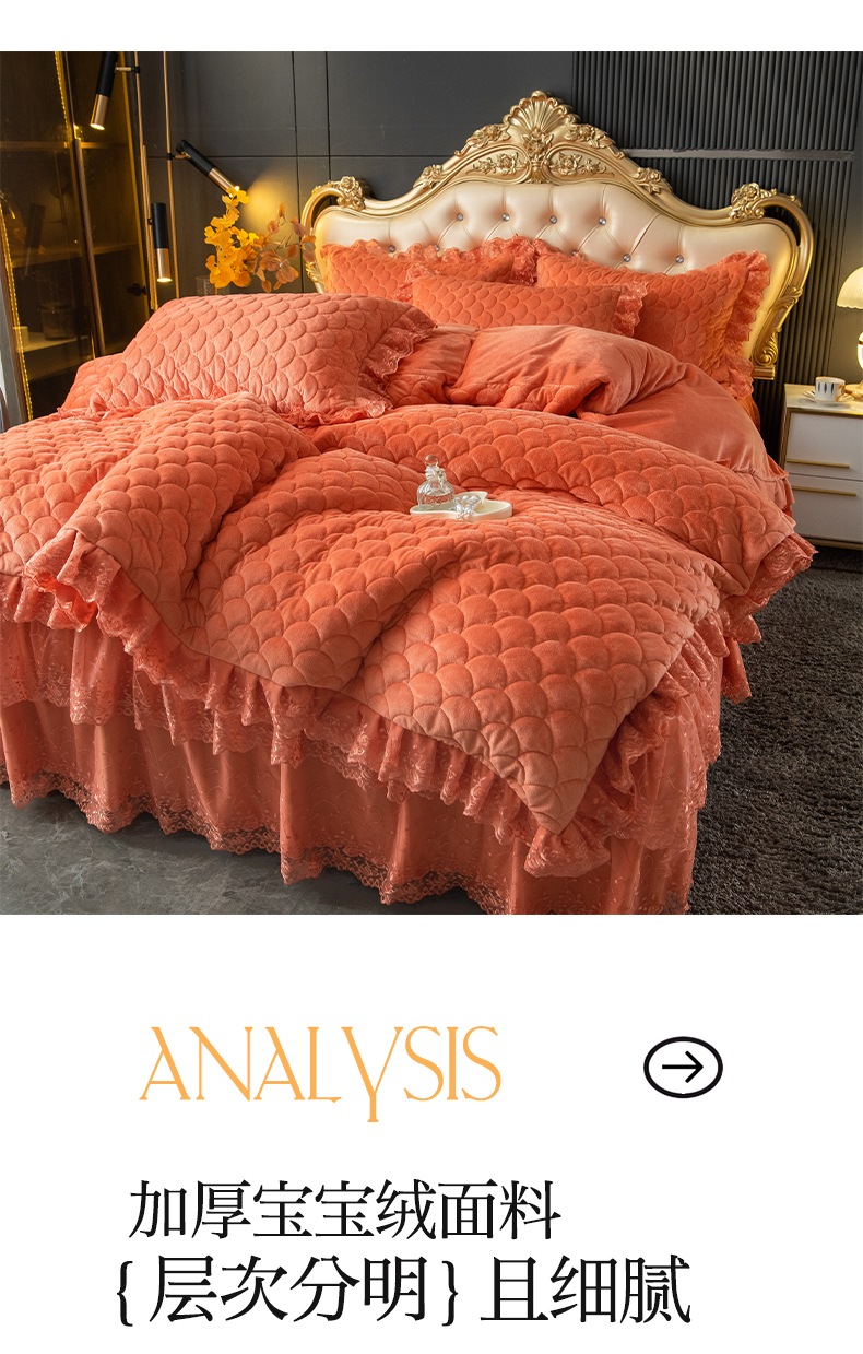 当前位置: 91家纺网 > 商品网购 > 床品套件 > 四件套 > 宝宝绒四件套 > 默忆 2025新款宝宝绒蕾丝刺绣花边四件套 秋日橙