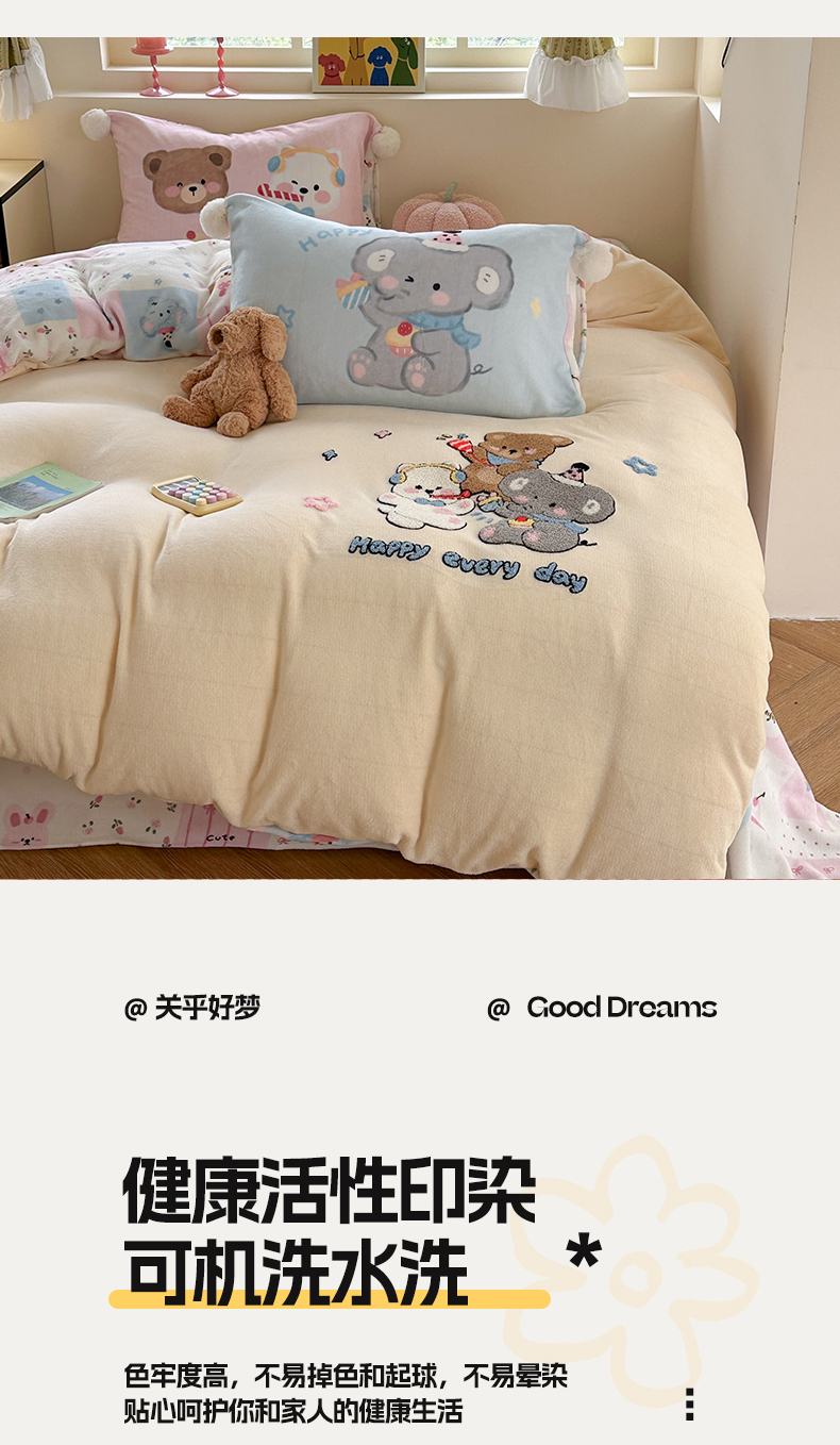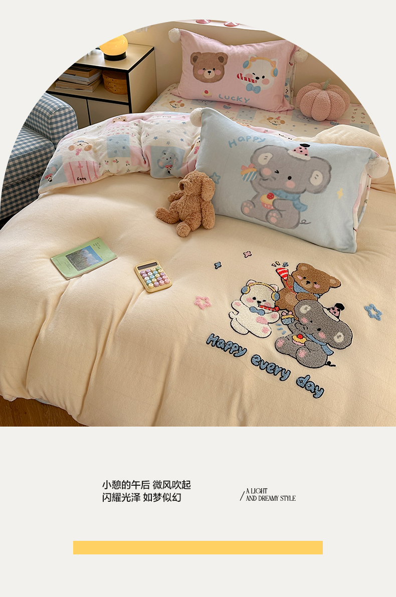 (总)眠屿家纺 2025新款加厚牛奶绒贴布绣四件套,棒球熊,动物朋友,欢乐音乐