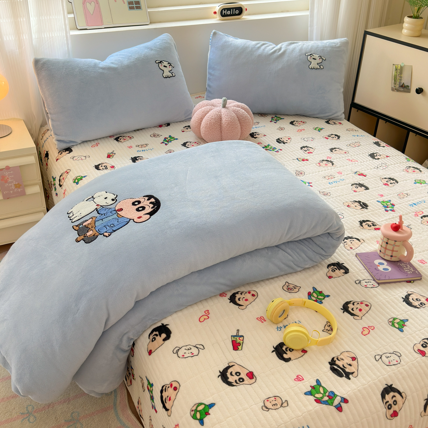 (总)乐童家纺 2025新款高克重牛奶绒床盖款毛巾绣四件套,吹泡泡黄色,吹泡泡蓝色,过生日的海宝和派派,晚安小新,小新大白