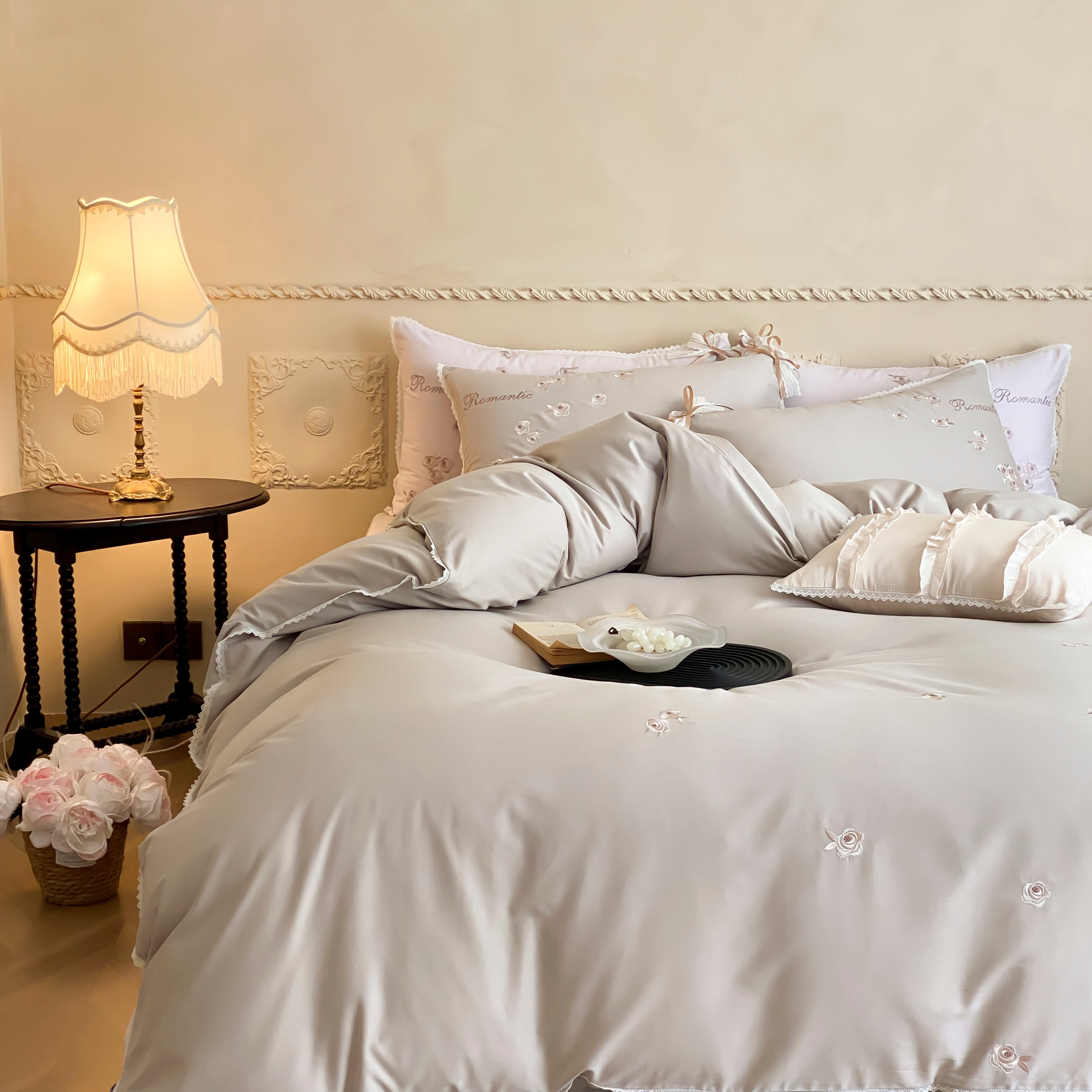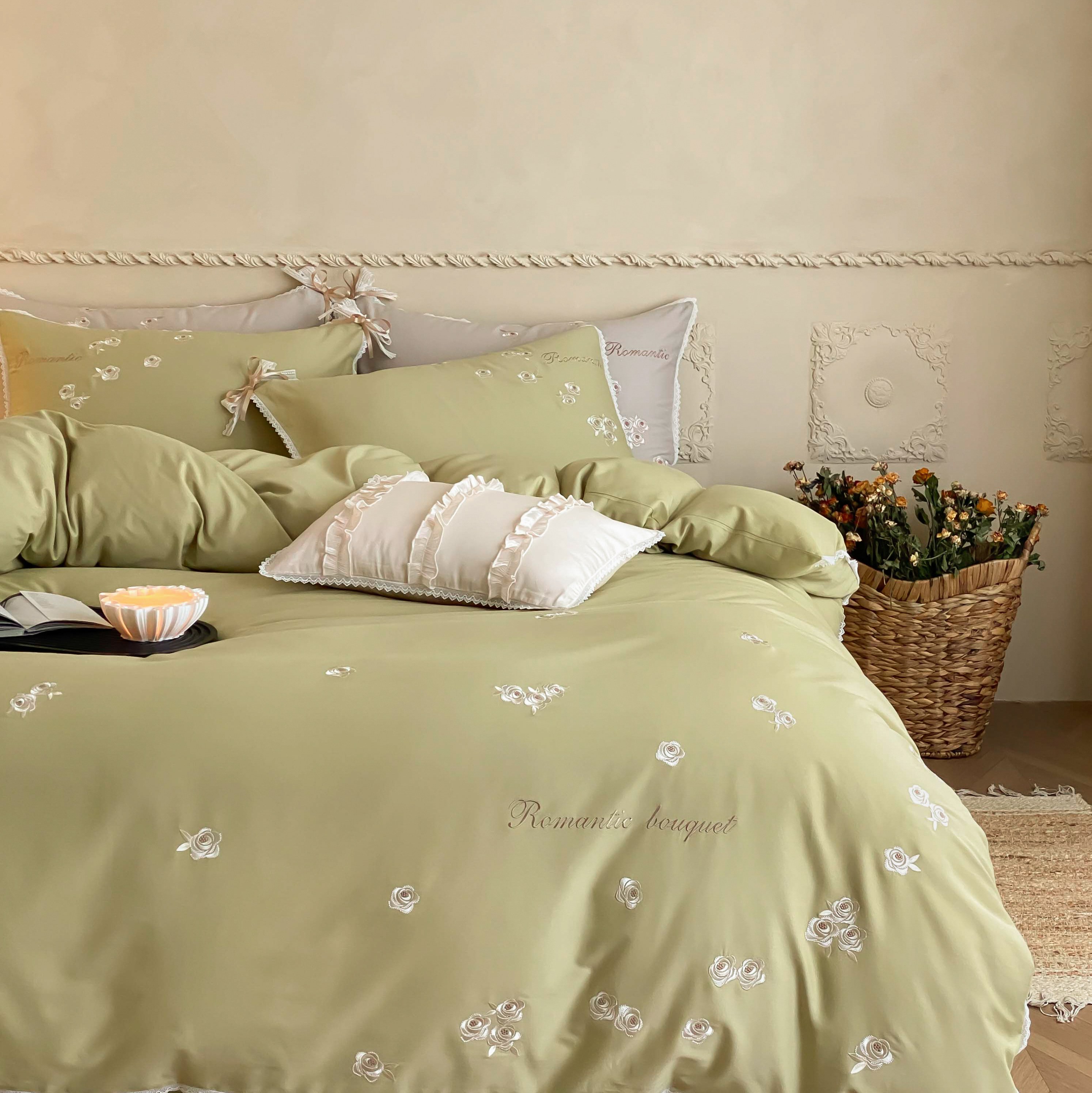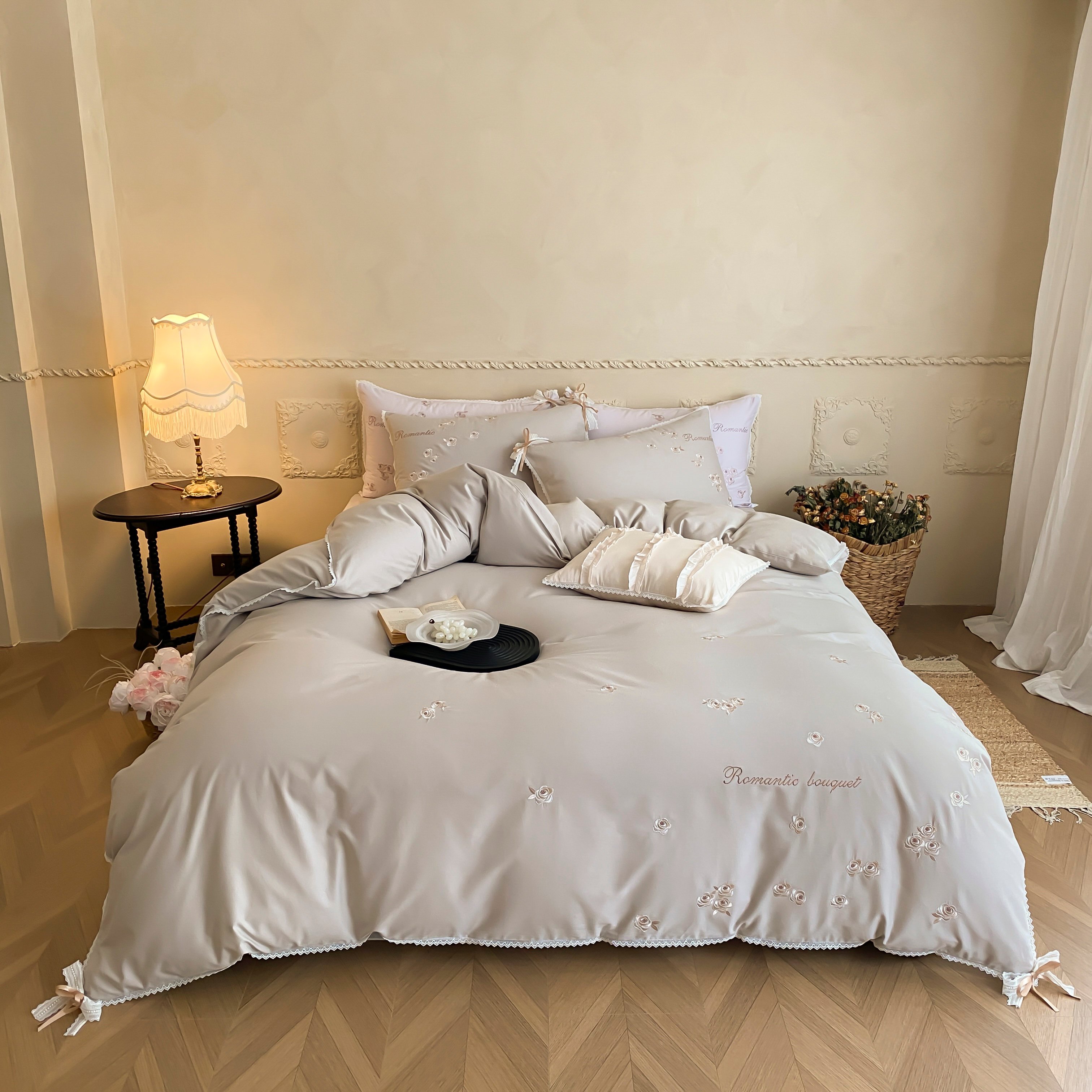 (总)佳汐蓝 2025春夏新品双层皱皱纱刺绣+织带+荷叶边四件套--白茶花,奶白,曲奇