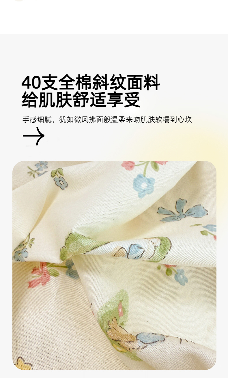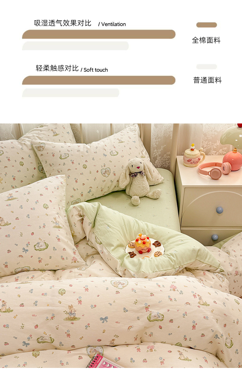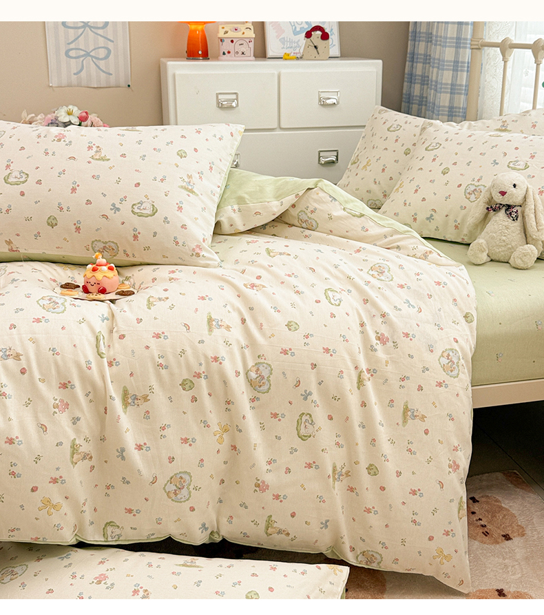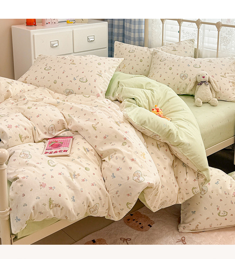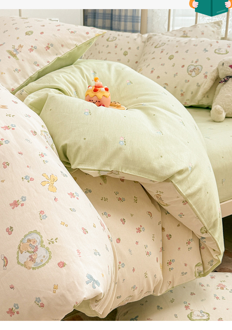 商品名称:简宜家居(朝初家纺) 2025新款12868全棉兔与花笺系列四件套 兔与花笺
