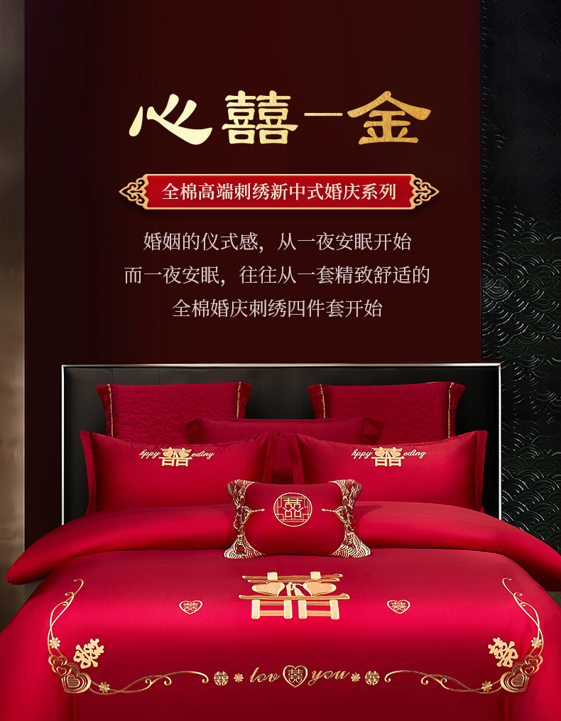 浩情国际婚庆供货中心 2026新款100%全棉纯棉新中式刺绣大红结婚婚庆四件套多件套 HQ-心囍(金)
