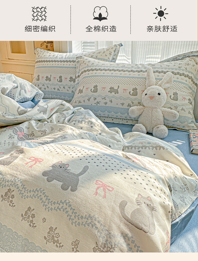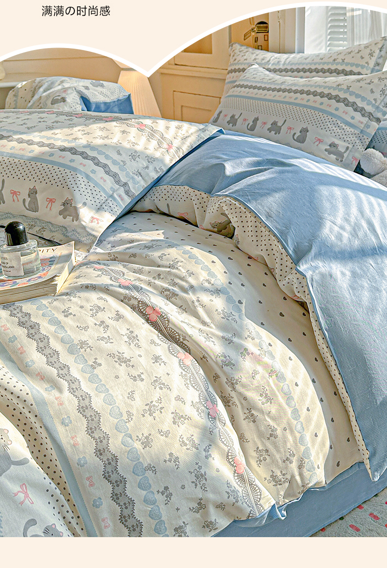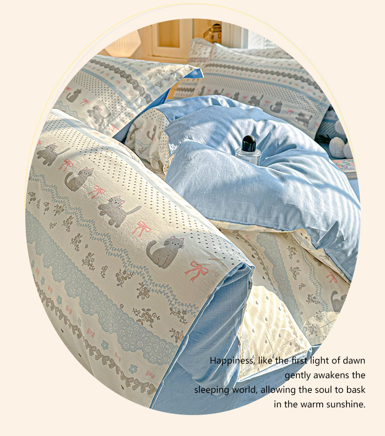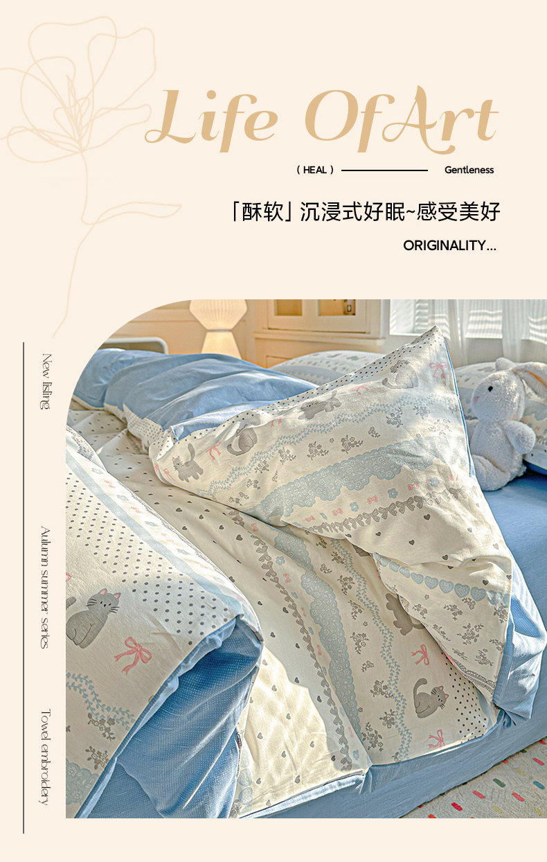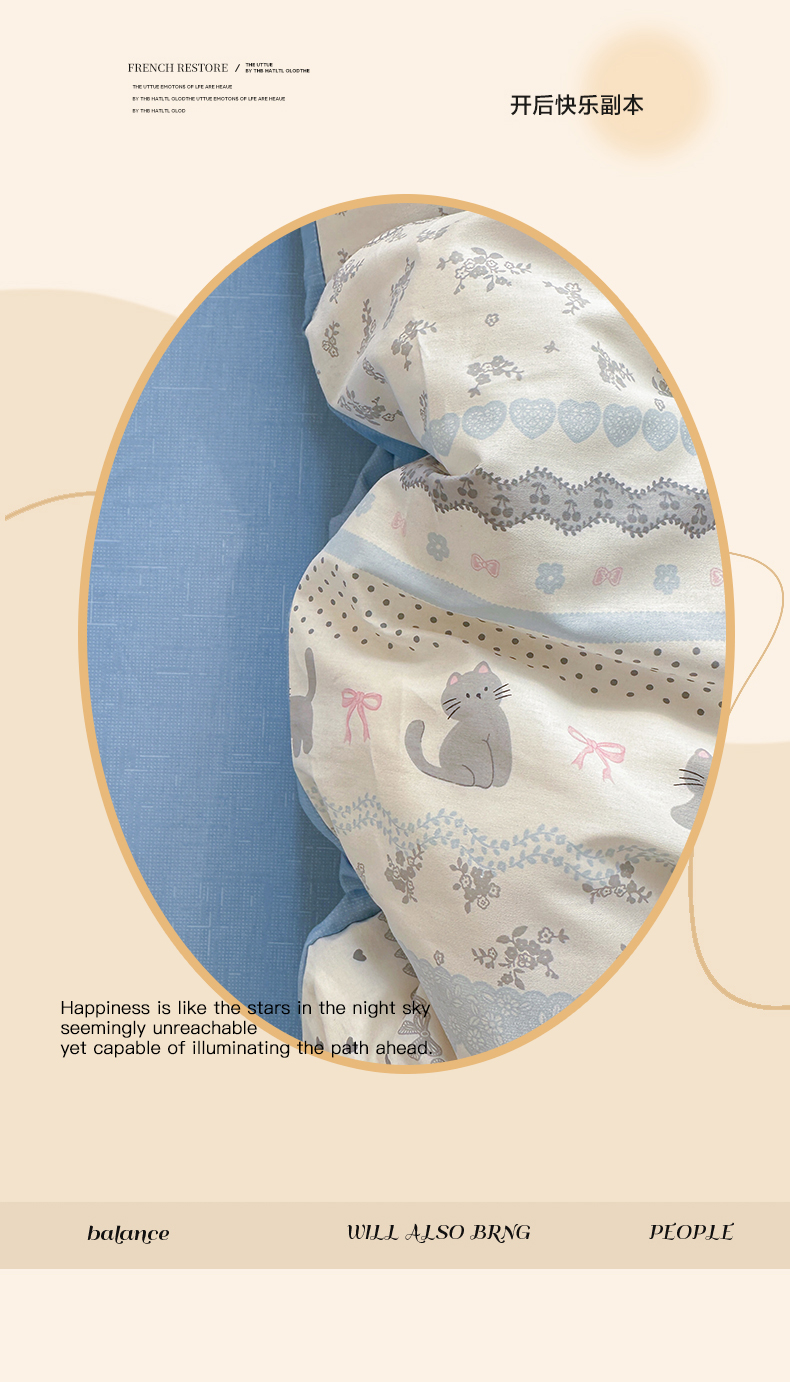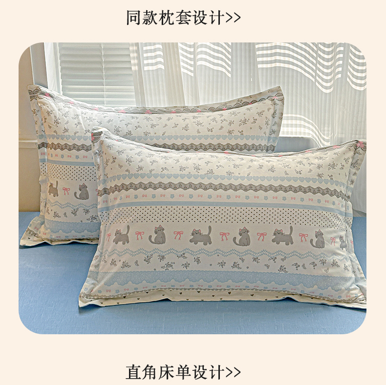 当前位置: 91家纺网 > 商品网购 > 床品套件 > 四件套 > 全棉普通四件套 > 春雨家居 2026新款全棉纯棉花ins减龄可爱小清新四件套 小猫时光-兰