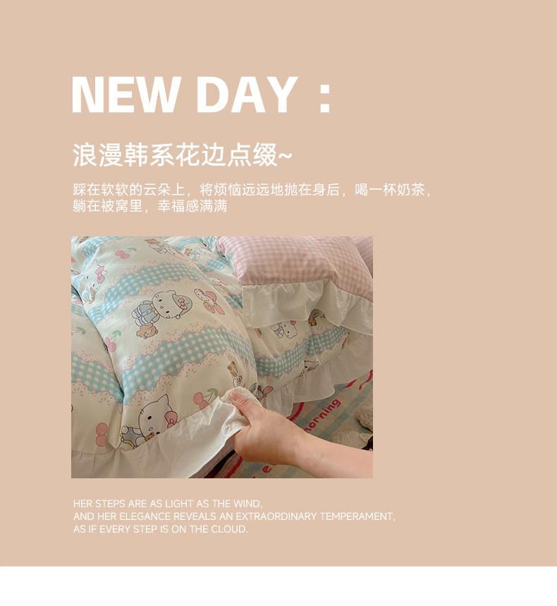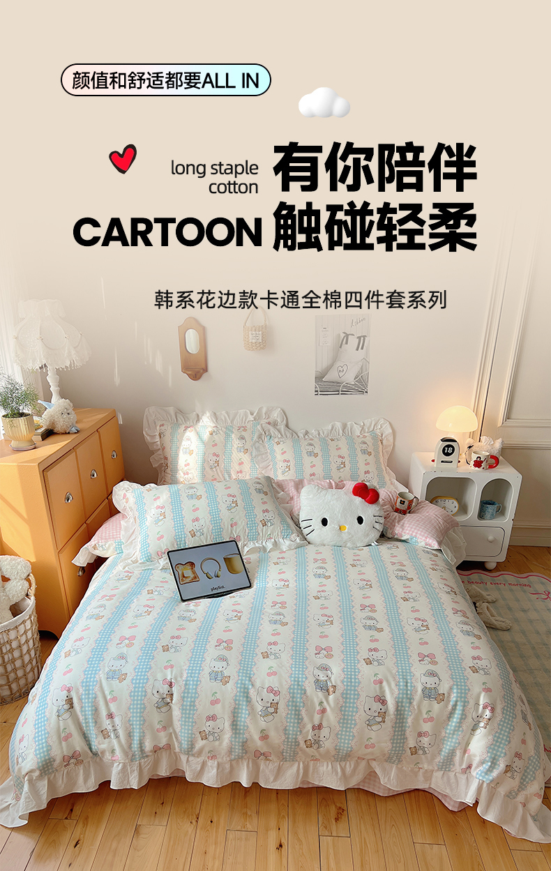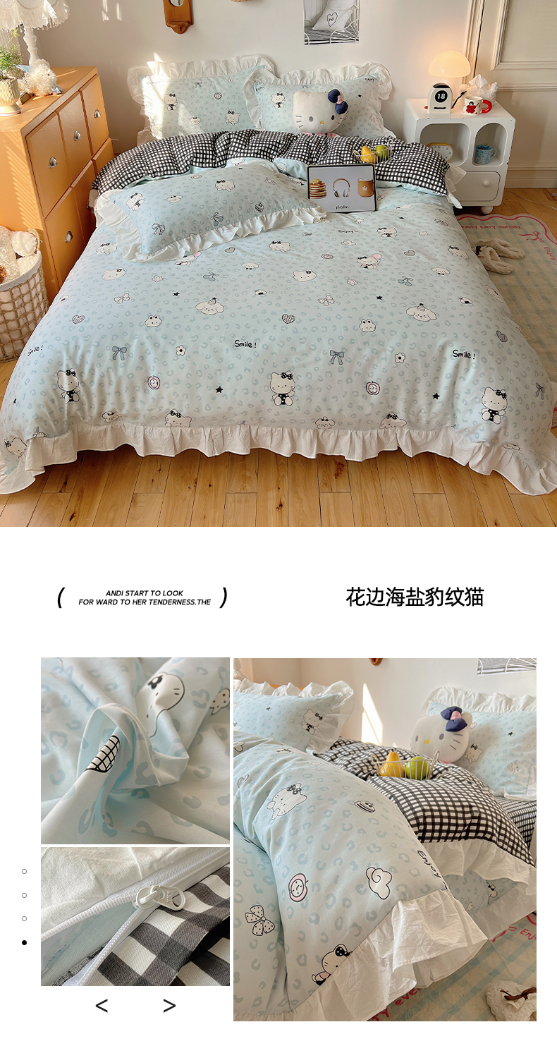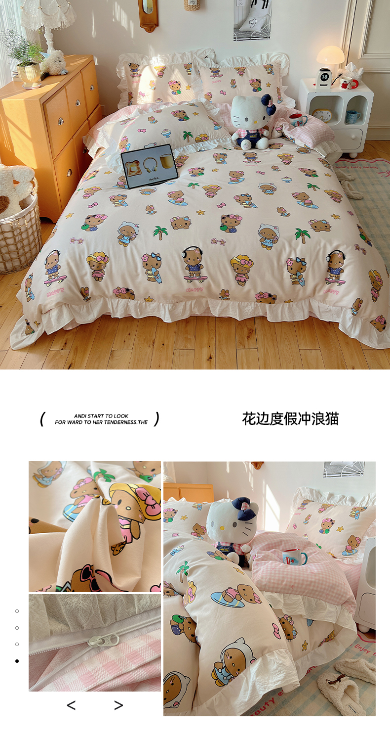 商品名称:六巷胡同 2026春夏新款韩系可爱风花边款卡通全棉四件套(第一系列) 花边萝莉樱桃猫