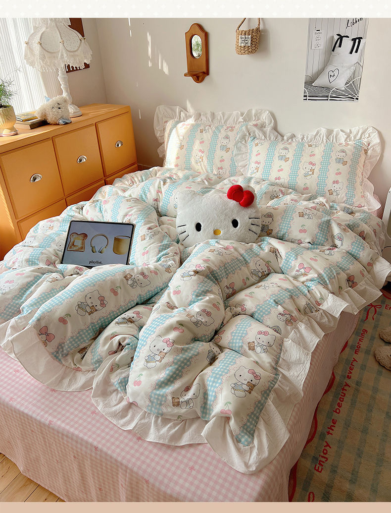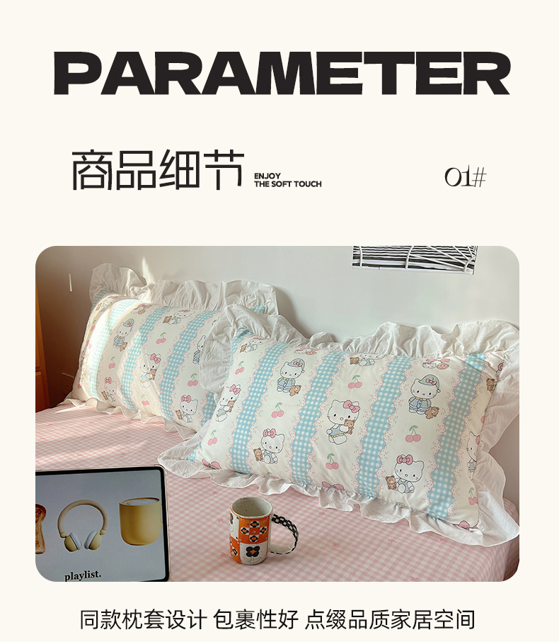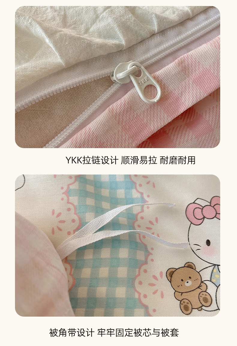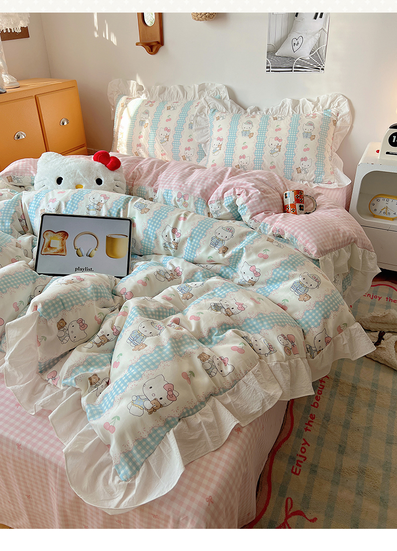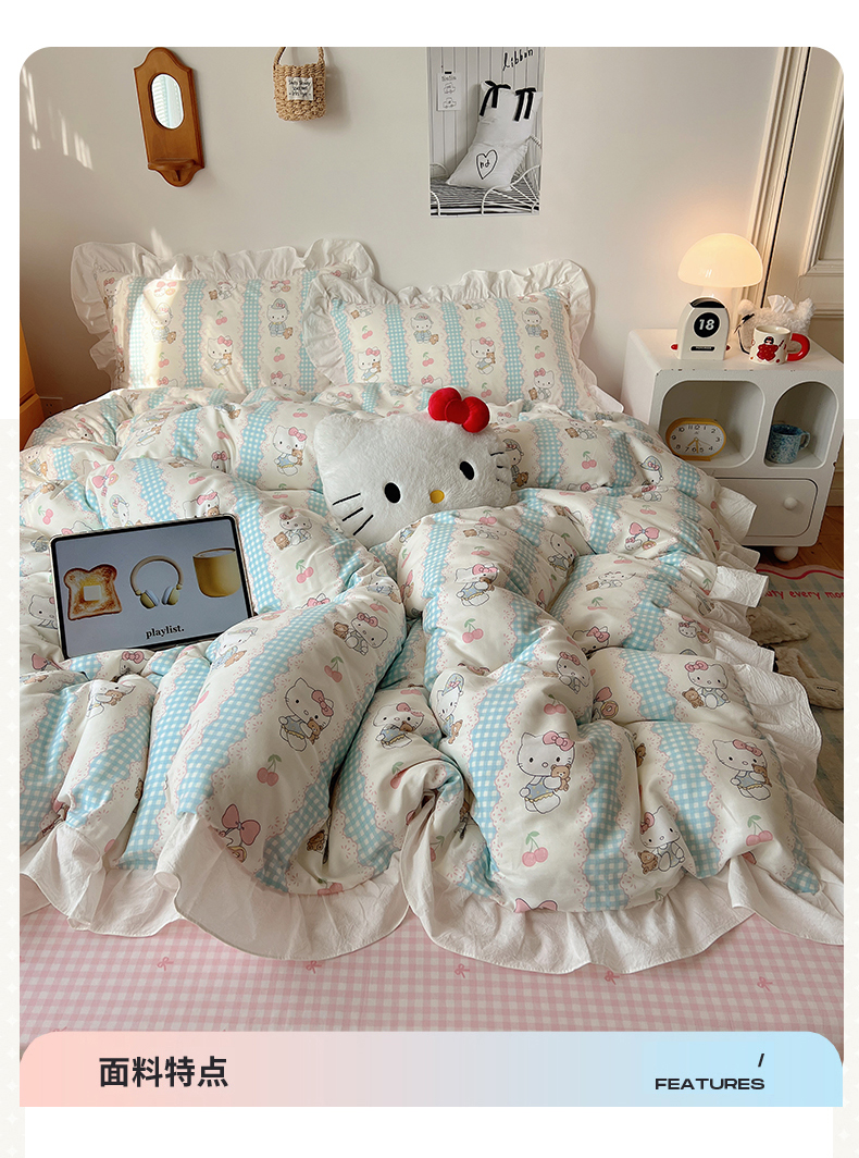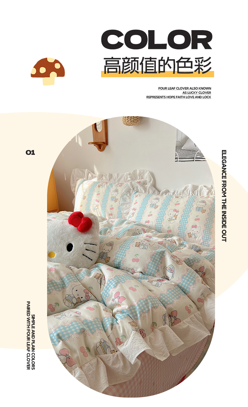 商品名称:六巷胡同 2026春夏新款韩系可爱风花边款卡通全棉四件套(第一系列) 花边萝莉樱桃猫