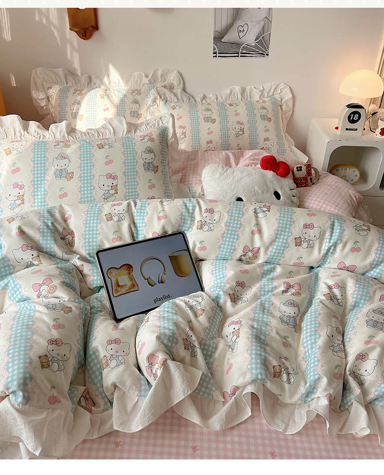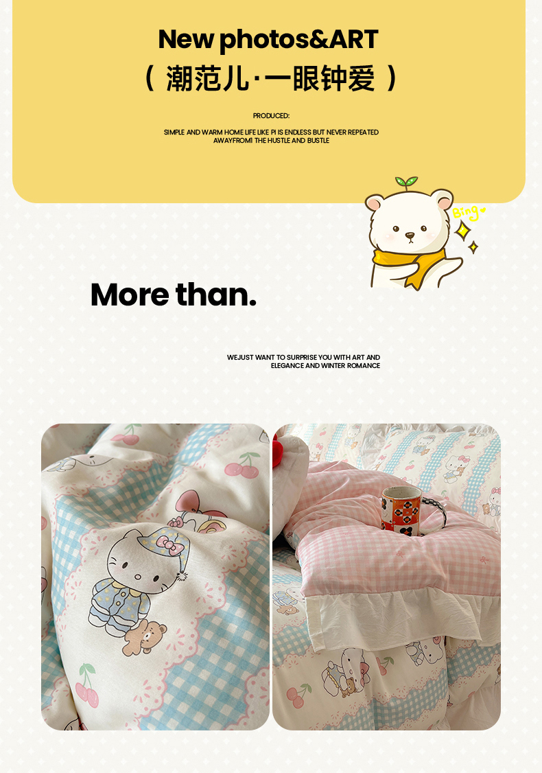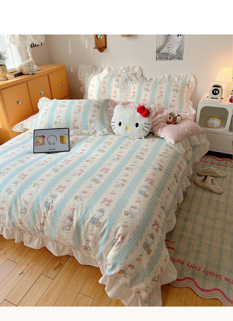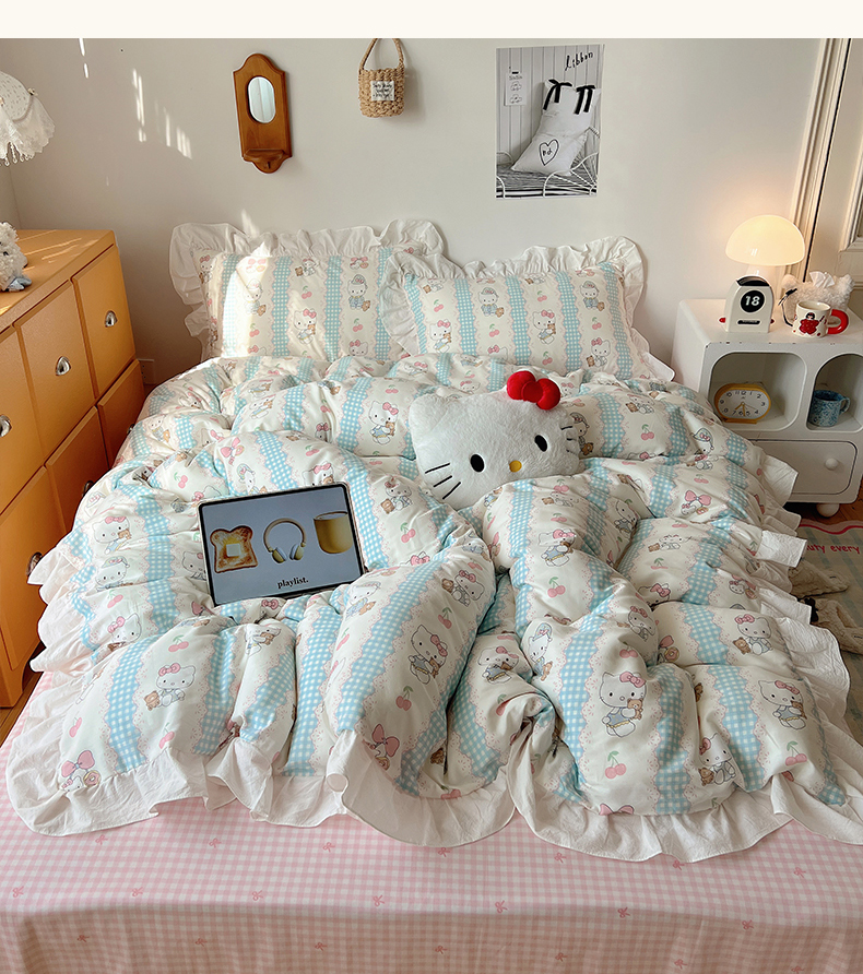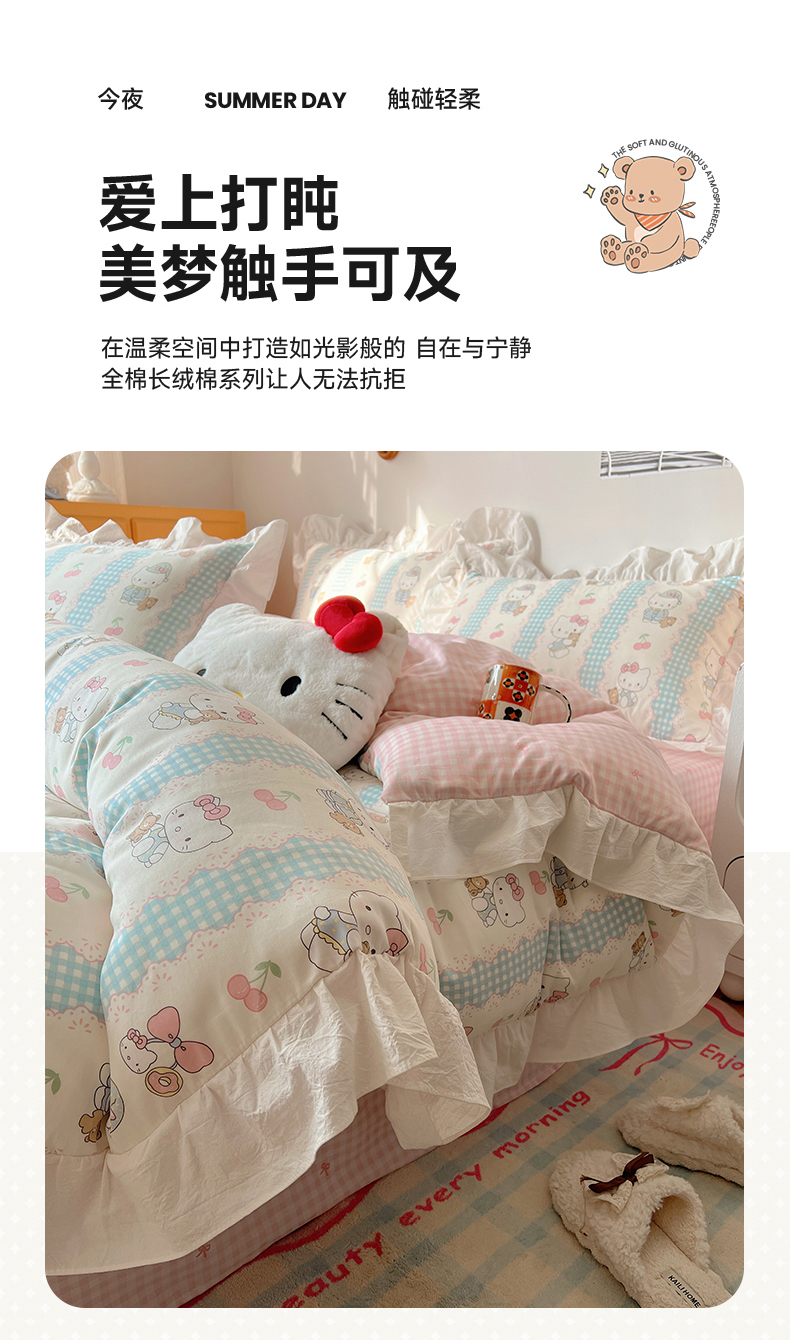 商品名称:六巷胡同 2026春夏新款韩系可爱风花边款卡通全棉四件套(第一系列) 花边萝莉樱桃猫