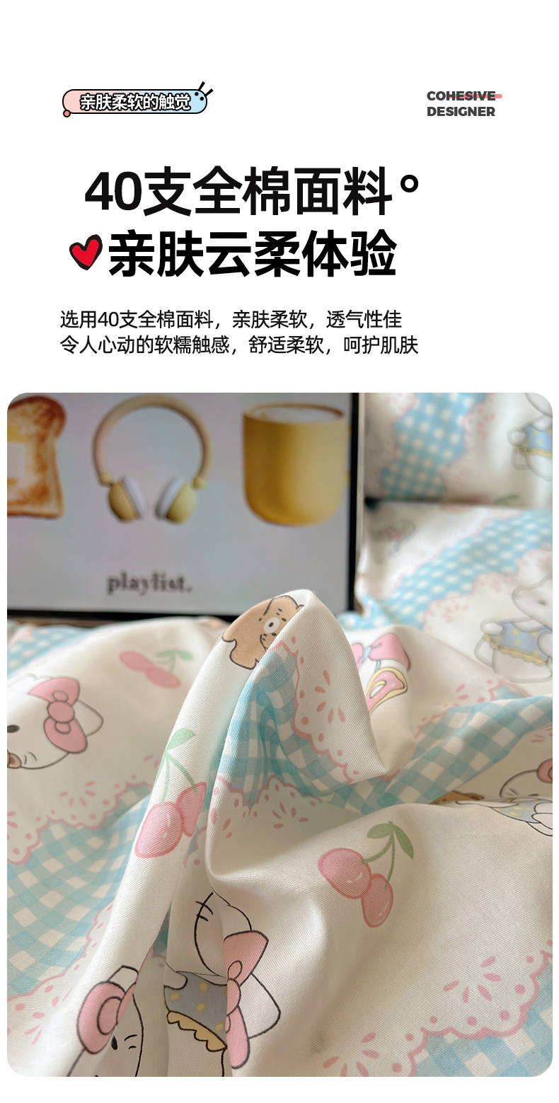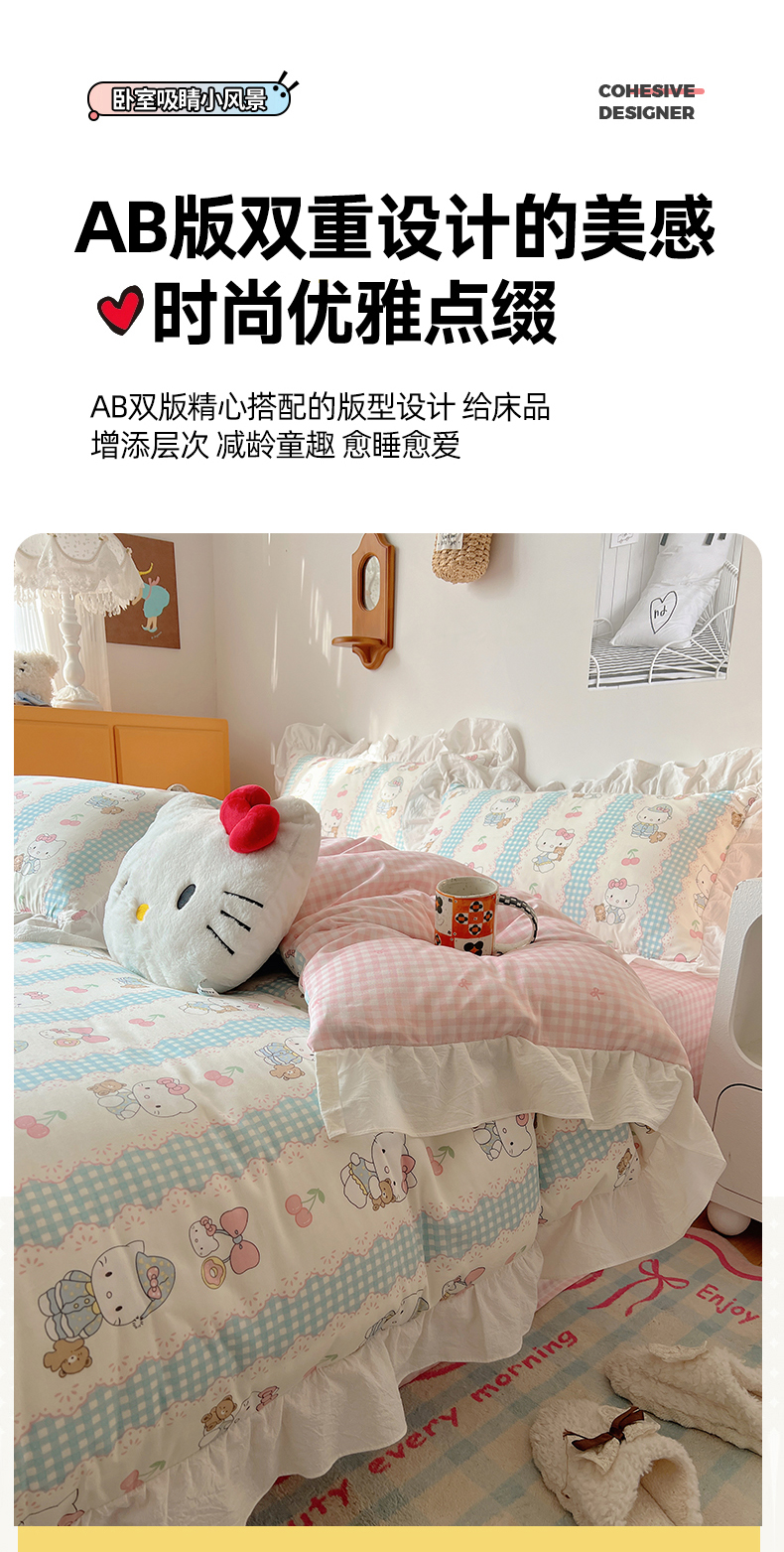 六巷胡同 2026春夏新款韩系可爱风花边款卡通全棉四件套(第一系列) 花边萝莉樱桃猫