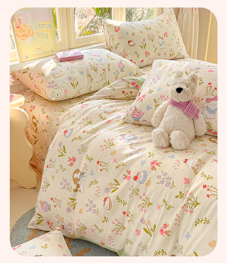 当前位置: 91家纺网 > 商品网购 > 床品套件 > 四件套 > 全棉普通四件套 > 寻米 2026春夏新款全棉13070印花四件套单品系列场景二-四件套 花园小狗