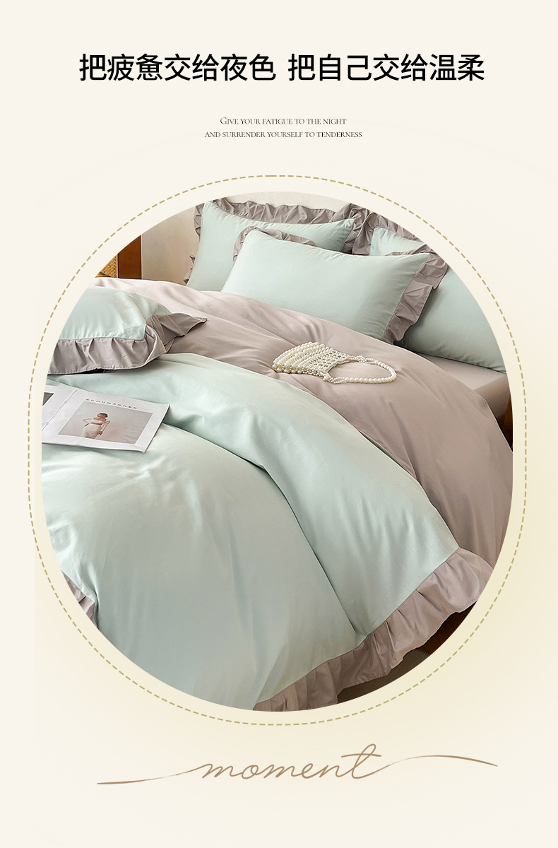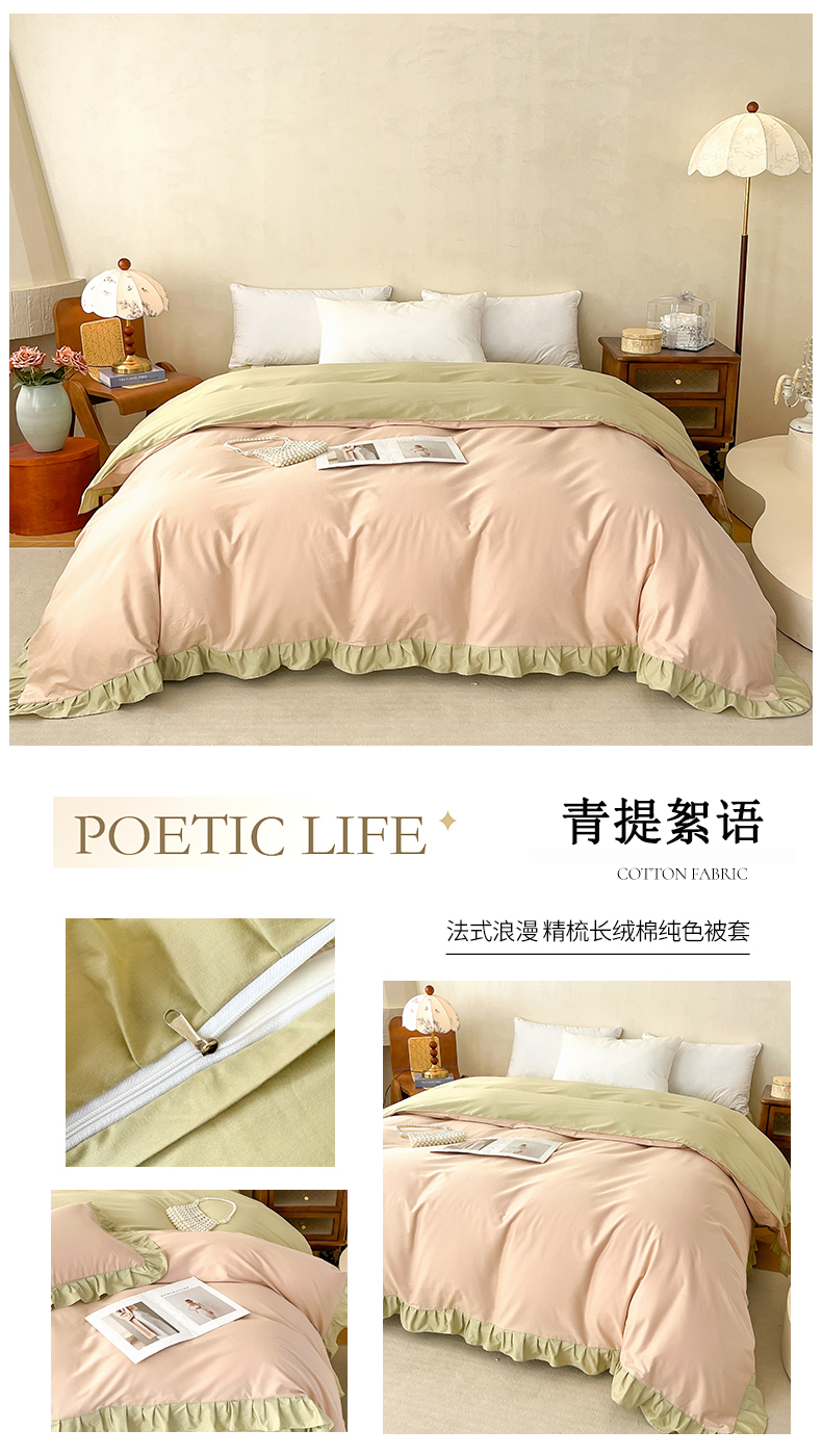 • 91家纺网 家纺一手货源 找家纺 艾迪尚家纺 2026法式韩版荷叶边纯色长绒棉纯棉单被套 云白芽绿