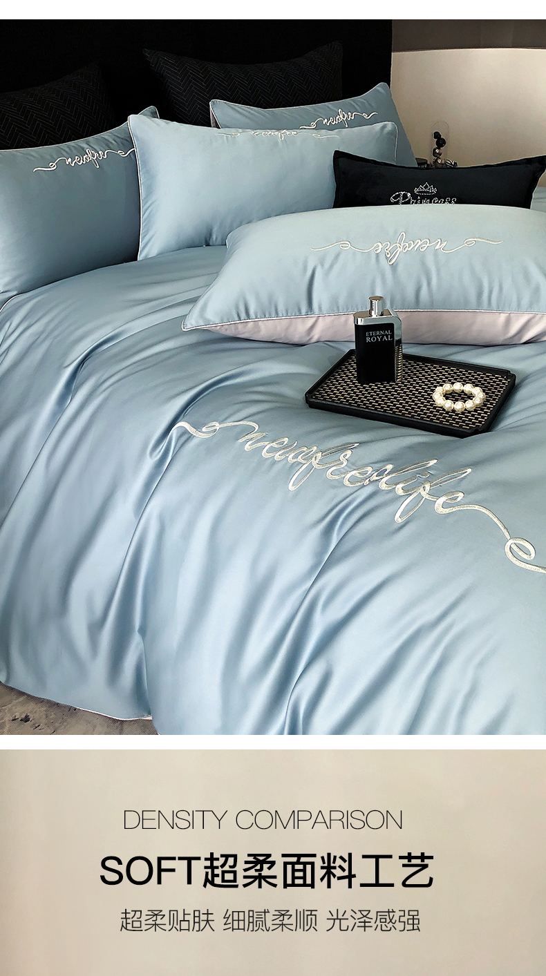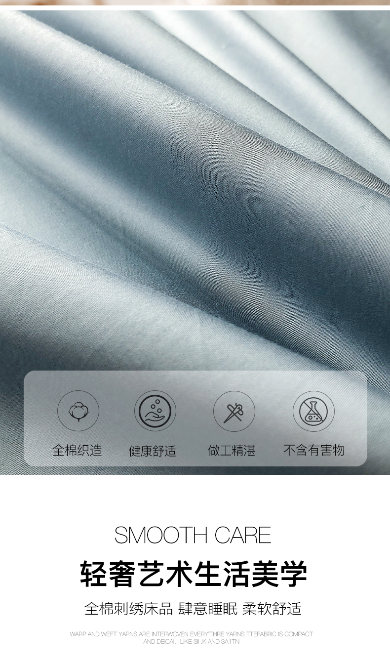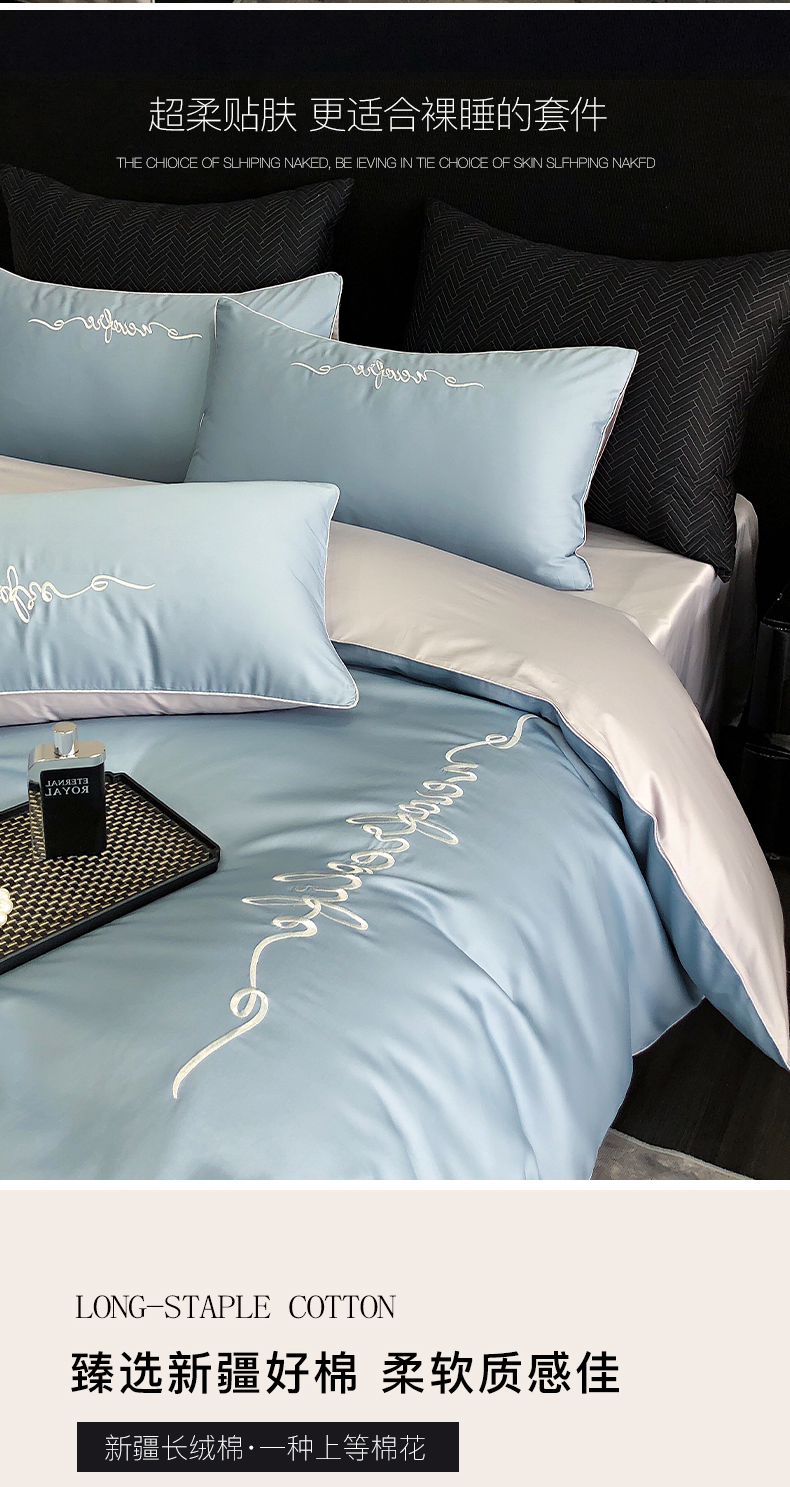 商品名称:禧澜庭 2026新款高支纯棉全棉斜纹四件套刺绣绣花款轻奢三件套--卡罗系列 魅力蓝+浅灰