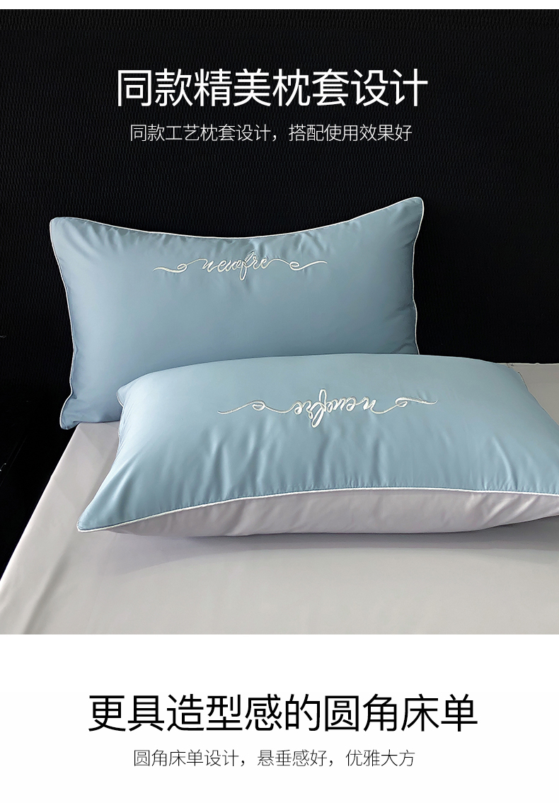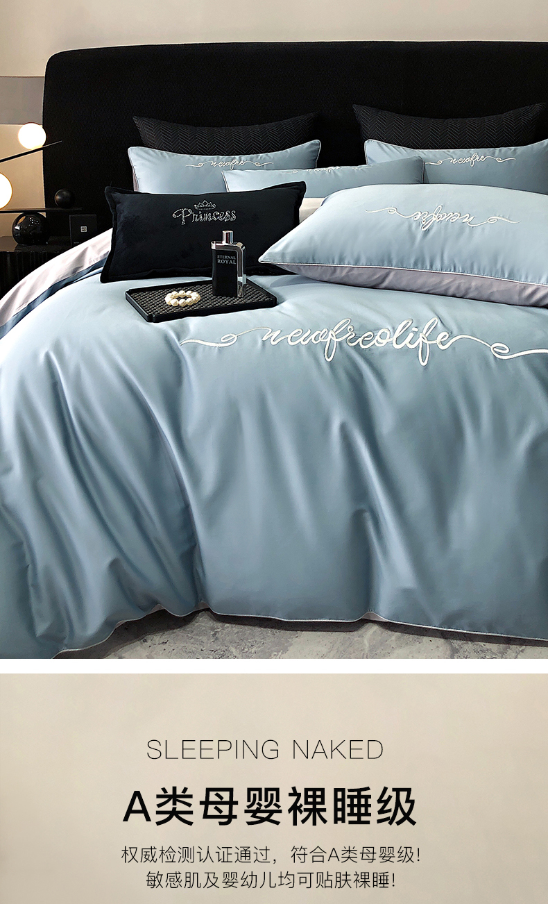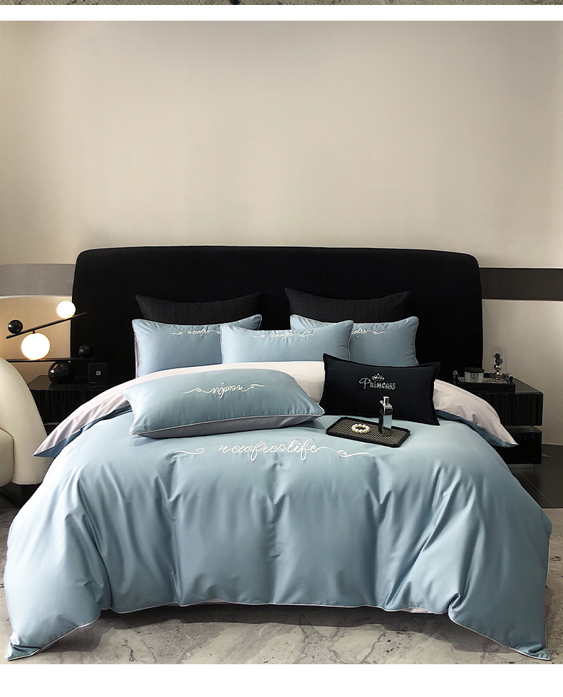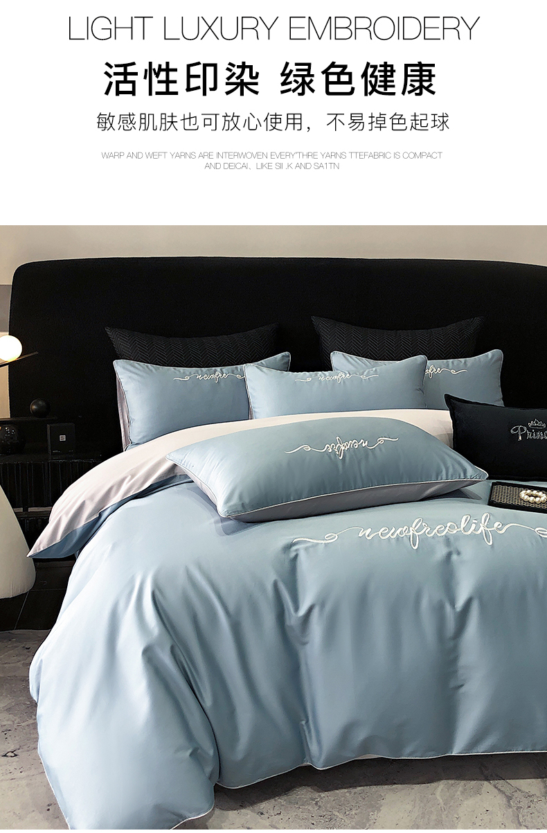 商品名称:禧澜庭 2026新款高支纯棉全棉斜纹四件套刺绣绣花款轻奢三件套--卡罗系列 魅力蓝+浅灰