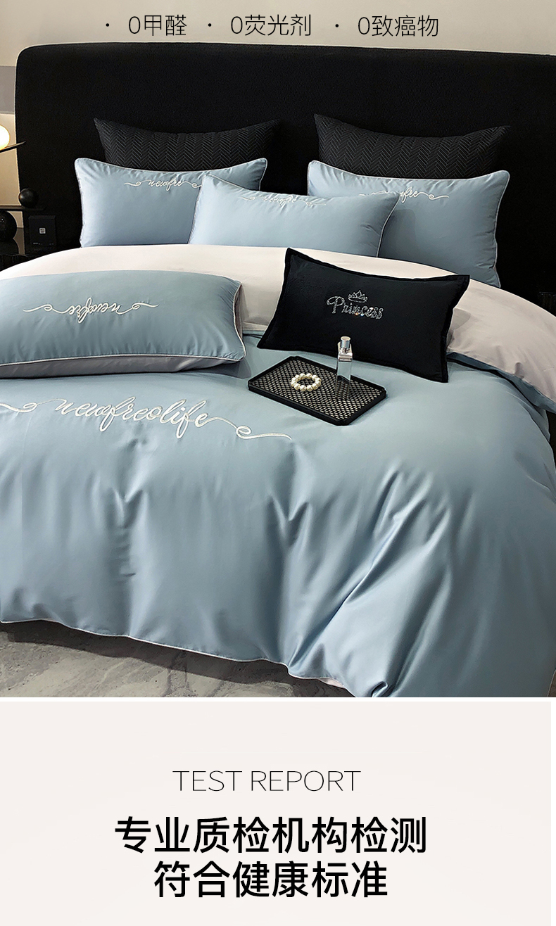 禧澜庭 2026新款高支纯棉全棉斜纹四件套刺绣绣花款轻奢三件套--卡罗系列 魅力蓝+浅灰