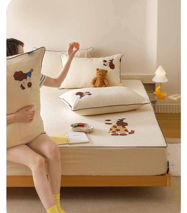 商品名称:卡姿家纺 2026春夏全棉双层纱床盖式床笠三件套 小狗喜乐