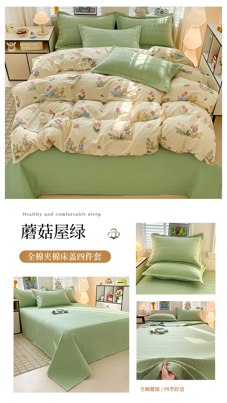 商品名称:梦精灵家纺 2026新款纯棉床盖四件套全棉绗缝夹棉防滑床单四季通用榻榻米单人学生宿舍 春日花园ABC绿