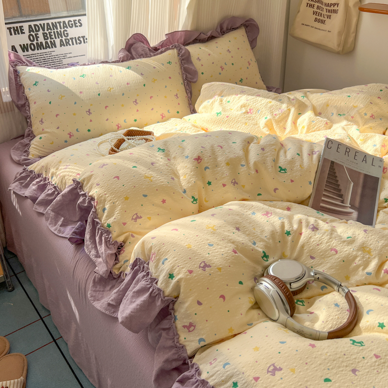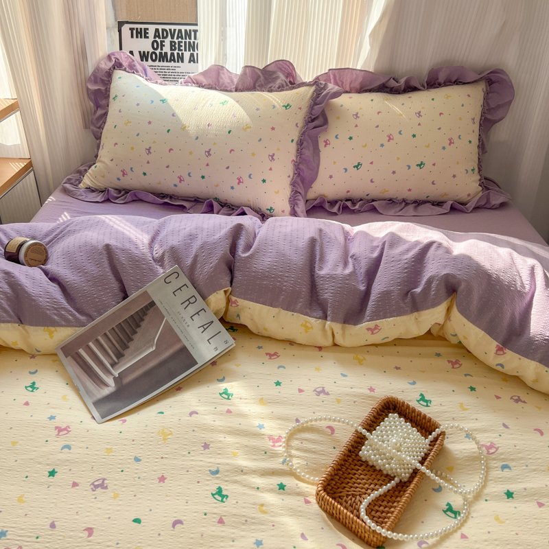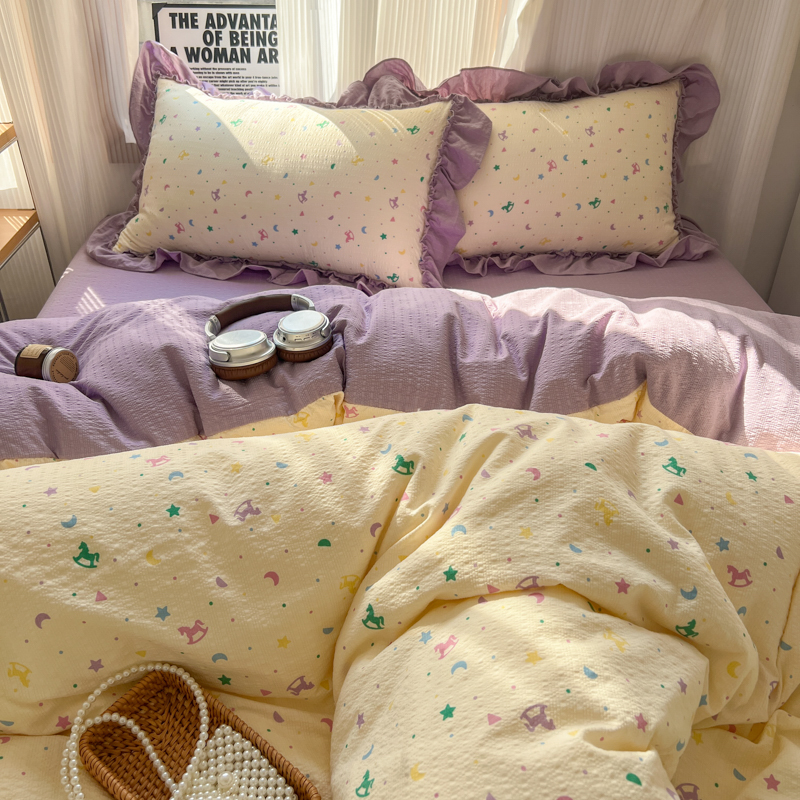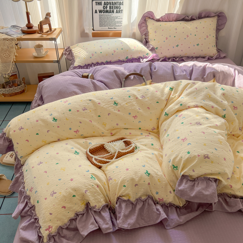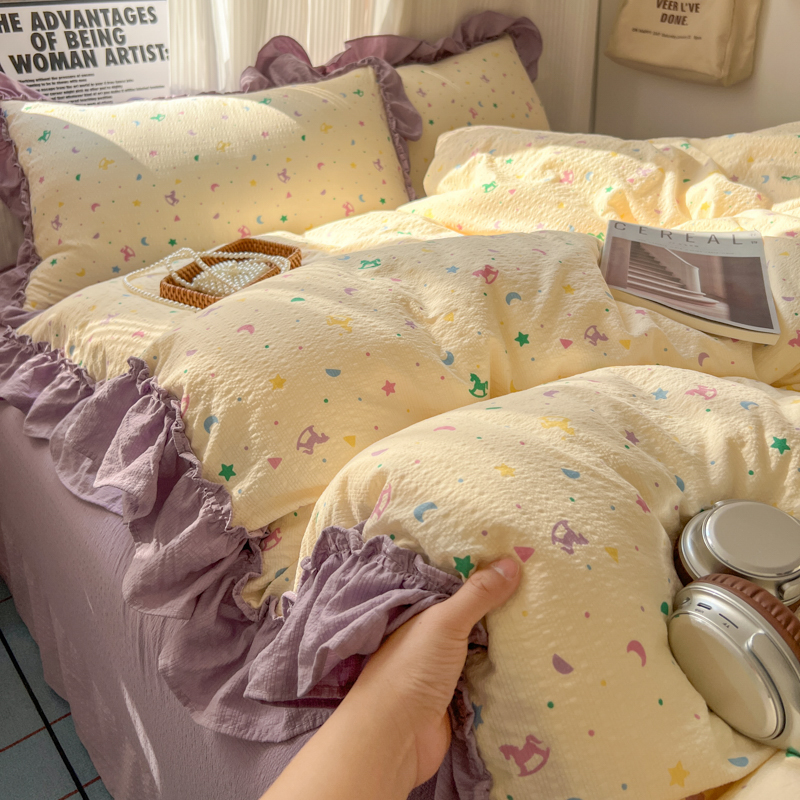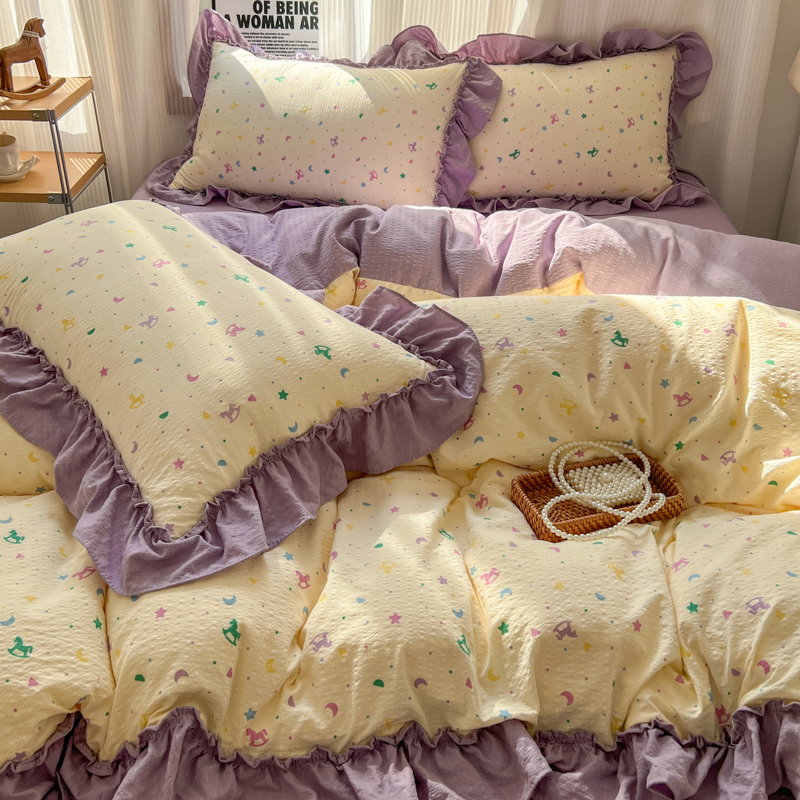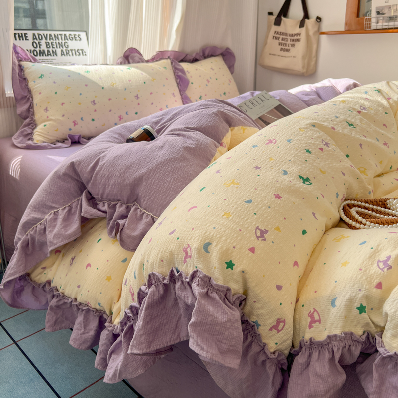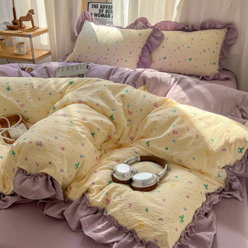 当前位置: 91家纺网 > 商品网购 > 床品套件 > 四件套 > 化纤活性四件套 > 2026新款泡芙纱花边四件套 木马