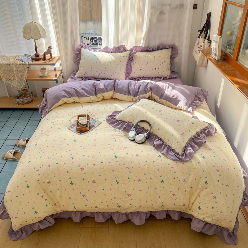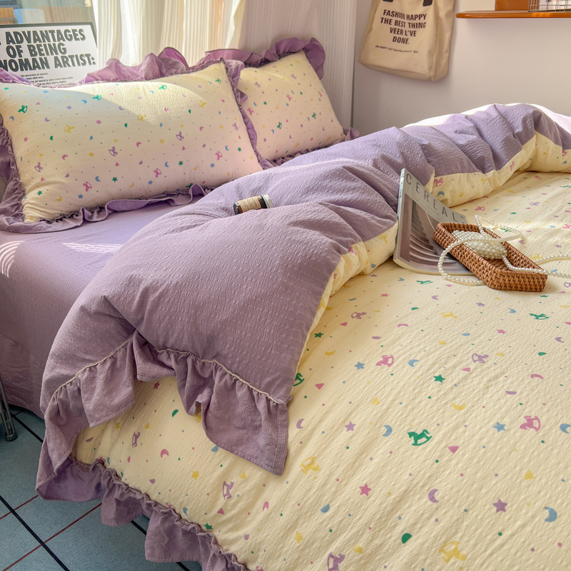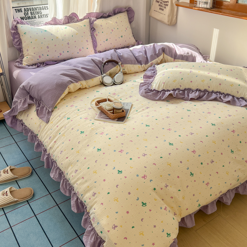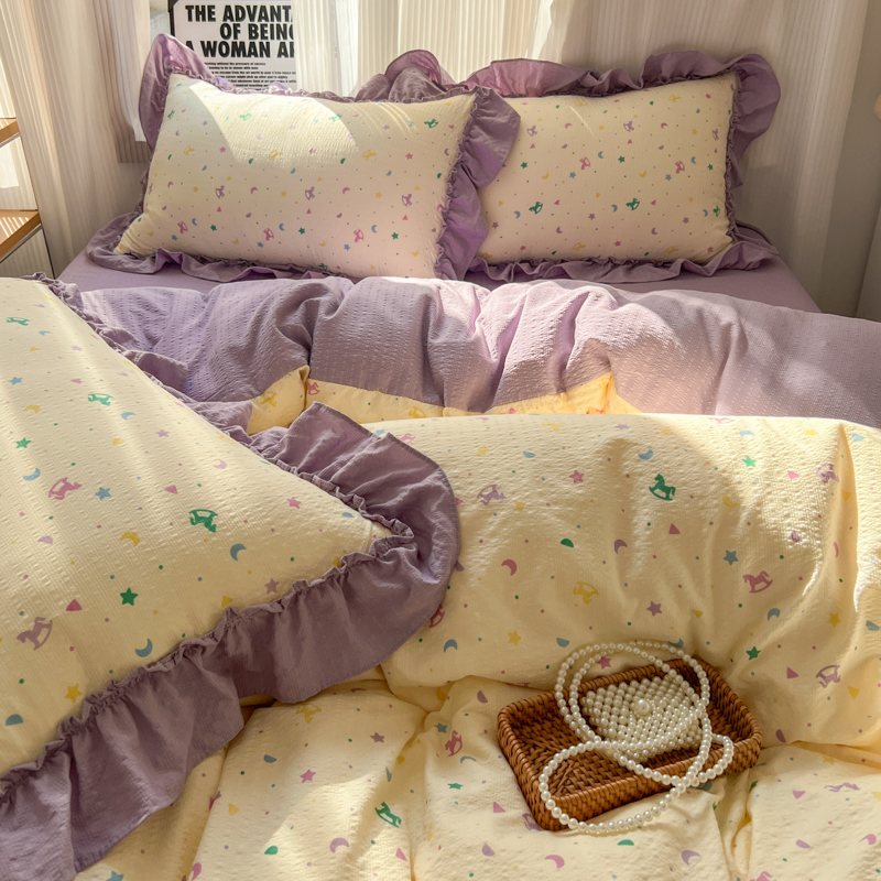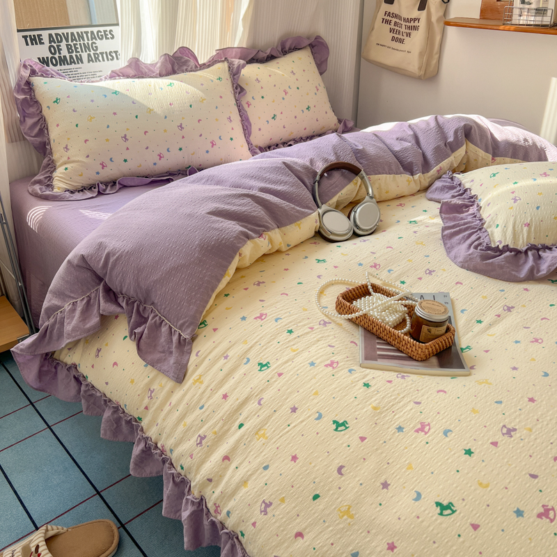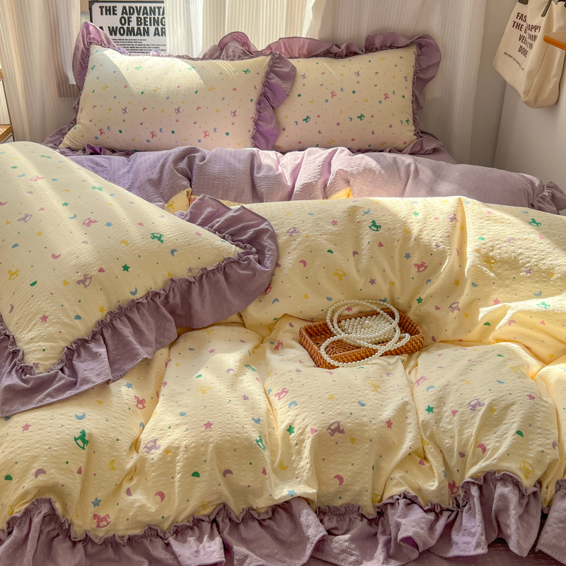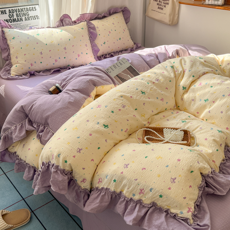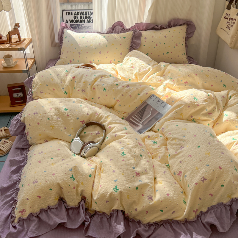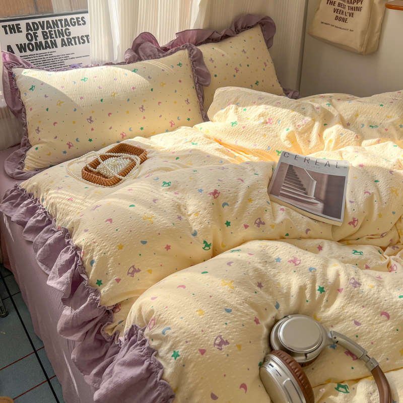 当前位置: 91家纺网 > 商品网购 > 床品套件 > 四件套 > 化纤活性四件套 > 2026新款泡芙纱花边四件套 木马