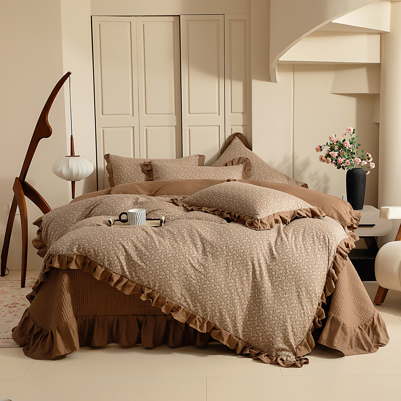 当前位置: 91家纺网 > 商品网购 > 床品套件 > 四件套 > 全棉普通四件套 > 情煊家纺 2026新款全棉双层纱花边款绣花款四件套 花边款-茶香