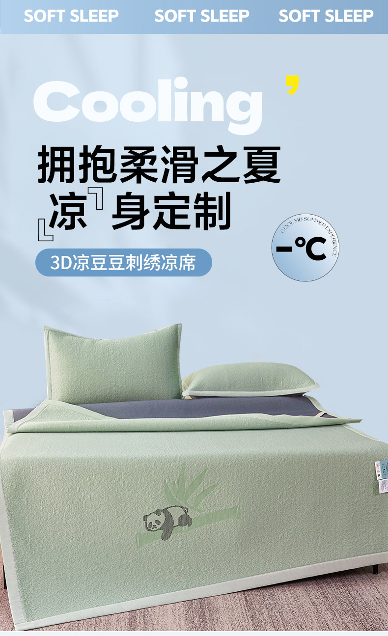 商品名称:梵克保罗 2026春夏新款A类3D凉感冰豆豆席刺绣席子凉席三件套-平铺款熊猫抱竹 平铺款-熊猫抱竹粉