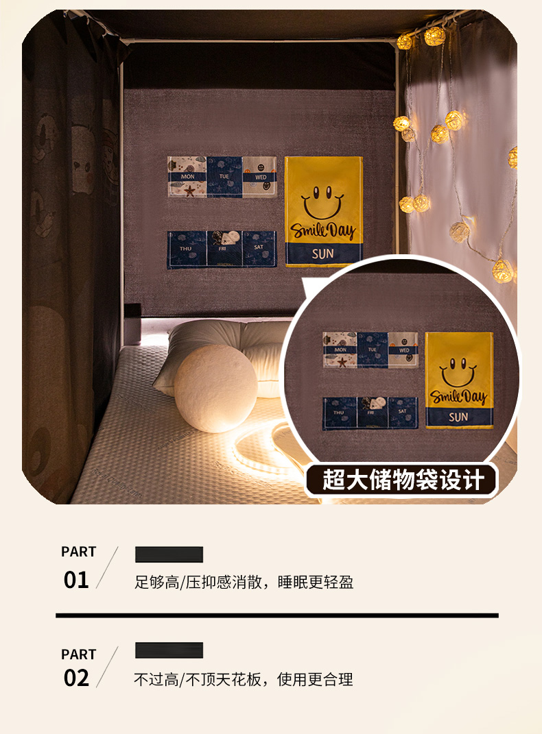 90上铺(不带靠墙帘):90宽x190长x110高(免安装)一秒打开 | ¥105.00 |